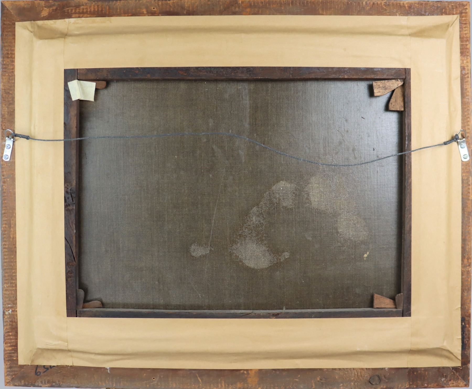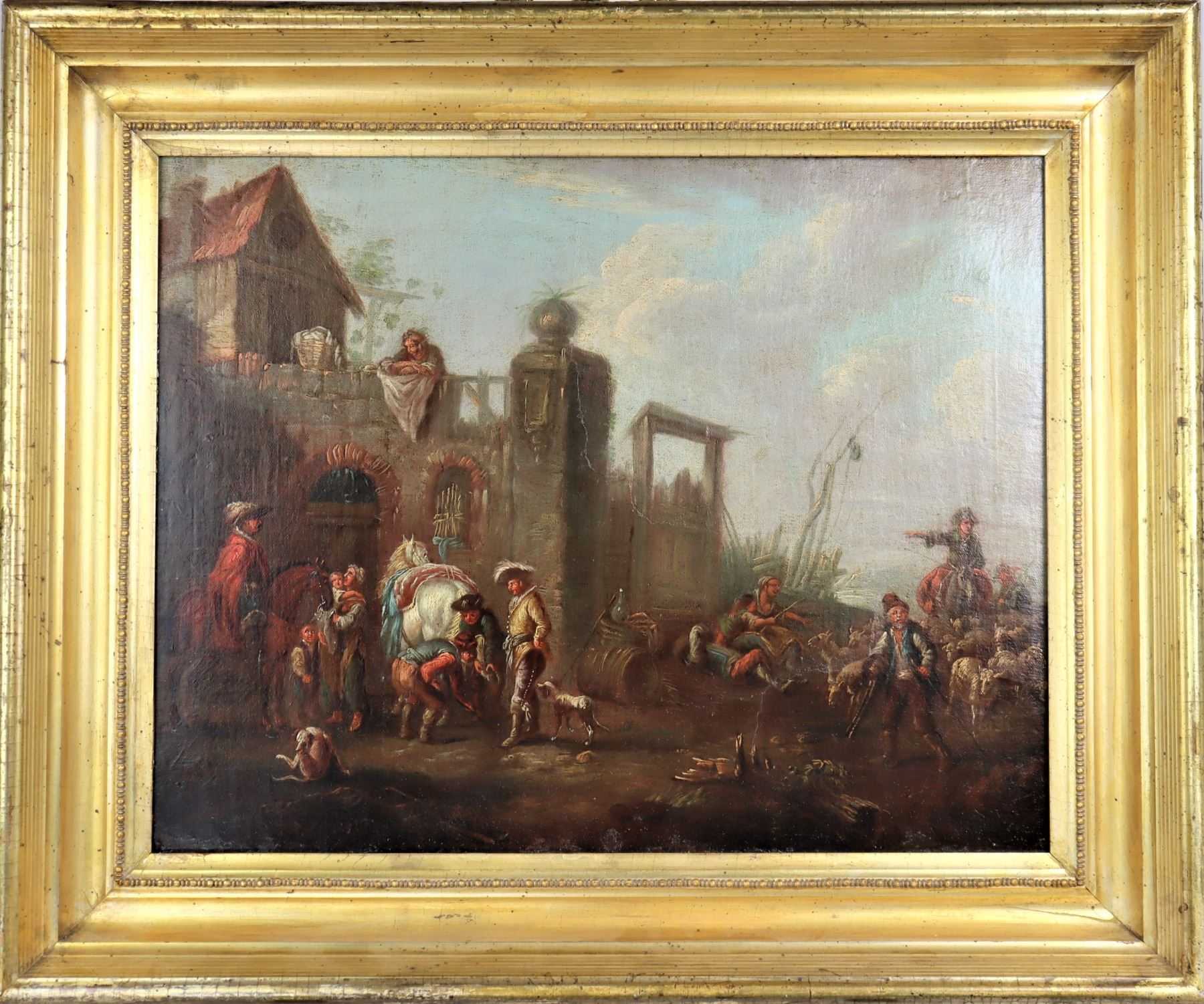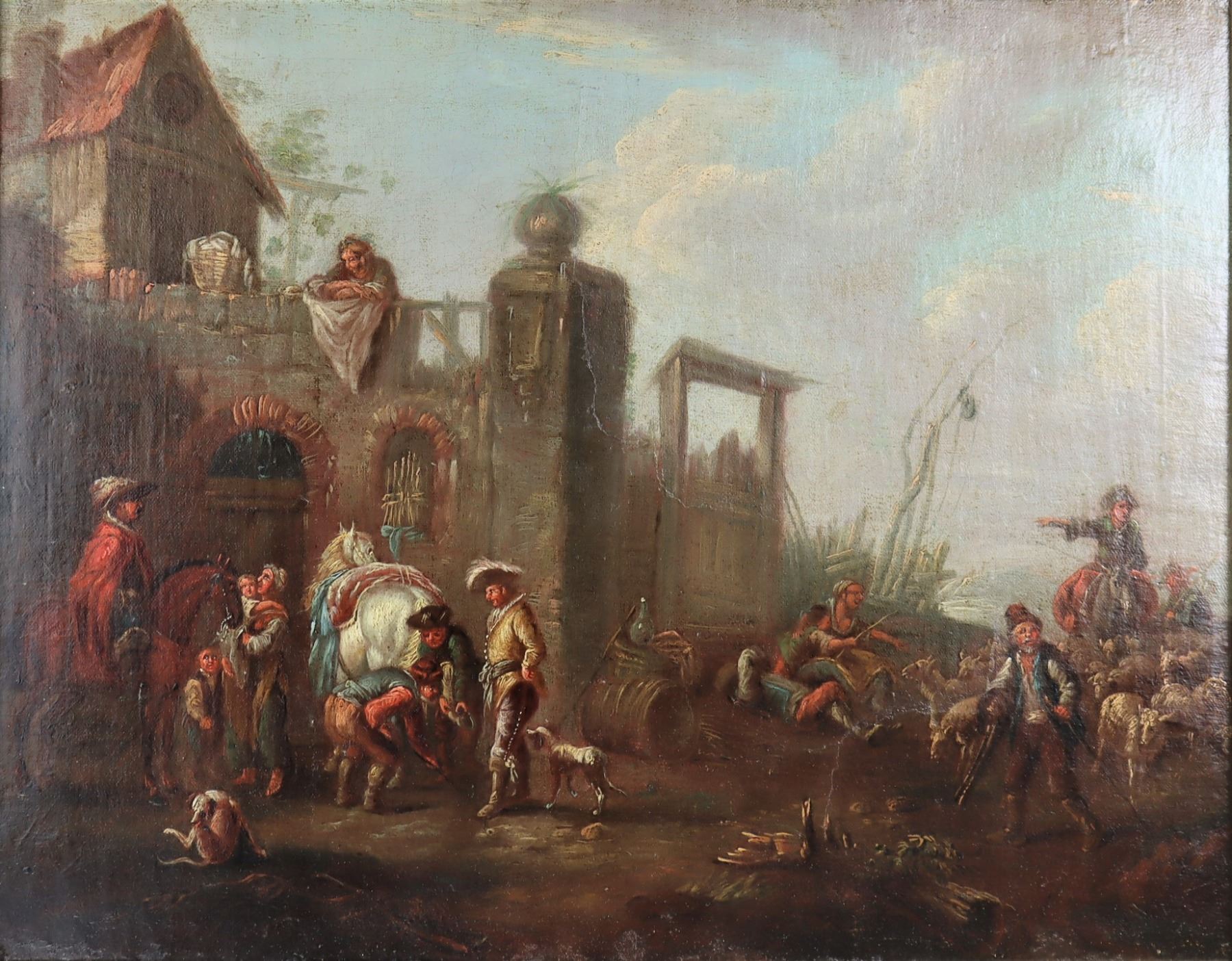 Masterful oil painting of an outdoor scene in which a group of noblemen have stopped at a wayside inn to have their horse's shoe checked. Several charming vignettes include a washerwoman laying out laundry, dogs scratching around, beggars begging, and a shepherd overseeing the flock. Painting appears to be unsigned, has been relined, in restored condition.