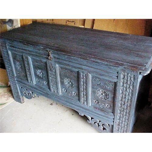 Fantastic, carved heavy single board oak coffer in matrimonial testament style with two sets of initials, a heart, a cross, an anchor, flowers and the date 1745 in the center panel!! Rubbed medium blue wash over original heavily oxiized dark wood, only a four inch missing piece of ornamental support (lower right, front) keep this piece from being entirely complete and original...EXTREMELY HEAVY, museum quality, made with love for lovers and made to last, possibly forever...Thanks for looking, Chas.