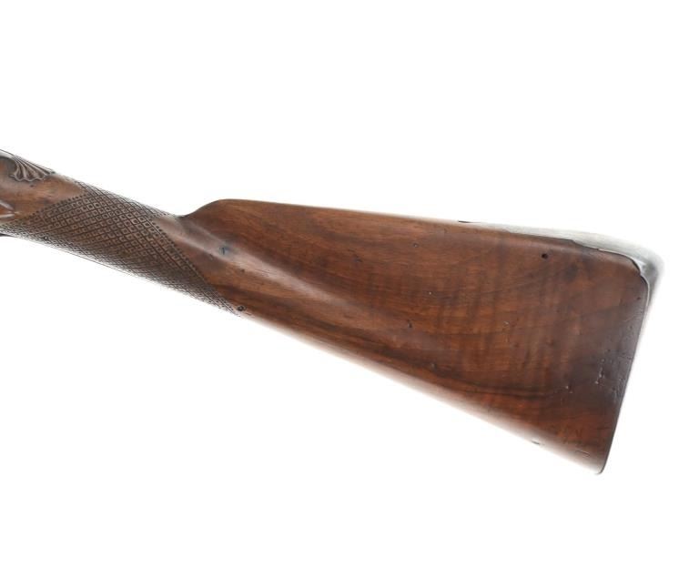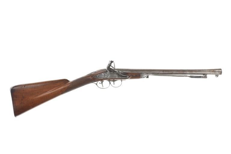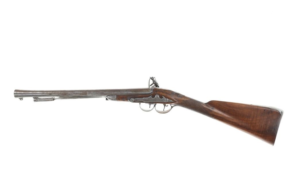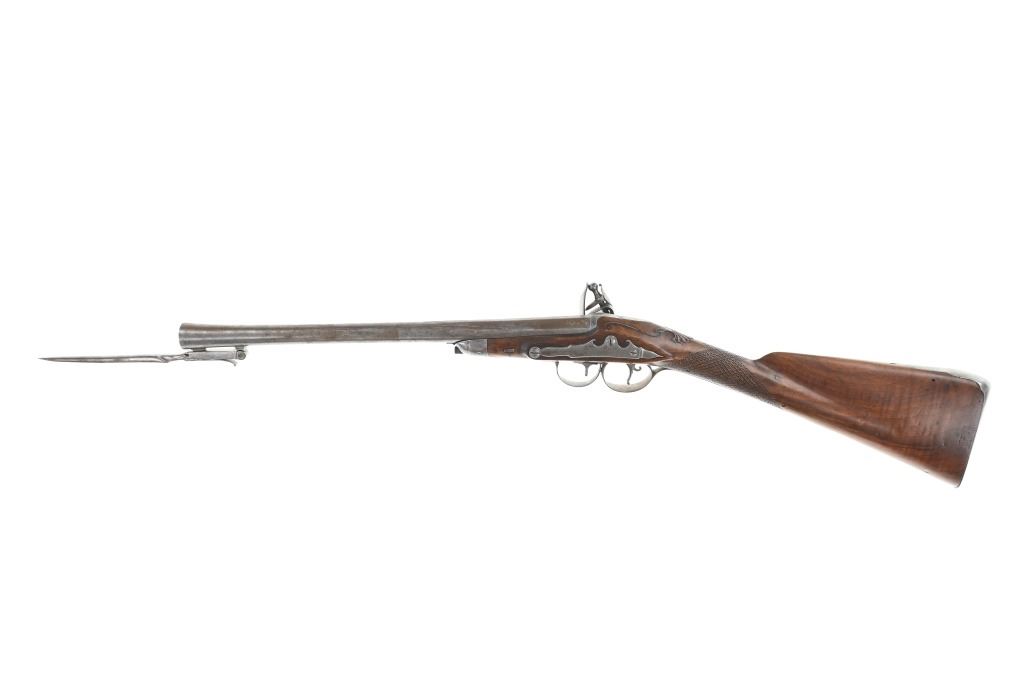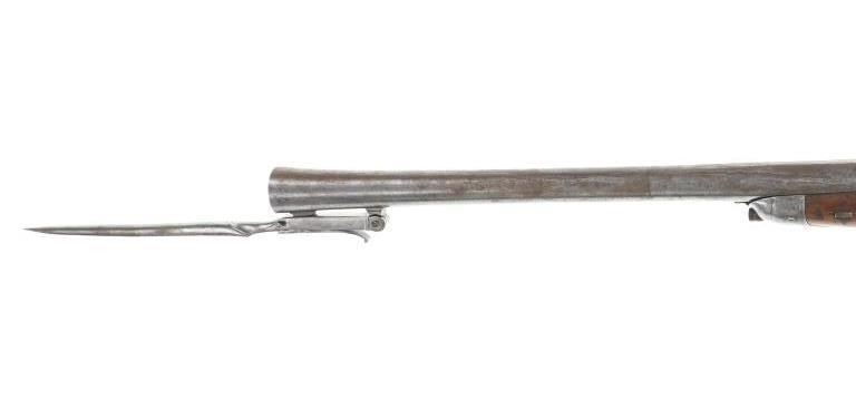 Featured in this lot is a British engraved flintlock blunderbuss with spring swing out bayonet. This fine engraved blunderbuss originates from the late 18th century with its popularity hitting its peak between 1770 and 1800. The barrel displays four British proof marks with the left side displaying the royal cypher Crown over G R, for King George II, and the Birmingham proof of a Crown over Crossed Scepters. The right side of the barrel displays the London Crown over P and Crown over V proofs. The proof marks date the blunderbuss to the late 1700s. This blunderbuss displays a rare steel barrel with a trigger released bayonet attached to the underside of the barrel rather than the standard top of the barrel. The lockplate trigger guard and other metal accents display fine tooled engravings with the lock plate and flintlock system showing fine craftsmanship and hammer locking system found on higher quality pieces. The wood stock shows a wonderfully smooth carved design with a carved floral design across the top by the barrel and carved geometric grip pattern with a "LS" stamped lettering below the tang and thin ram rod below the barrel. This blunderbuss shows wonderful condition for its age showing a warm patina and some expected wear. The piece weighs 4lbs 2oz. This firearm qualifies as an Antique, and does not require FFL Transfer or NICS Background Check.*