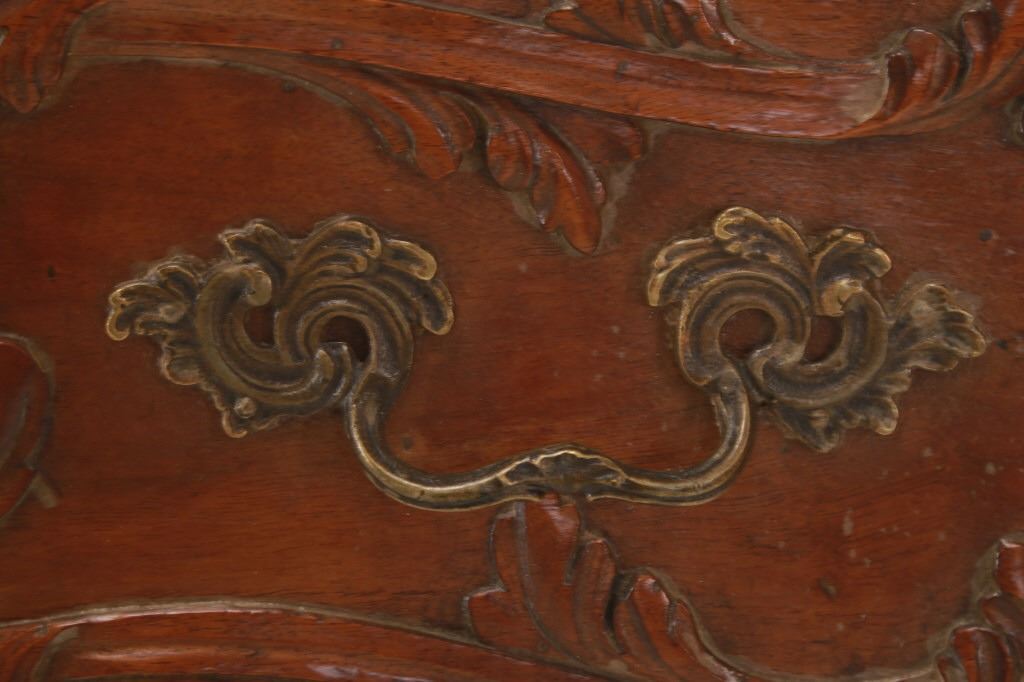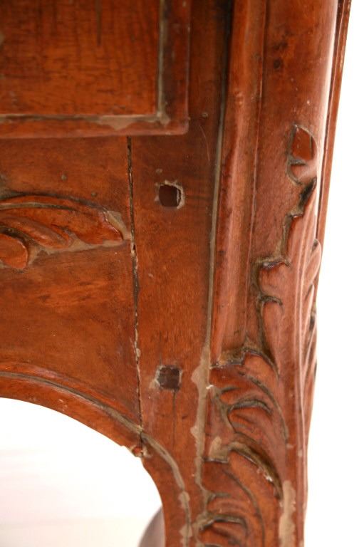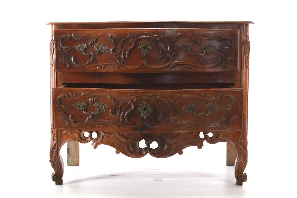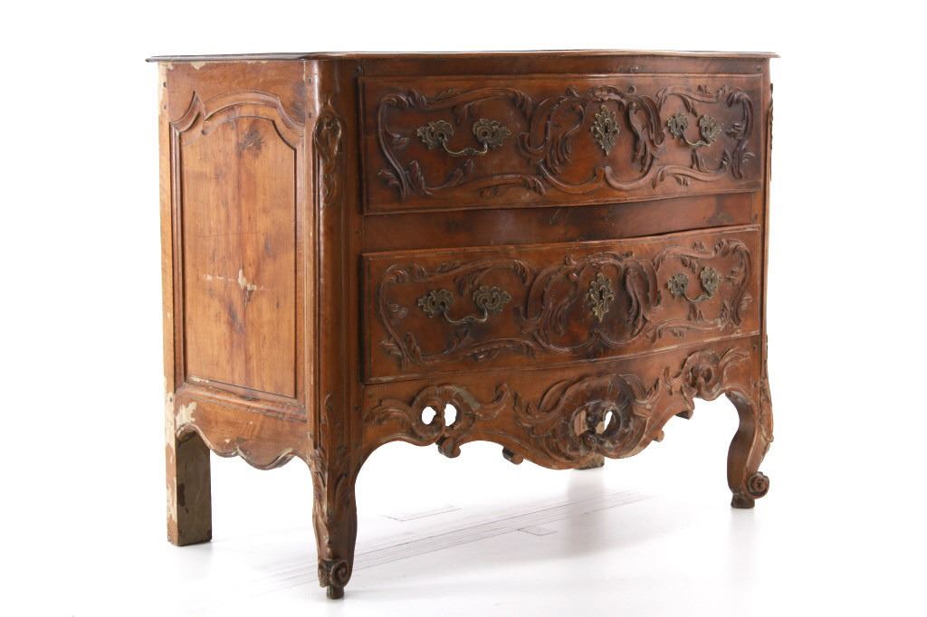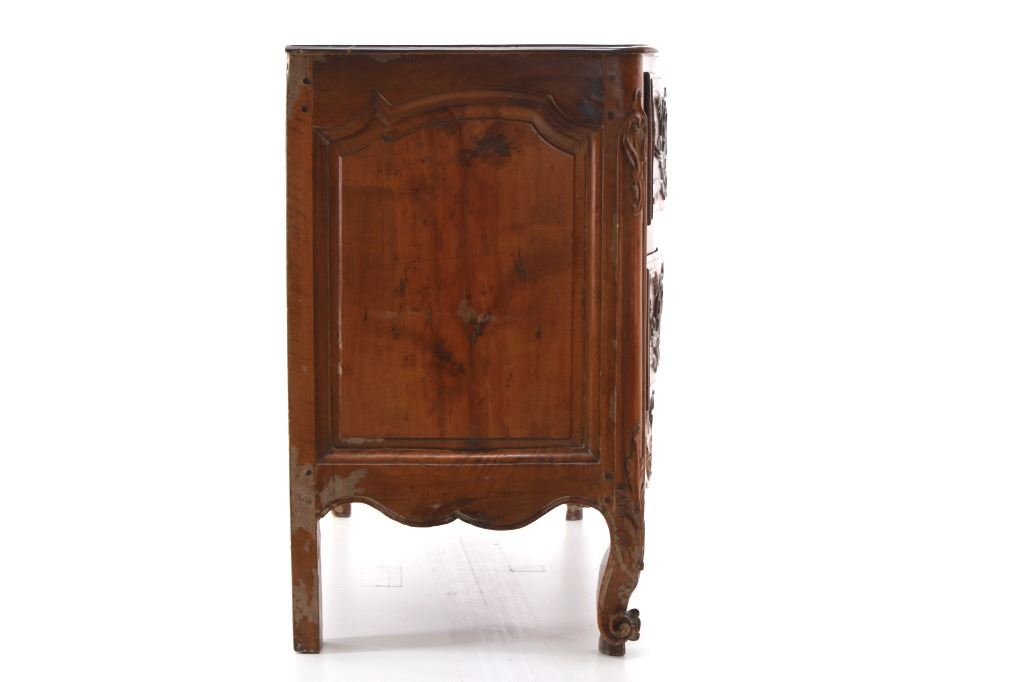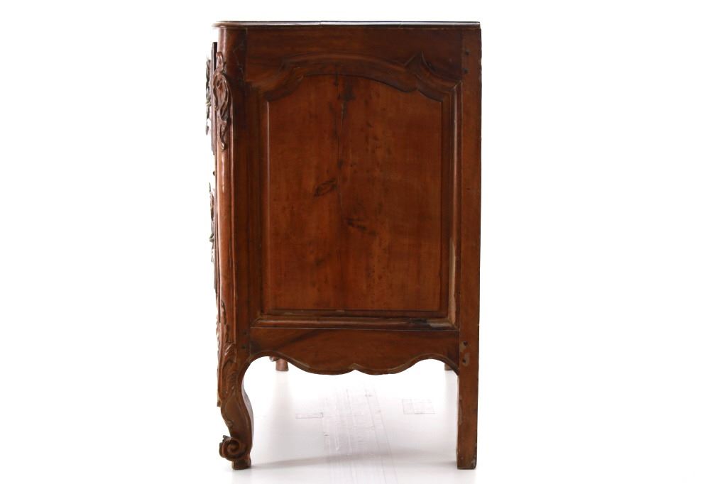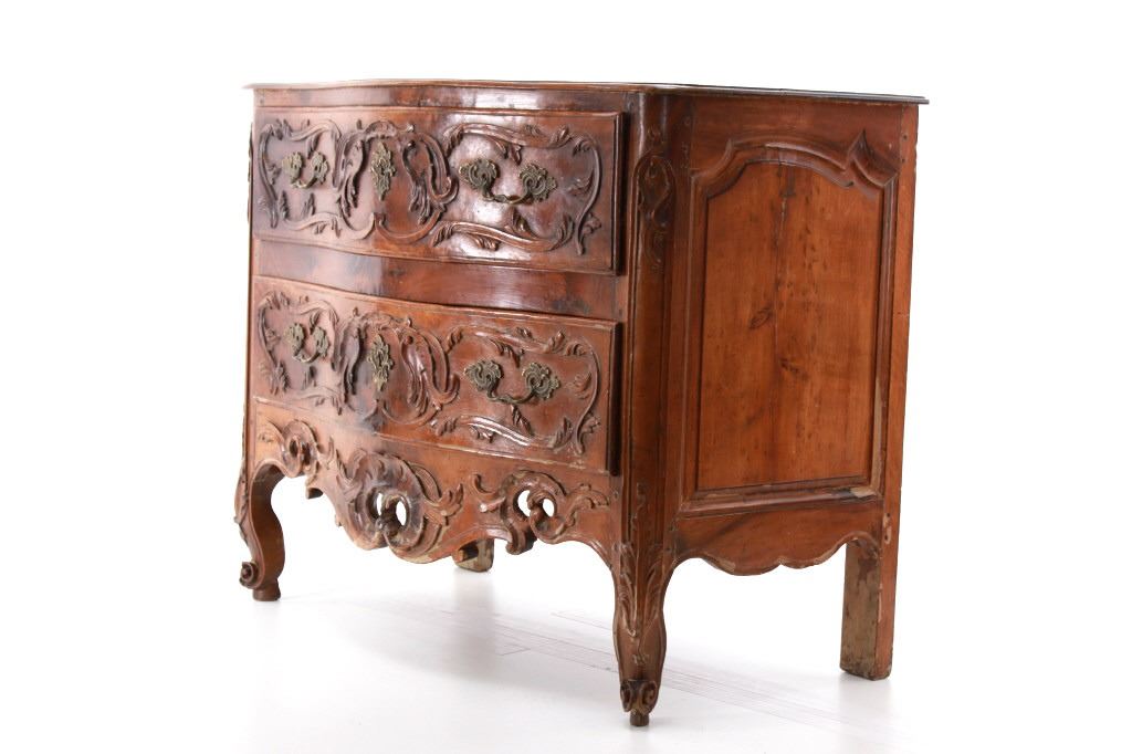 For your consideration is a Rare Late 18th Century French Provincial Louis XV Walnut Bombe Shaped Commode. Louis XV style is the epitome of French furniture at its finest. The eighteenth century is considered the Golden age of French furniture. It was during this time that the most refined and beautiful Royal furniture was made in the busy Paris workshops of Europe's elite cabinet makers. Rococo motifs are central to Louis XV furniture design. These include C-scrolls, S-scrolls, acanthus leaves, rocaille (shell-like) patterns, and pastoral scenes. These elements were used to create a sense of movement and natural beauty, often giving the furniture a light, almost whimsical appearance. The commode, a low chest of drawers, was a key furniture piece during this period. Louis XV commodes typically had bombe (curved) fronts and sides. Typical of Provence, Arles region, commode stands on cabriole legs decorated with acanthus leaves at the shoulder, and ending with escargot feet. Two-board serpentine top and front, two drawers having extensive, fine carving over an elaborate carved and shaped acanthus leaves skirt apron with pierced cartouche, hand-cast detailed brass drawer pulls and matching escutcheons hardware. Excellent quality with superb craftsmanship, the commode is in wonderfully preserved condition, nice finish to two-board top, nicely finished throughout, insect damage to backboards, finish loss on apron. Measures 25"D x 47.25"W x 37"H and weighs 148 pounds.