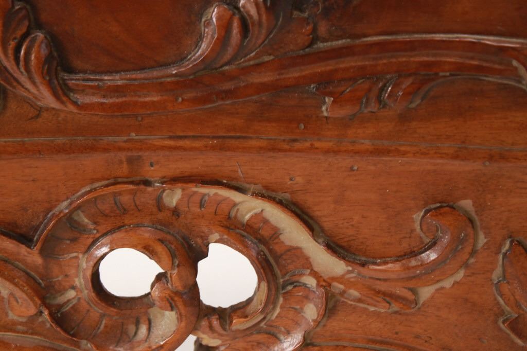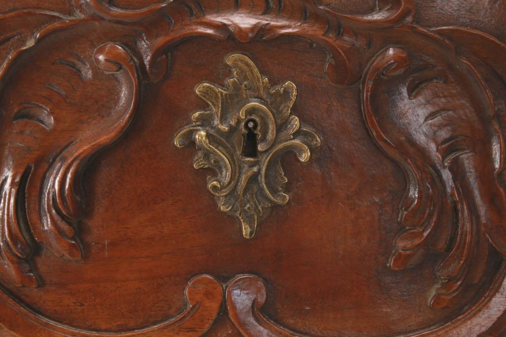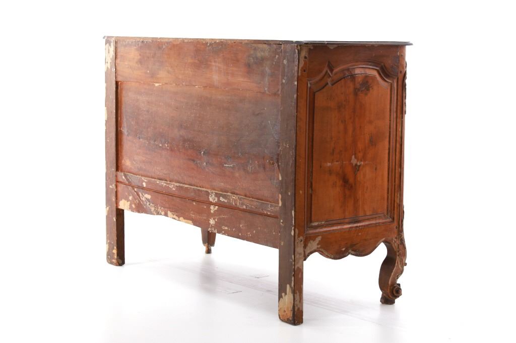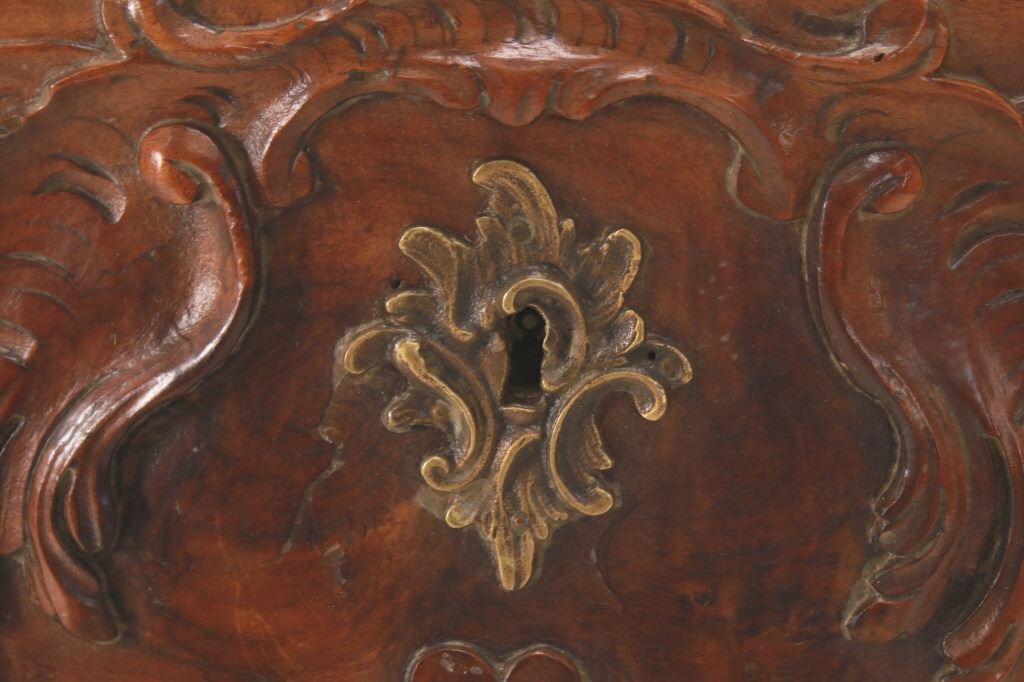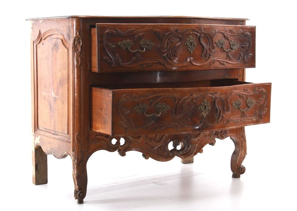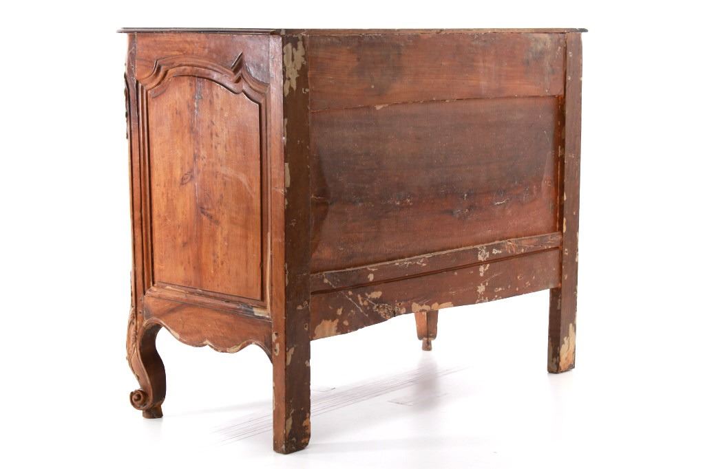 For your consideration is a Rare Late 18th Century French Provincial Louis XV Walnut Bombe Shaped Commode. Louis XV style is the epitome of French furniture at its finest. The eighteenth century is considered the Golden age of French furniture. It was during this time that the most refined and beautiful Royal furniture was made in the busy Paris workshops of Europe's elite cabinet makers. Rococo motifs are central to Louis XV furniture design. These include C-scrolls, S-scrolls, acanthus leaves, rocaille (shell-like) patterns, and pastoral scenes. These elements were used to create a sense of movement and natural beauty, often giving the furniture a light, almost whimsical appearance. The commode, a low chest of drawers, was a key furniture piece during this period. Louis XV commodes typically had bombe (curved) fronts and sides. Typical of Provence, Arles region, commode stands on cabriole legs decorated with acanthus leaves at the shoulder, and ending with escargot feet. Two-board serpentine top and front, two drawers having extensive, fine carving over an elaborate carved and shaped acanthus leaves skirt apron with pierced cartouche, hand-cast detailed brass drawer pulls and matching escutcheons hardware. Excellent quality with superb craftsmanship, the commode is in wonderfully preserved condition, nice finish to two-board top, nicely finished throughout, insect damage to backboards, finish loss on apron. Measures 25"D x 47.25"W x 37"H and weighs 148 pounds.