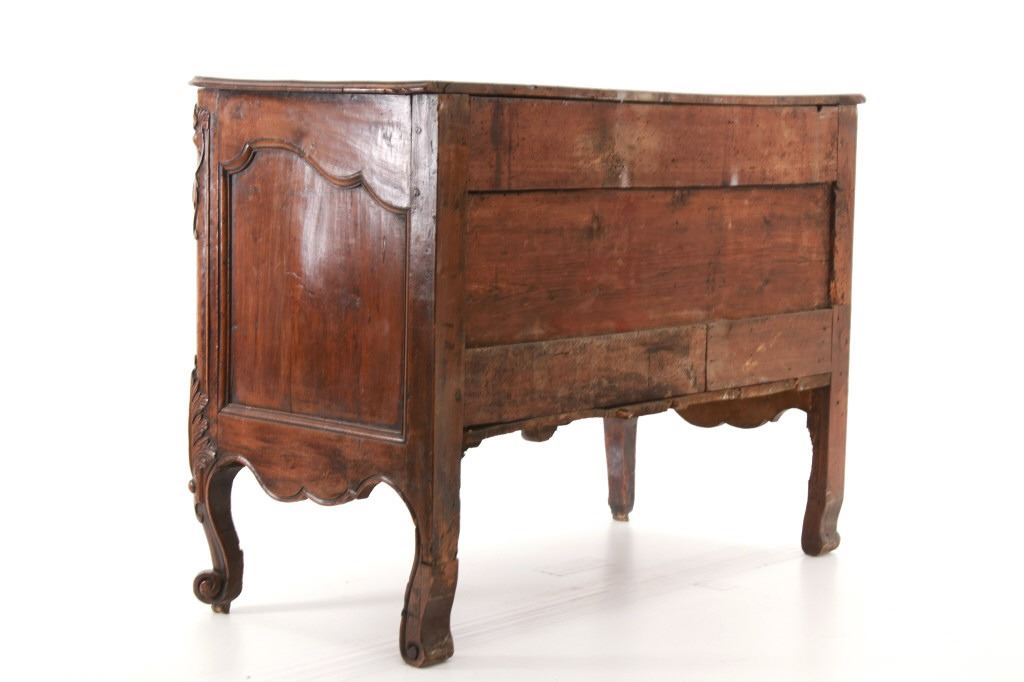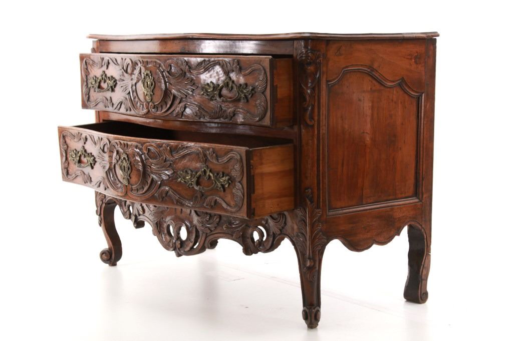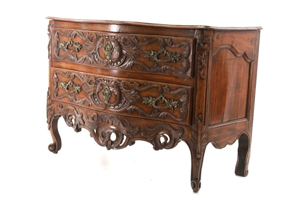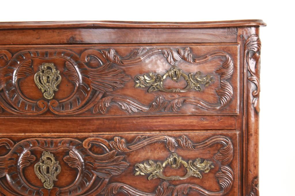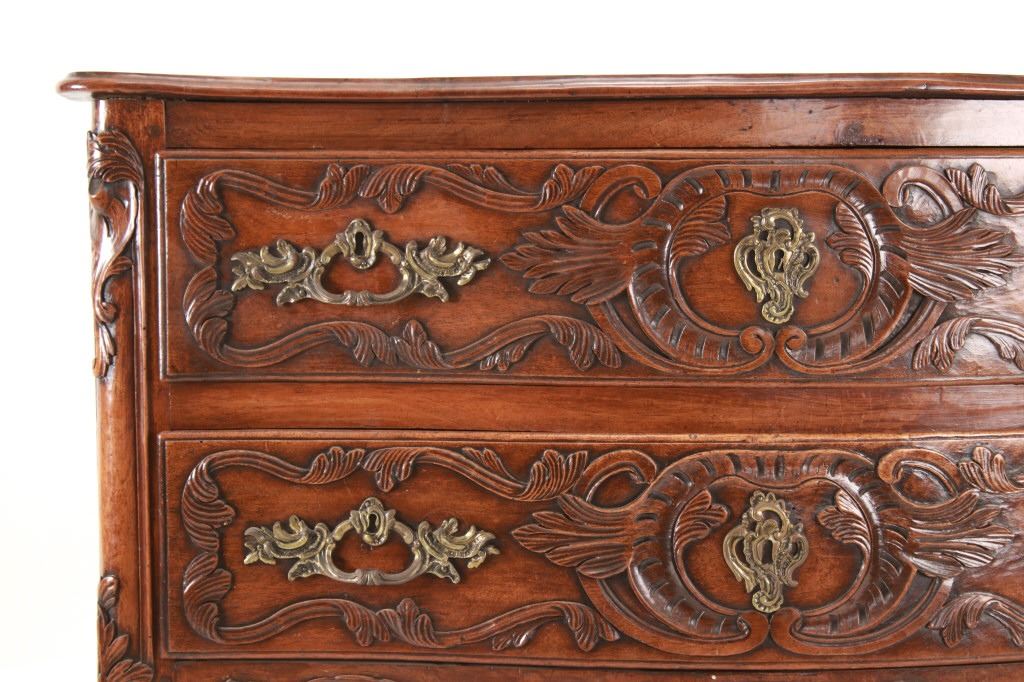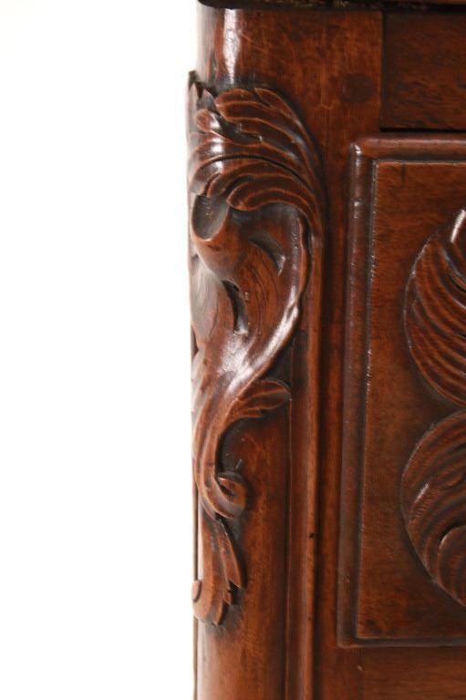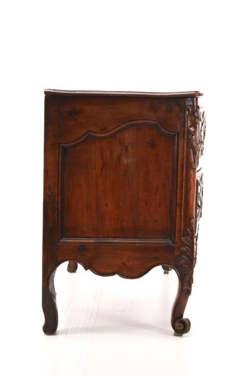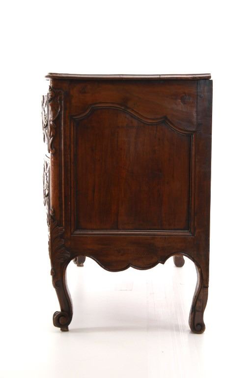 For your consideration is a Rare Late 18th Century French Provincial Louis XV Walnut Bombe Shaped Commode. The eighteenth century is considered the Golden age of French furniture. It was during this time that the most refined and beautiful Royal furniture was made in the busy Paris workshops of Europe's elite cabinet makers. Two-board serpentine top and front, two drawers having extensive, fine carving over an elaborate carved and shaped acanthus leaves skirt apron with pierced cartouche with dentil design typical of Provence, Arles region, stands on cabriole legs decorated with acanthus leaves at the shoulder ending with escargot feet, with acanthus leaves carved at the top. Scrolled Bombe side panels, two front carved Bombe molded drawers with hand-carved acanthus leaves, scalloped shaped top beveled and molded Dupont edge, hand-cast detailed drawer pulls and matching escutcheons hardware. The curved forms, lightness, grace, comfort and asymmetry of this period replaced the more formal, boxlike and massive furniture of the Louis XIV style. Excellent quality with superb craftsmanship, the commode is in wonderfully preserved condition, insect damage to backboards, some splits, scratches and minor fading to two-board top, nicely finished. Measures 24"D x 48.75"W x 34.75"H and weighs 120 pounds.