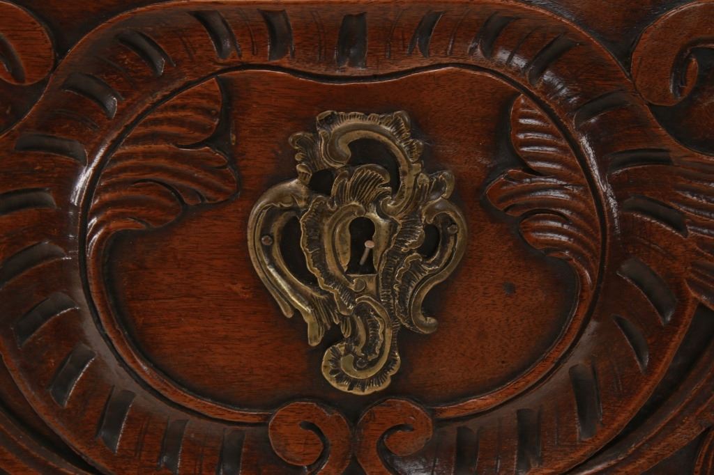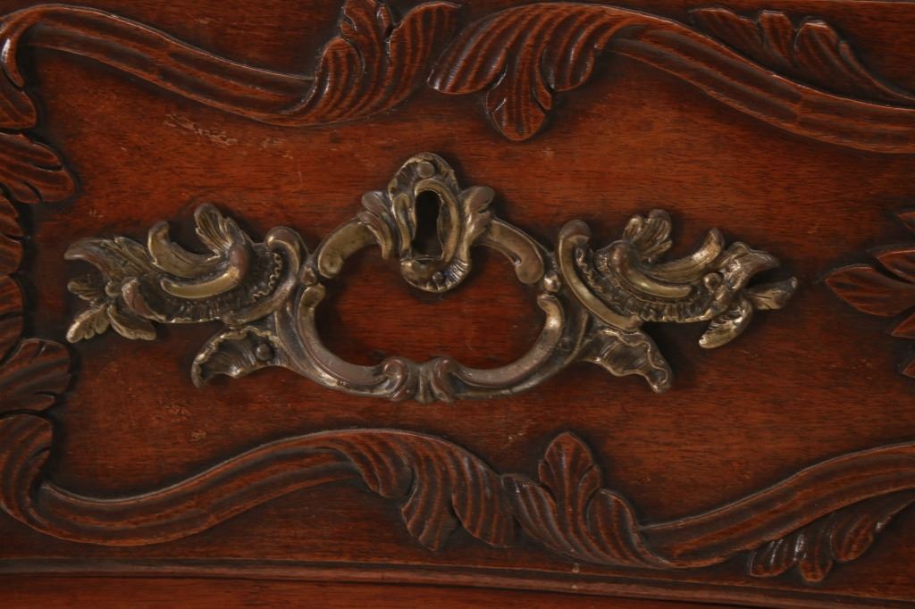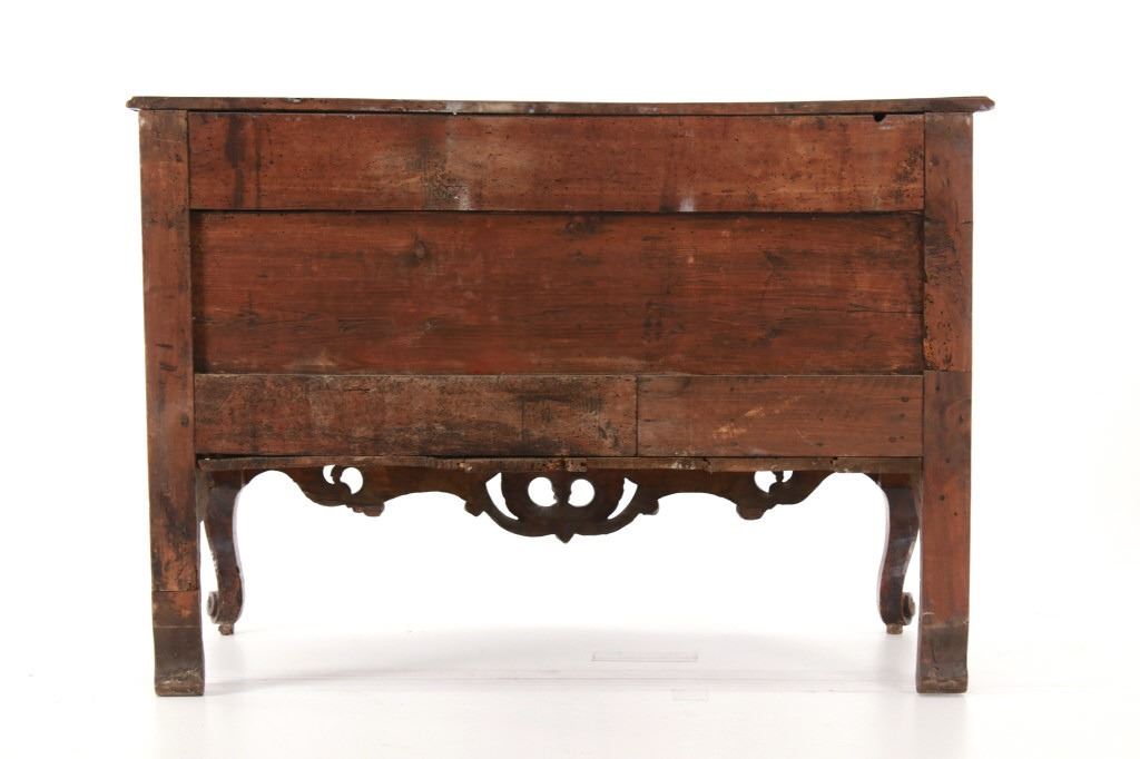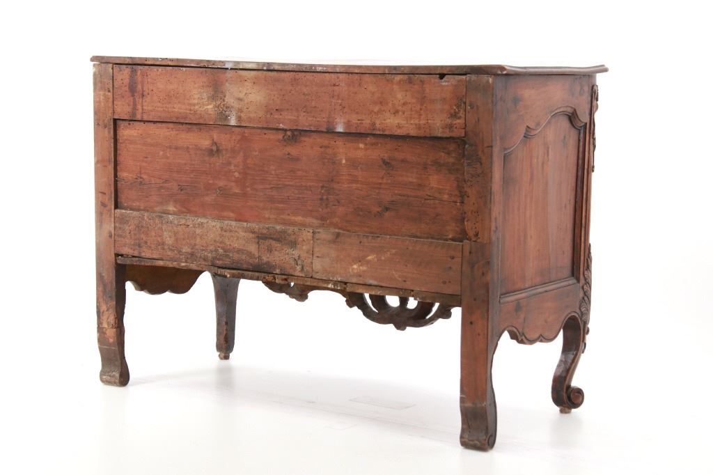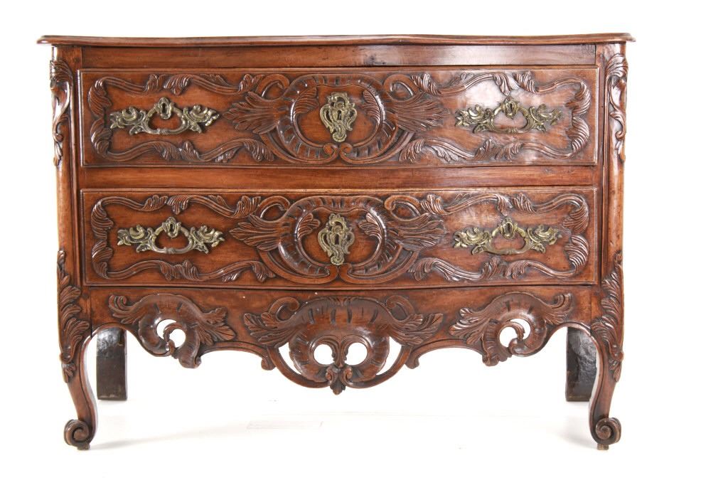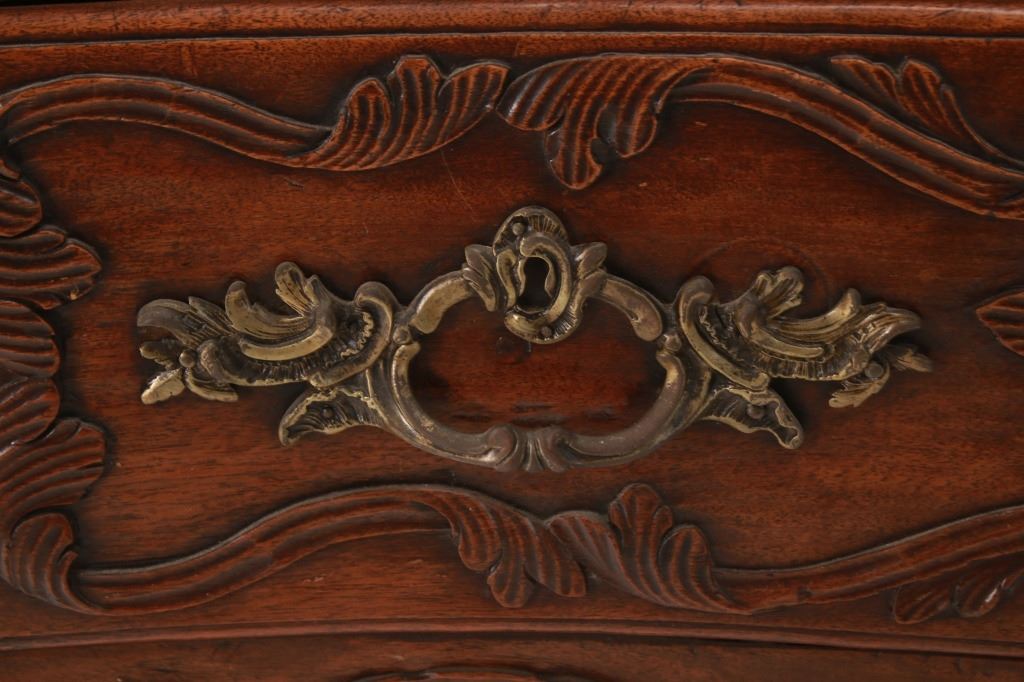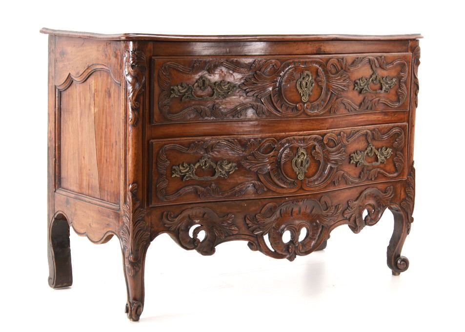 For your consideration is a Rare Late 18th Century French Provincial Louis XV Walnut Bombe Shaped Commode. The eighteenth century is considered the Golden age of French furniture. It was during this time that the most refined and beautiful Royal furniture was made in the busy Paris workshops of Europe's elite cabinet makers. Two-board serpentine top and front, two drawers having extensive, fine carving over an elaborate carved and shaped acanthus leaves skirt apron with pierced cartouche with dentil design typical of Provence, Arles region, stands on cabriole legs decorated with acanthus leaves at the shoulder ending with escargot feet, with acanthus leaves carved at the top. Scrolled Bombe side panels, two front carved Bombe molded drawers with hand-carved acanthus leaves, scalloped shaped top beveled and molded Dupont edge, hand-cast detailed drawer pulls and matching escutcheons hardware. The curved forms, lightness, grace, comfort and asymmetry of this period replaced the more formal, boxlike and massive furniture of the Louis XIV style. Excellent quality with superb craftsmanship, the commode is in wonderfully preserved condition, insect damage to backboards, some splits, scratches and minor fading to two-board top, nicely finished. Measures 24"D x 48.75"W x 34.75"H and weighs 120 pounds.