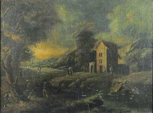 18th C. Italian School oil on canvas, Extensive landscape with figures beside a lake, 17.5 x 24 ins. £600-800