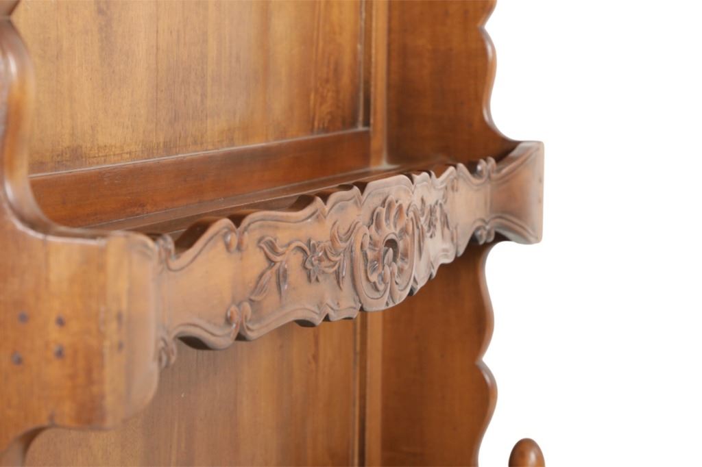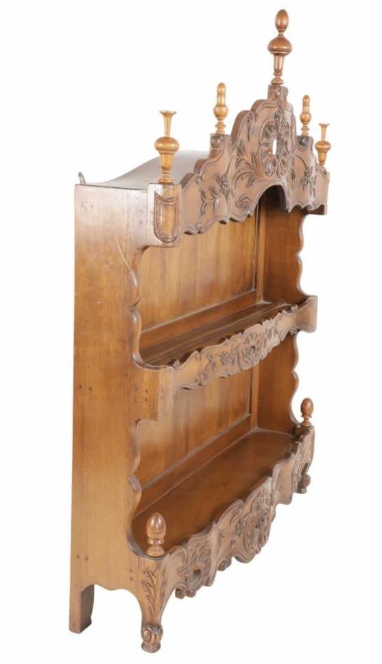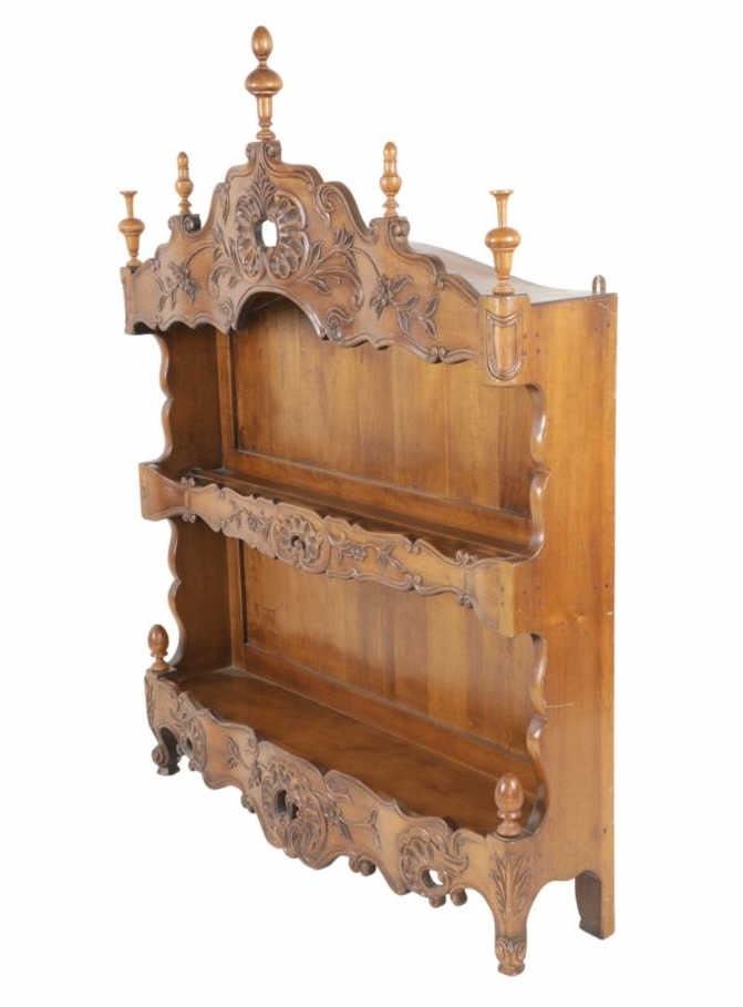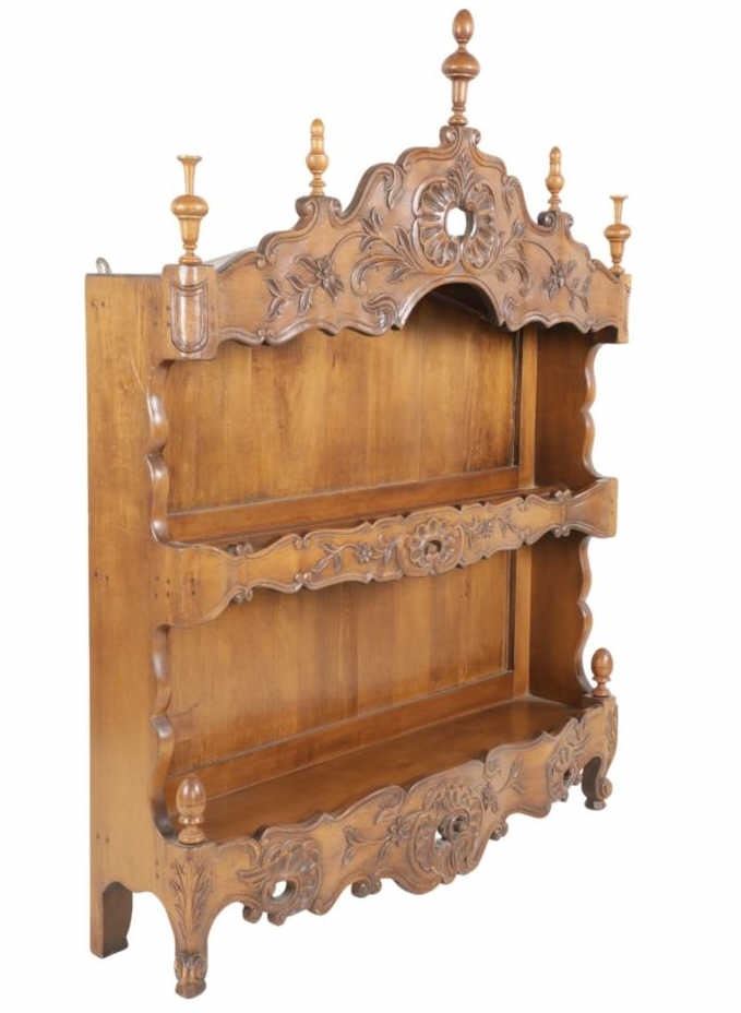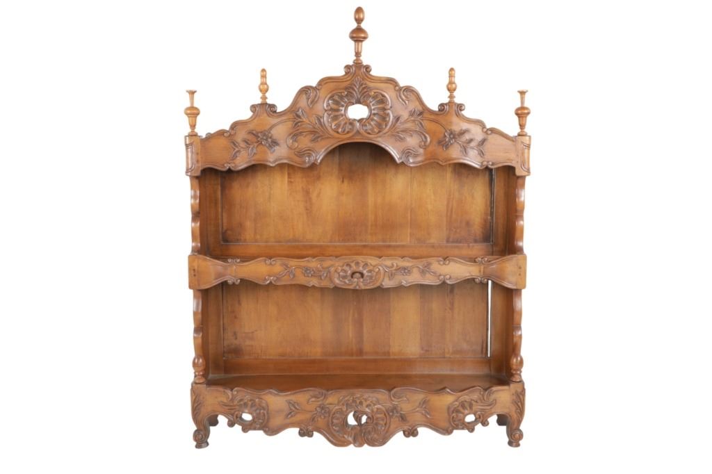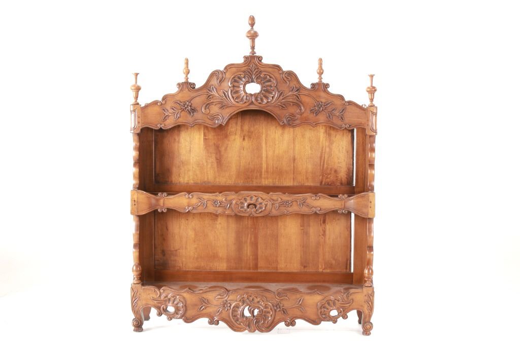 For your consideration is an 18th Century Louis XV Carved Walnut Wall Estanier. This French Provençal Estanier (the Provençal name for this kind of hanging shelf) is a wonderful example of practicality and craftsmanship. An Estanier was originally used as a hanging shelf to display a pewter collection, or "Etains". This elegant antique shelf embodies the timeless appeal of the classic Louis XV period furniture workmanship. When Louis XV, who reigned from 1715–74, focused royal life on the smaller salons of Versailles rather than its grand chambers, it transformed the aesthetics away from the imposing and angular furniture that characterized the style of Louis XIV. A broader focus on comfort and more delicate forms define antique Louis XV furniture, with nature-inspired carvings, wood inlays, curved cabriole legs, and asymmetrical shapes. This farmhouse inspired Estanier features two serpentine carved shelves across the front decorated with acanthus and rocaille designs, serpentine carved apron has pierced rocaille cartouche. The intricately carved cornice features and stands on embellished with decorative finials. Serpentine carved side rails flow down to finial topped acanthus carved cabriole legs which finish in escargot feet. Rich patina exhibited throughout, original natural wood imperfections visible adding to the warm countryside charm. The Estanier is in wonderfully preserved condition, finish exhibits very slight wear from age and use. Measures 39.25"W x 51.25"L x 8.5"H