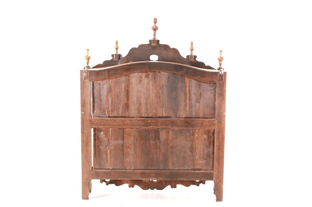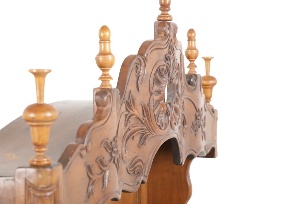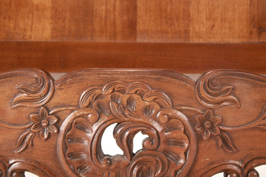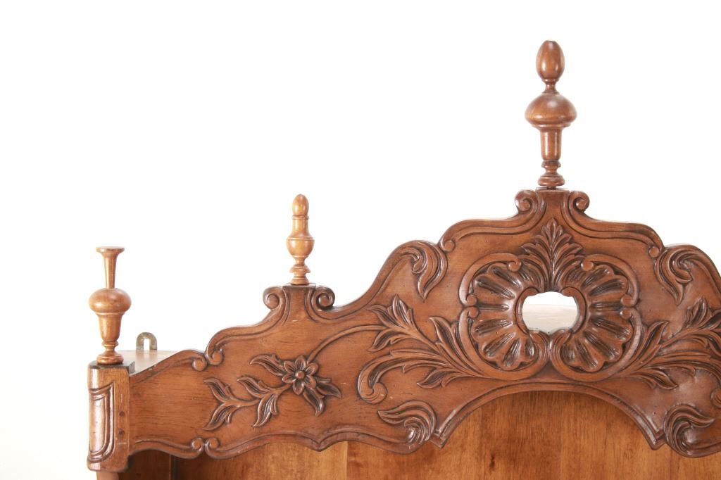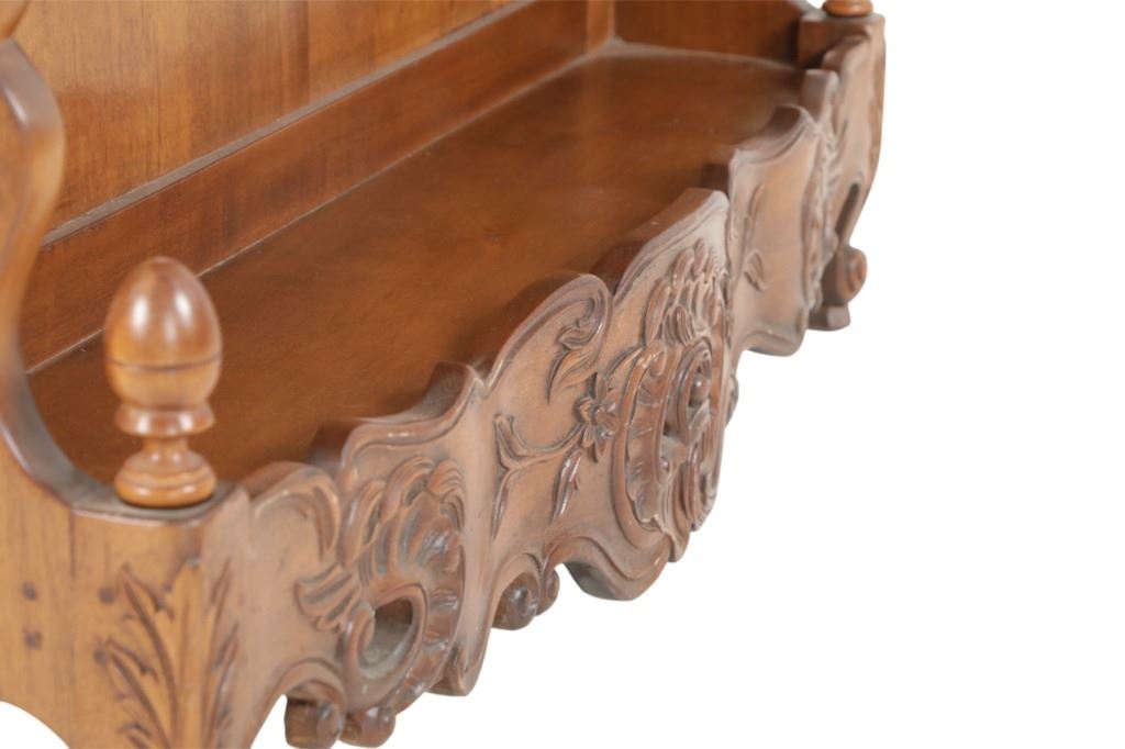 For your consideration is an 18th Century Louis XV Carved Walnut Wall Estanier. This French Provençal Estanier (the Provençal name for this kind of hanging shelf) is a wonderful example of practicality and craftsmanship. An Estanier was originally used as a hanging shelf to display a pewter collection, or "Etains". This elegant antique shelf embodies the timeless appeal of the classic Louis XV period furniture workmanship. When Louis XV, who reigned from 1715–74, focused royal life on the smaller salons of Versailles rather than its grand chambers, it transformed the aesthetics away from the imposing and angular furniture that characterized the style of Louis XIV. A broader focus on comfort and more delicate forms define antique Louis XV furniture, with nature-inspired carvings, wood inlays, curved cabriole legs, and asymmetrical shapes. This farmhouse inspired Estanier features two serpentine carved shelves across the front decorated with acanthus and rocaille designs, serpentine carved apron has pierced rocaille cartouche. The intricately carved cornice features and stands on embellished with decorative finials. Serpentine carved side rails flow down to finial topped acanthus carved cabriole legs which finish in escargot feet. Rich patina exhibited throughout, original natural wood imperfections visible adding to the warm countryside charm. The Estanier is in wonderfully preserved condition, finish exhibits very slight wear from age and use. Measures 39.25"W x 51.25"L x 8.5"H