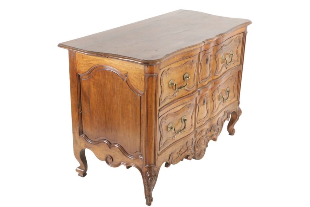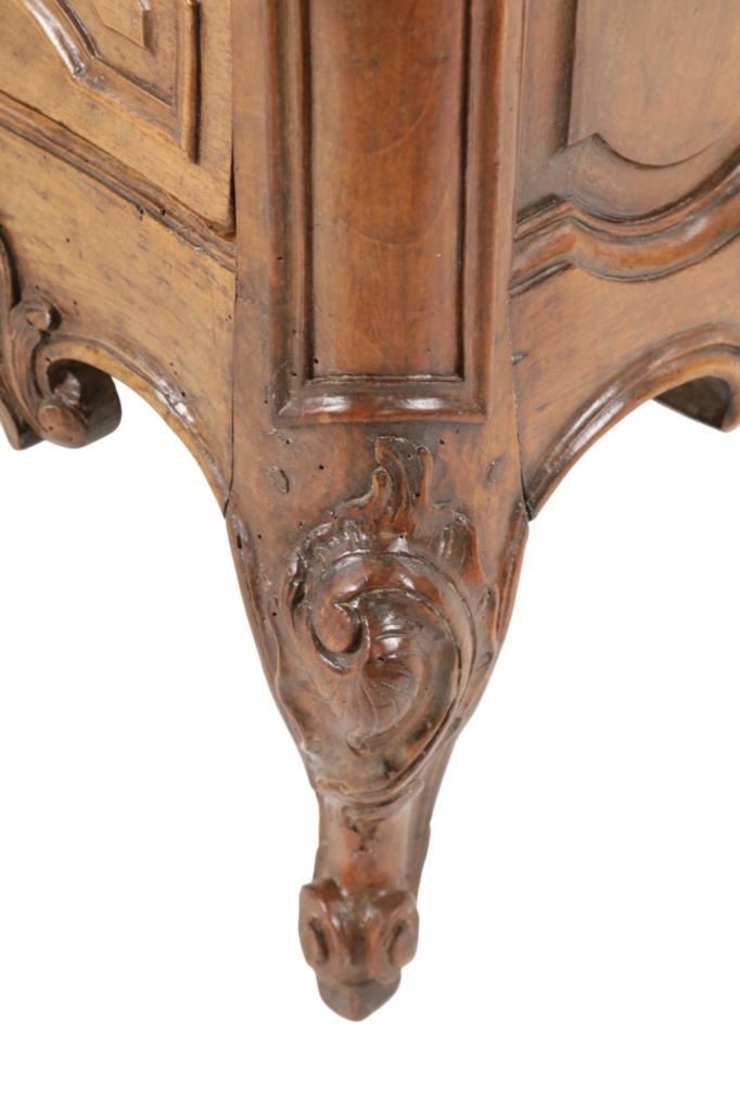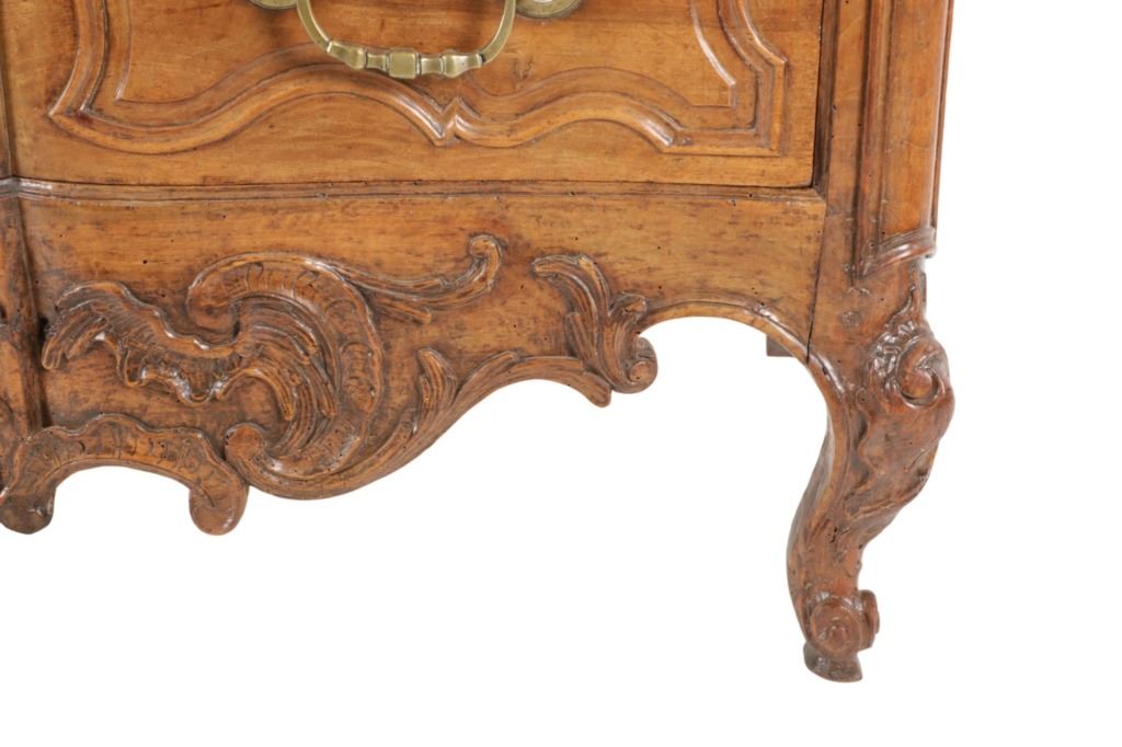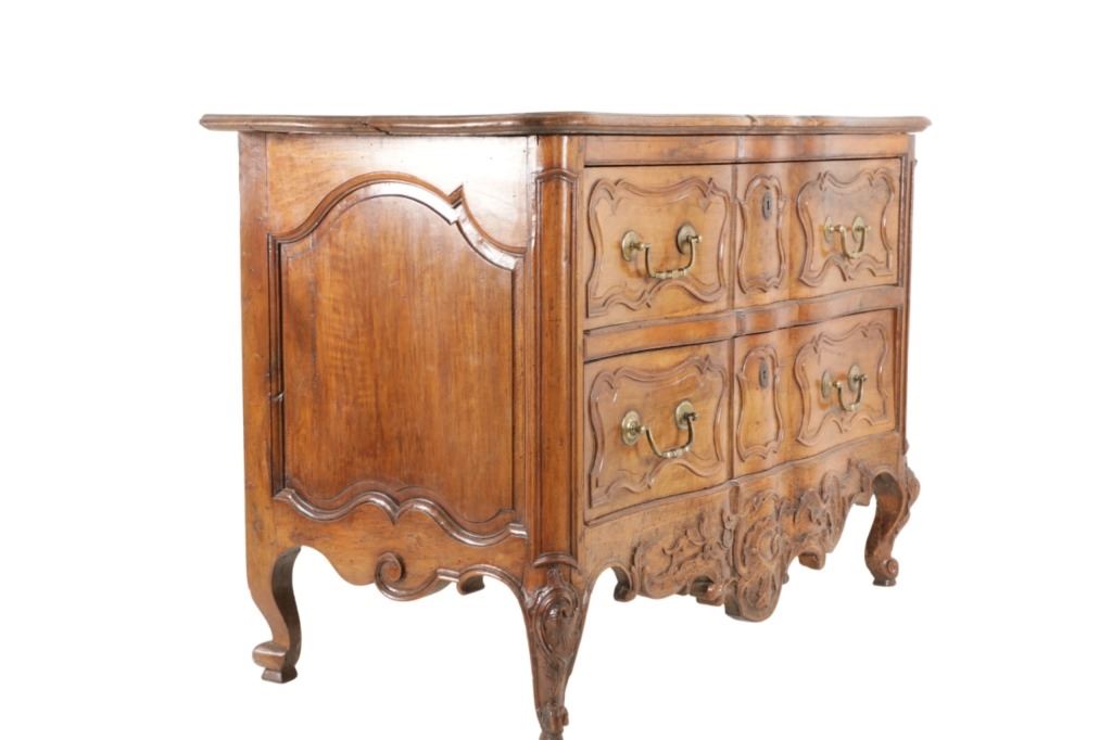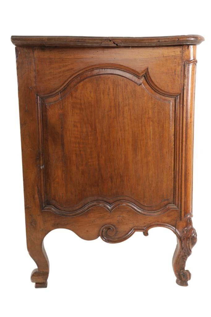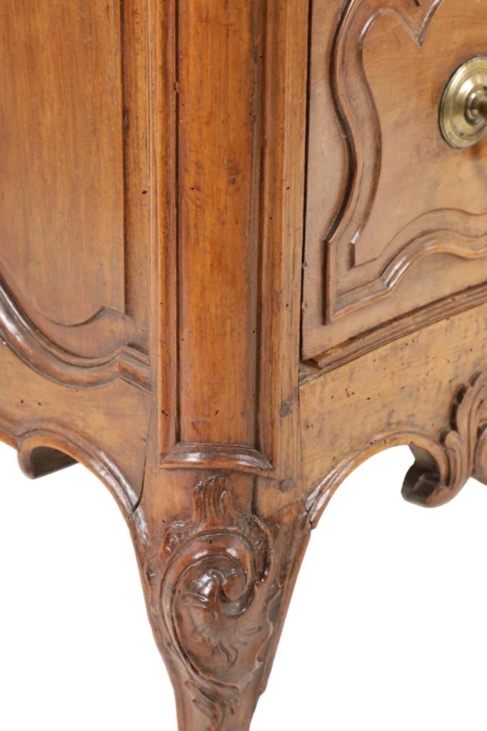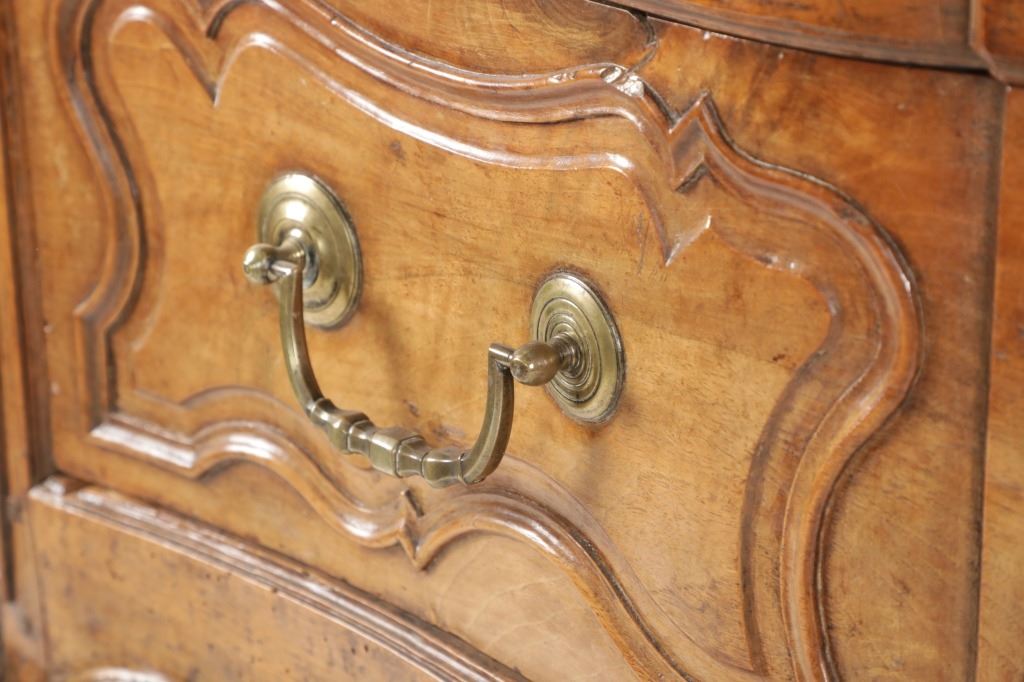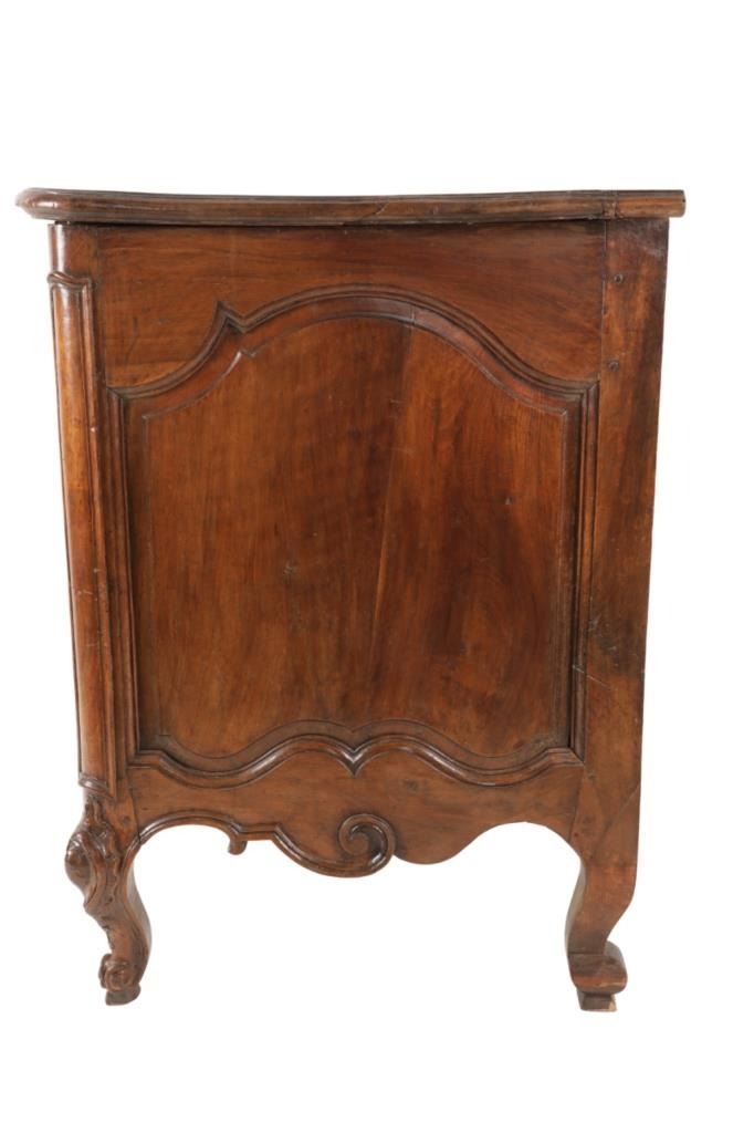 For your consideration is a Rare Late 18th Century Louis XV French Provençal Walnut Bombe Commode. Louis XV style is the epitome of French furniture at its finest. The eighteenth century is considered the Golden age of French furniture. It was during this time that the most refined and beautiful Royal furniture was made in the busy Paris workshops of Europe's elite cabinet makers. Rococo motifs are central to Louis XV furniture design. These include C-scrolls, S-scrolls, acanthus leaves, rocaille (shell-like) patterns, and pastoral scenes. These elements were used to create a sense of movement and natural beauty, often giving the furniture a light, almost whimsical appearance. The commode, a low chest of drawers, was a key furniture piece during this period. Louis XV commodes typically had bombe (curved) fronts and sides. Typical of the Provence, Arles region, this commode stands on cabriole legs decorated with acanthus leaves at the shoulder, and ending with escargot feet. Two-board serpentine top and front, two drawers having fine hand carving over an elaborate carved and shaped acanthus leaves skirt apron, hand-cast detailed brass drawer pulls and matching escutcheons hardware and original locking mechanism (key not included). Hand carved arched side panels over scalloped aprons. Excellent quality with superb craftsmanship, the commode is in wonderfully preserved condition, nice finish to two-board top, nicely finished throughout, insect damage to backboards. Measures 26"D x 54.5"W x 36"H and weighs 158 pounds.*