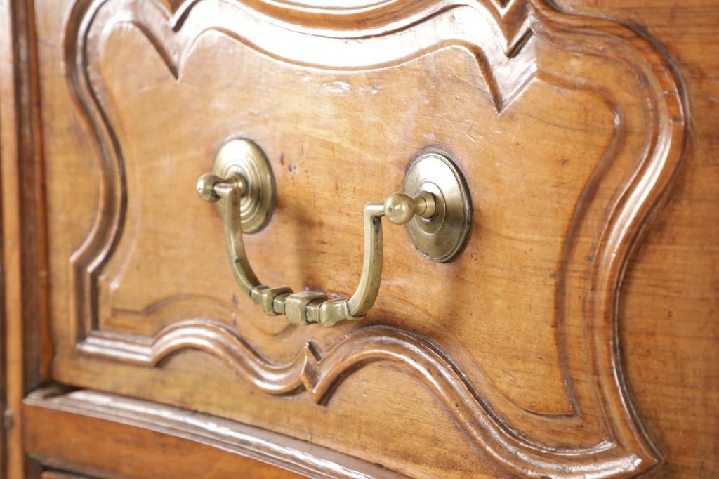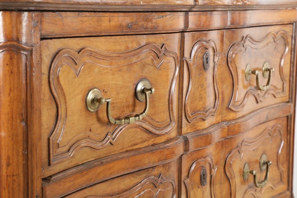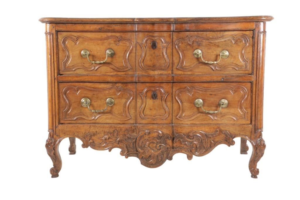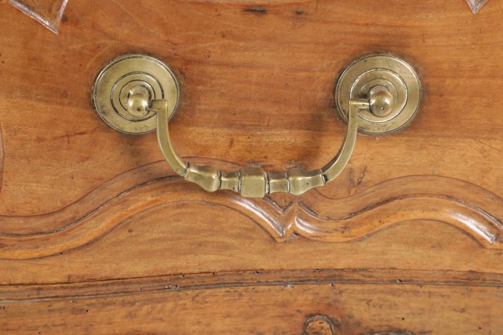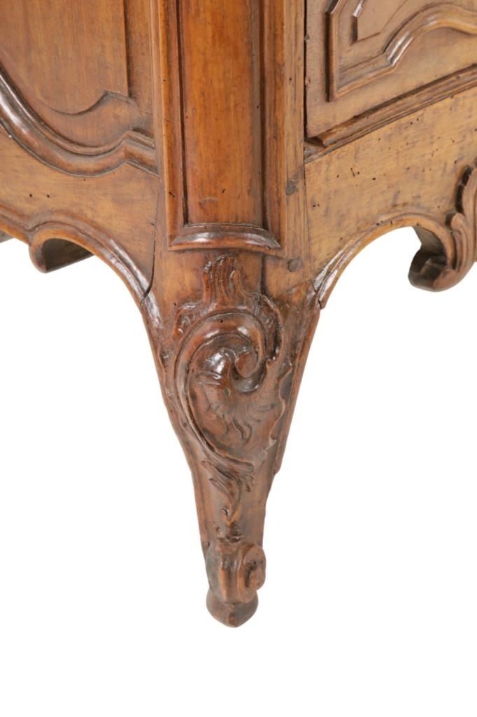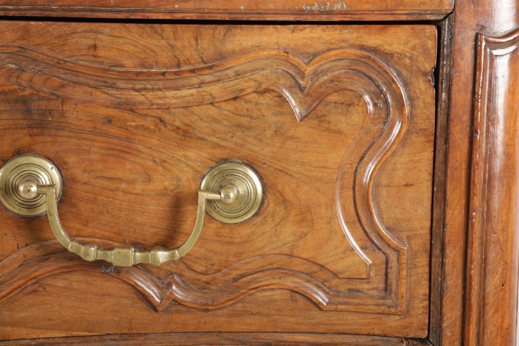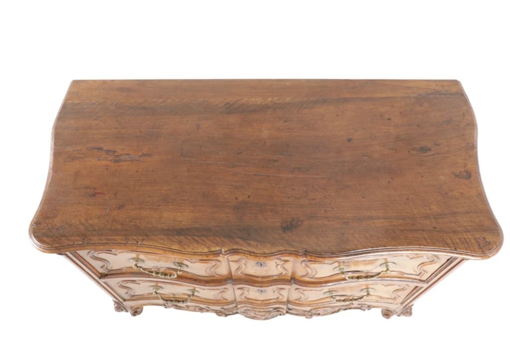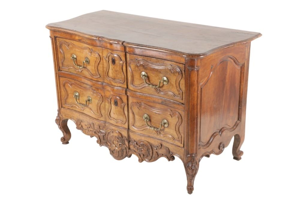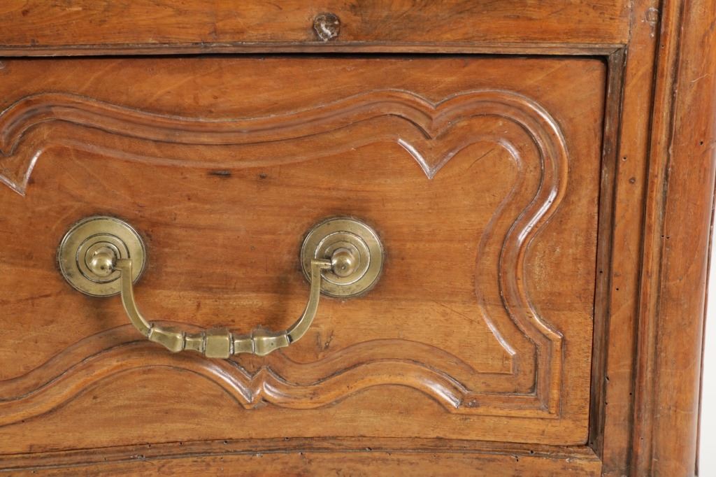 For your consideration is a Rare Late 18th Century Louis XV French Provençal Walnut Bombe Commode. Louis XV style is the epitome of French furniture at its finest. The eighteenth century is considered the Golden age of French furniture. It was during this time that the most refined and beautiful Royal furniture was made in the busy Paris workshops of Europe's elite cabinet makers. Rococo motifs are central to Louis XV furniture design. These include C-scrolls, S-scrolls, acanthus leaves, rocaille (shell-like) patterns, and pastoral scenes. These elements were used to create a sense of movement and natural beauty, often giving the furniture a light, almost whimsical appearance. The commode, a low chest of drawers, was a key furniture piece during this period. Louis XV commodes typically had bombe (curved) fronts and sides. Typical of the Provence, Arles region, this commode stands on cabriole legs decorated with acanthus leaves at the shoulder, and ending with escargot feet. Two-board serpentine top and front, two drawers having fine hand carving over an elaborate carved and shaped acanthus leaves skirt apron, hand-cast detailed brass drawer pulls and matching escutcheons hardware and original locking mechanism (key not included). Hand carved arched side panels over scalloped aprons. Excellent quality with superb craftsmanship, the commode is in wonderfully preserved condition, nice finish to two-board top, nicely finished throughout, insect damage to backboards. Measures 26"D x 54.5"W x 36"H and weighs 158 pounds.*