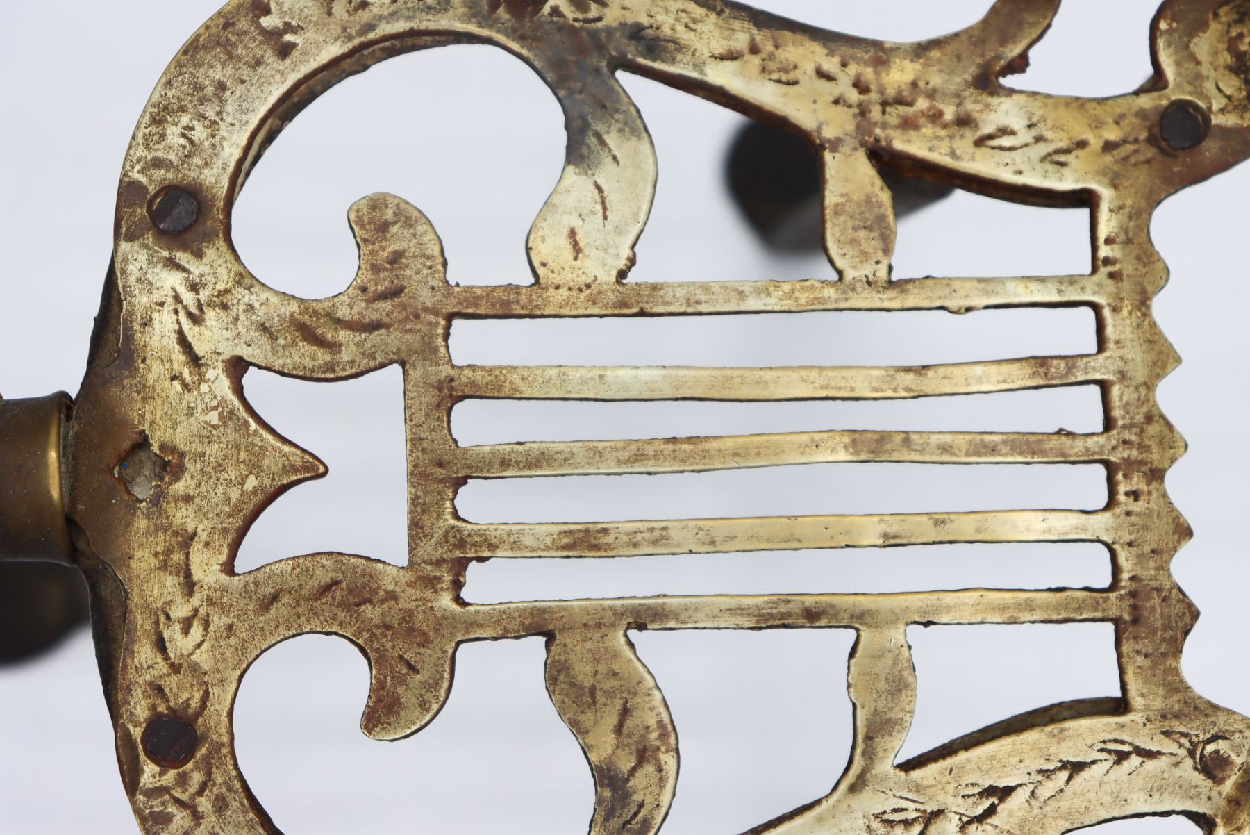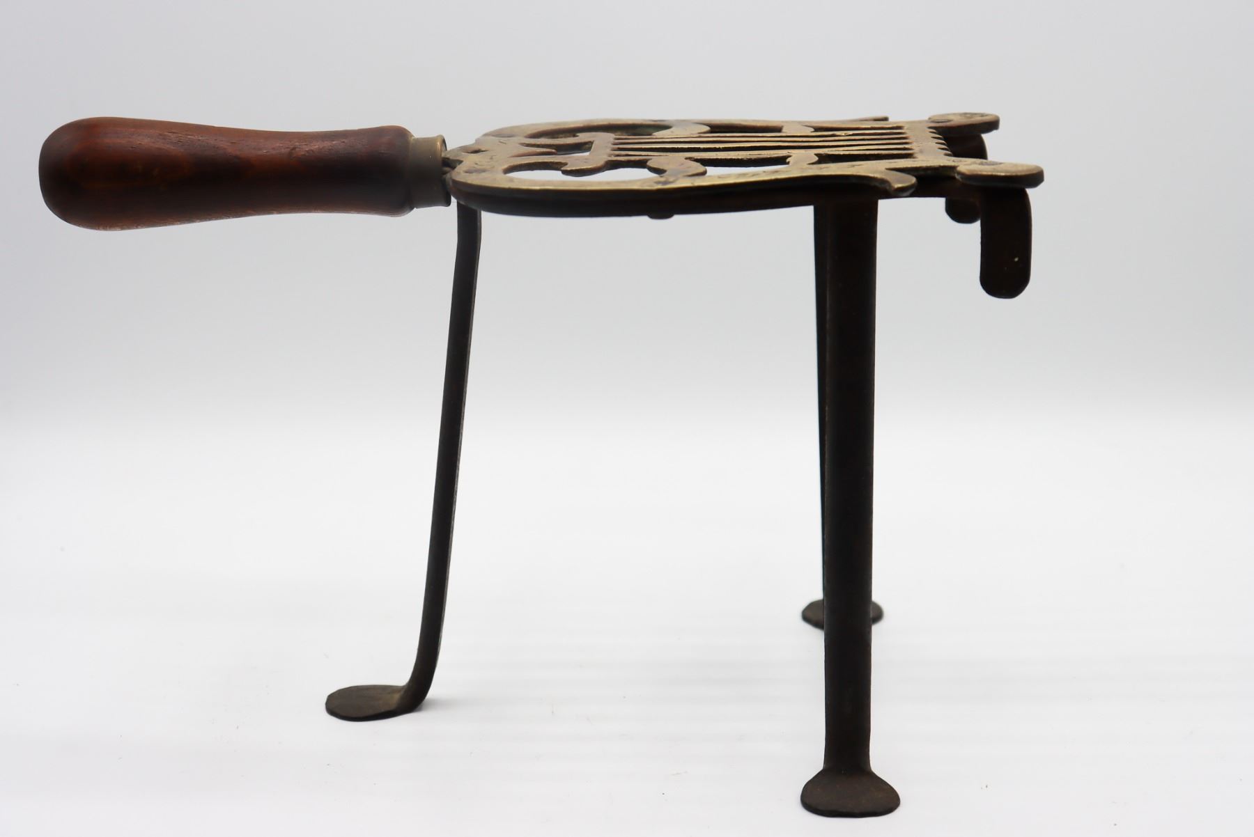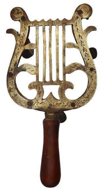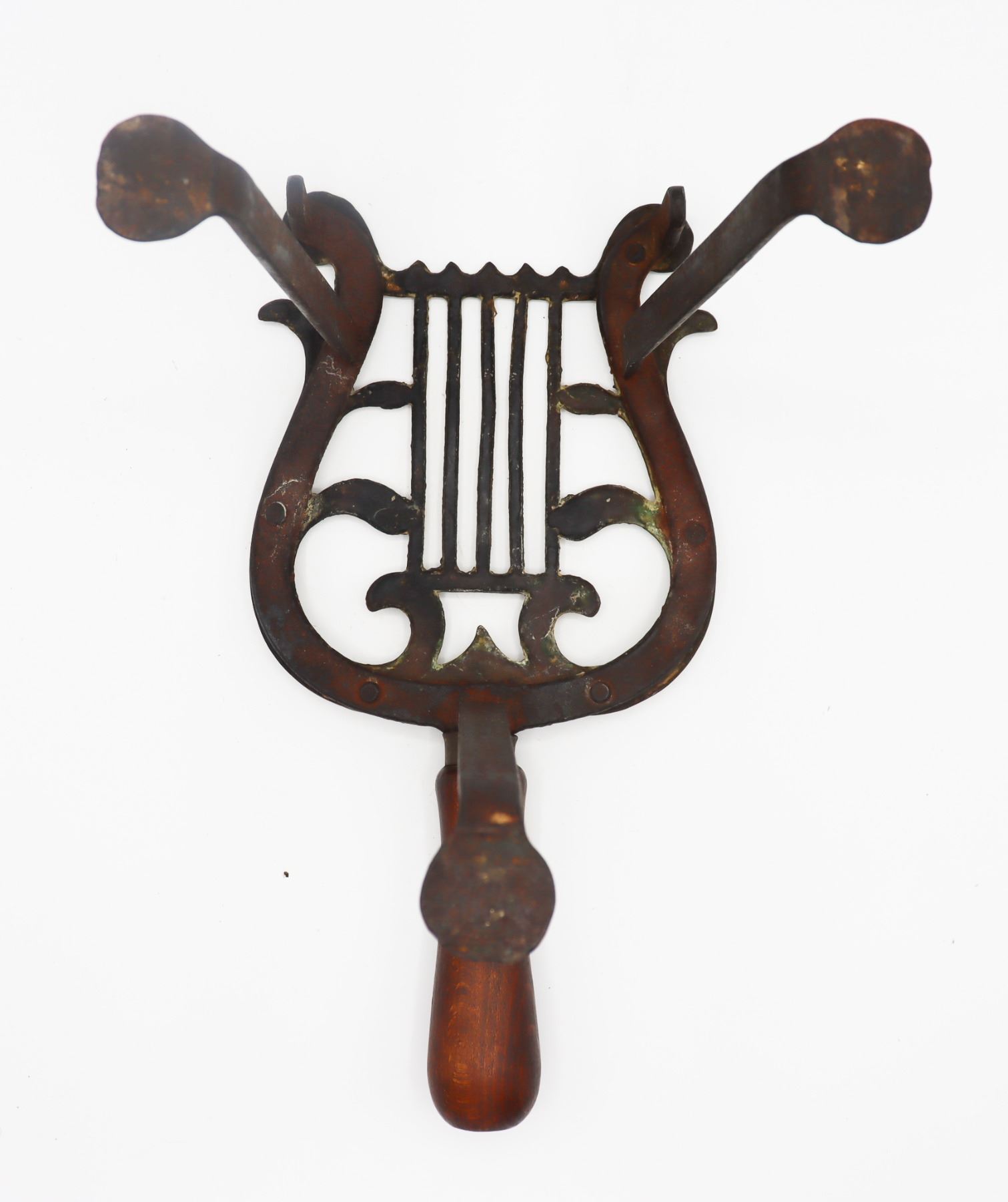 18th C Trivett in the form of a lyre. Measurements: 10 1/2 x 5 1/2 x 7 in.