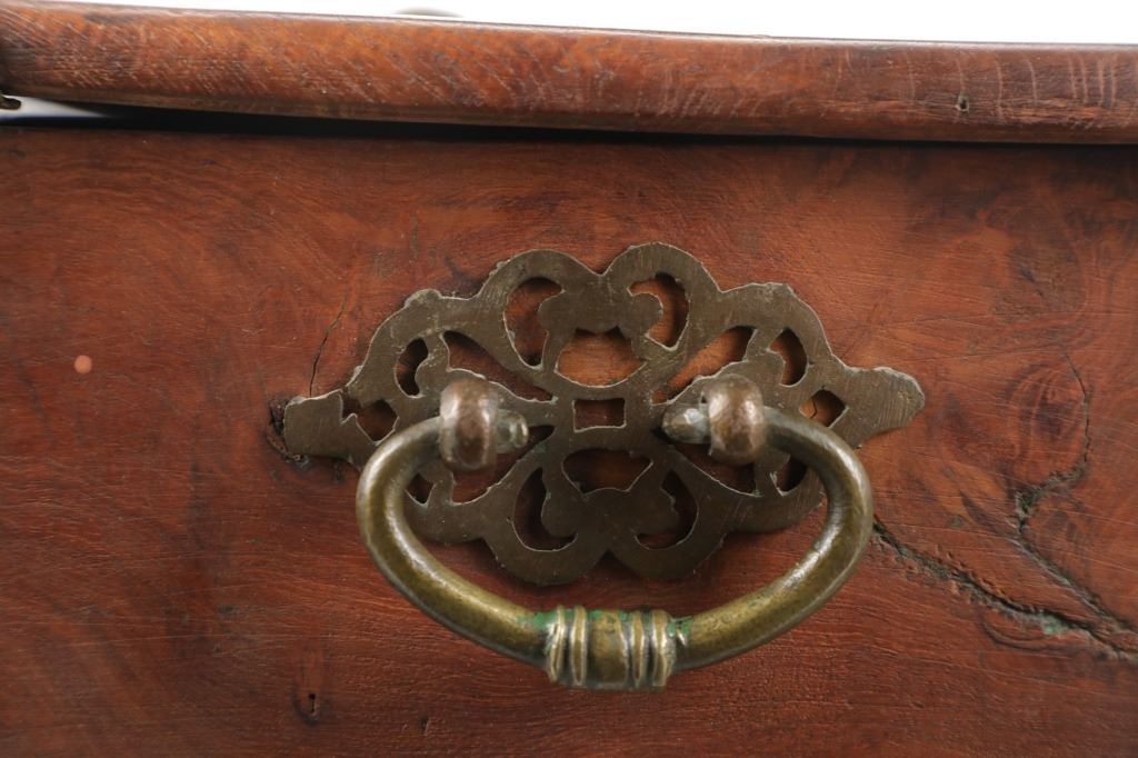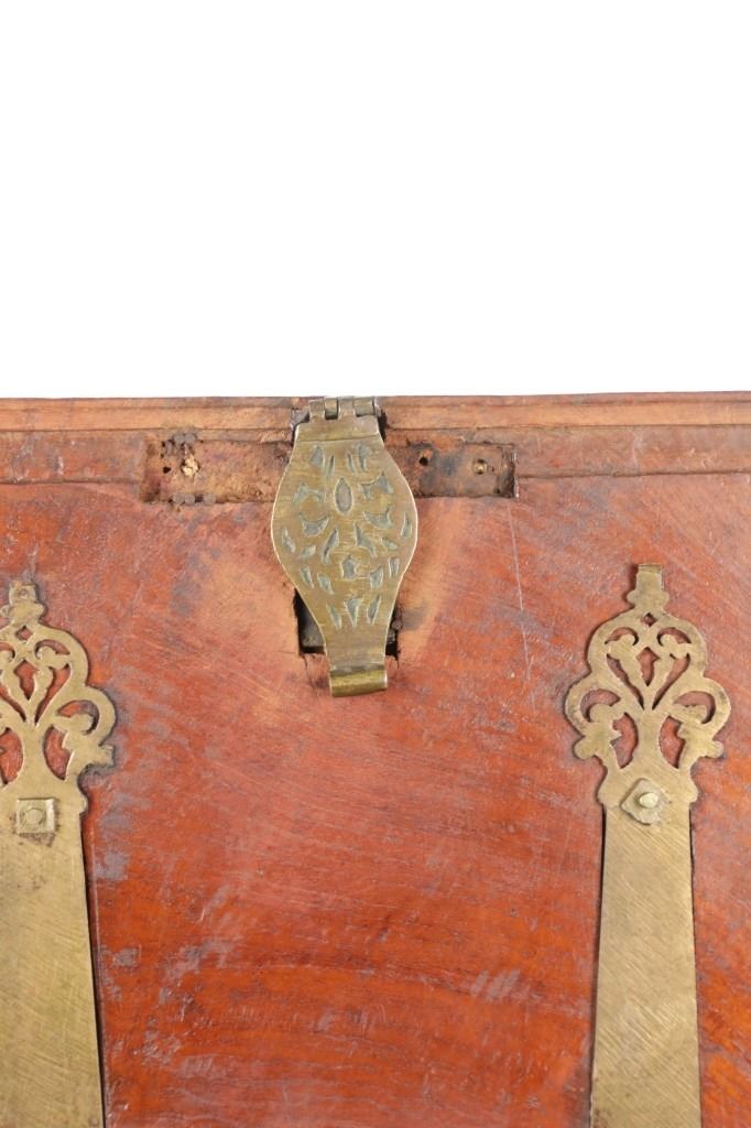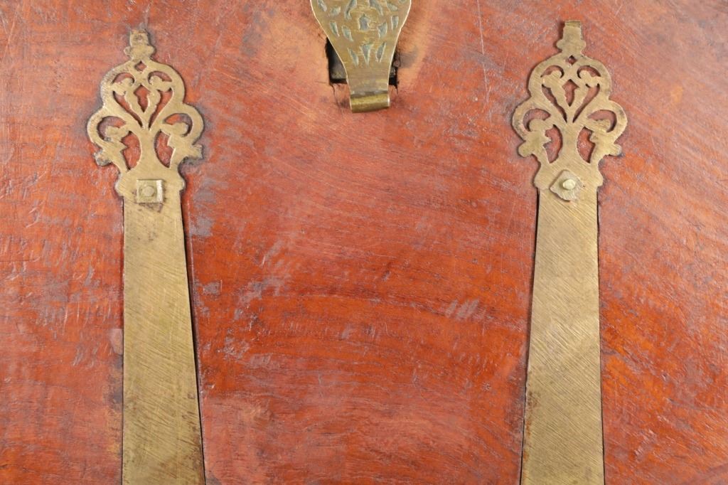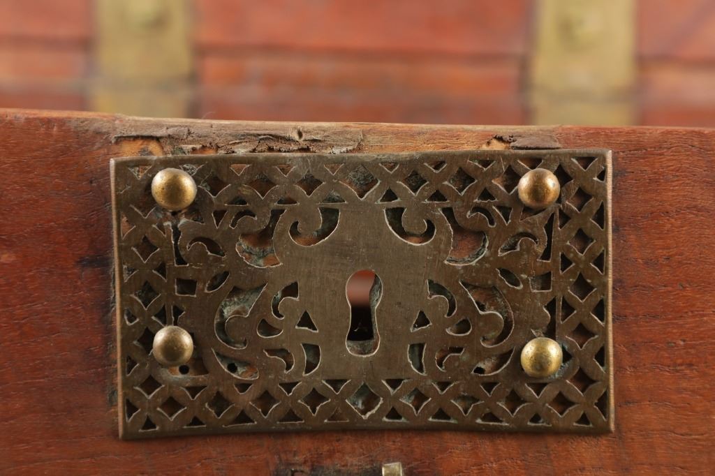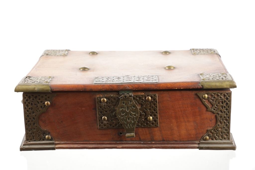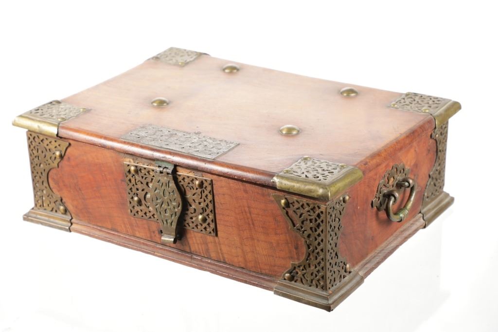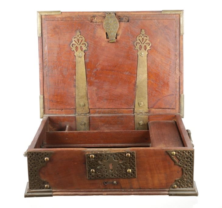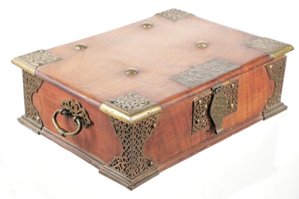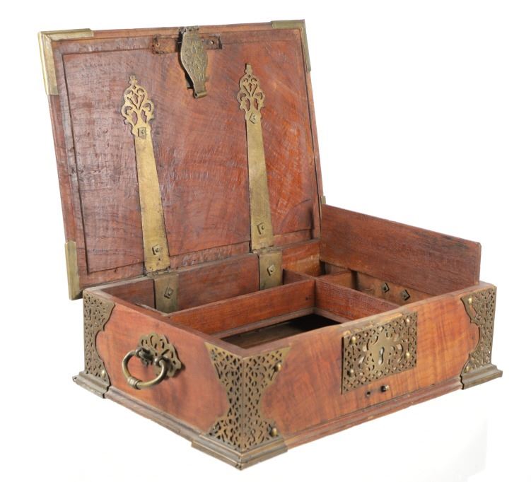 Presented in this lot is an Antique 18th Century Portuguese Colonial Padauk Wood Writing Desk, circa late 18th century. The top opens to reveal separate compartments for storing writing supplies, one two-section compartment has a lid that when fully opened holds up the solid wood top. African Padauk trees are native to central and tropical west Africa and down to Angola, all areas of former Portuguese colonial expeditions. This Colonial Padauk Wood Writing Desk features brass fretwork on the top, rear side, and handle escutcheons. Brass accent studs decorate the sides and top. Original lock missing, but fretwork hasp is attached. Wood and brass have deep rich patinas, wear consistent with age and use. Measures 14.25"W x 19.75"L x 6"H, weight is 16lb, 12oz.