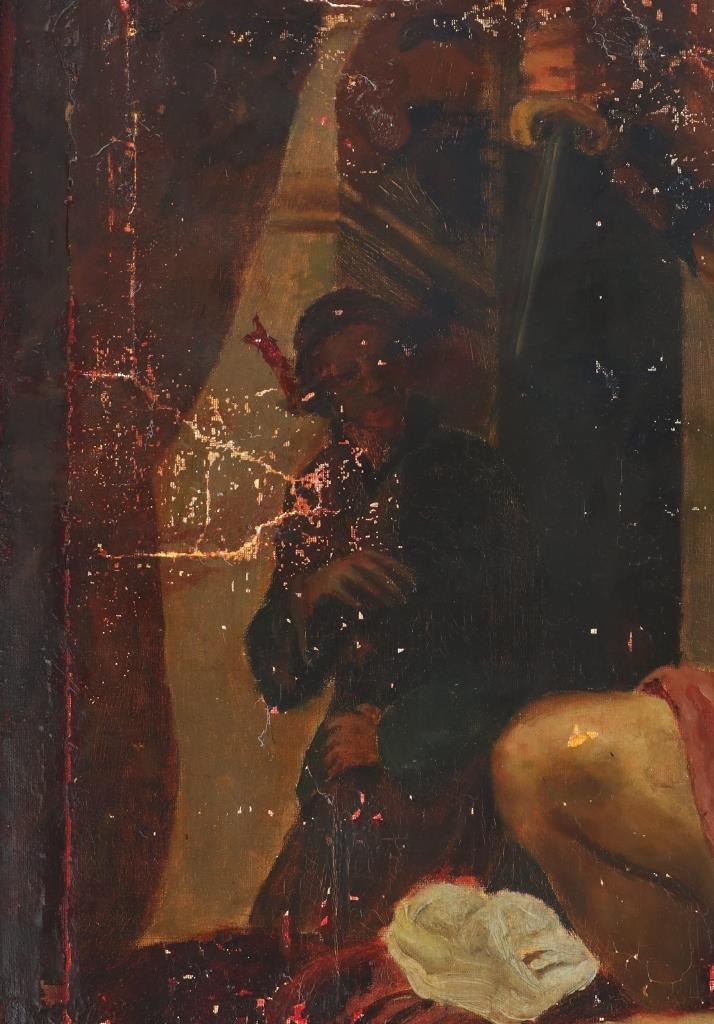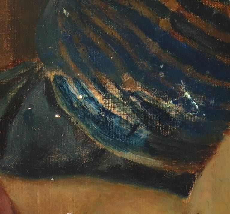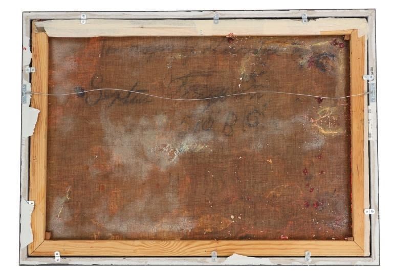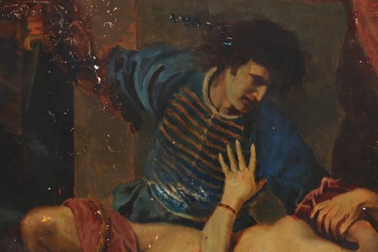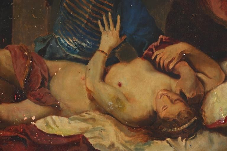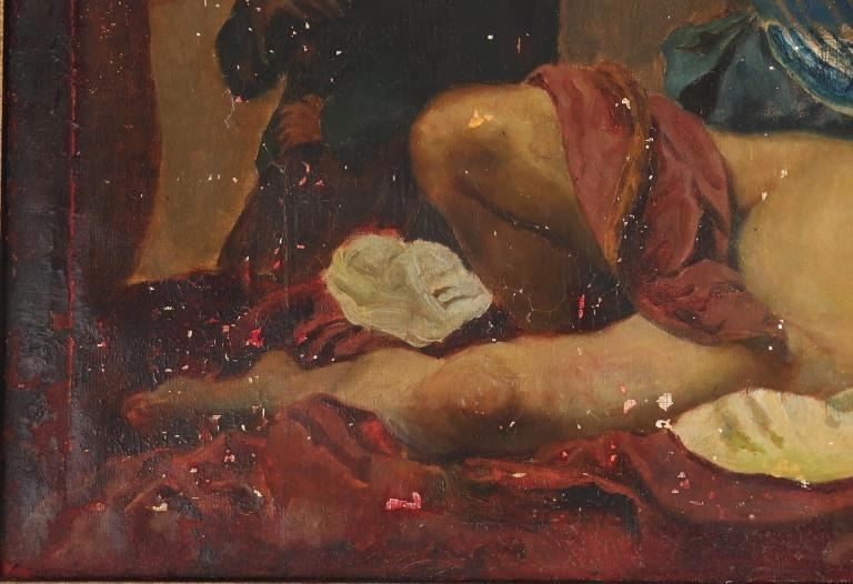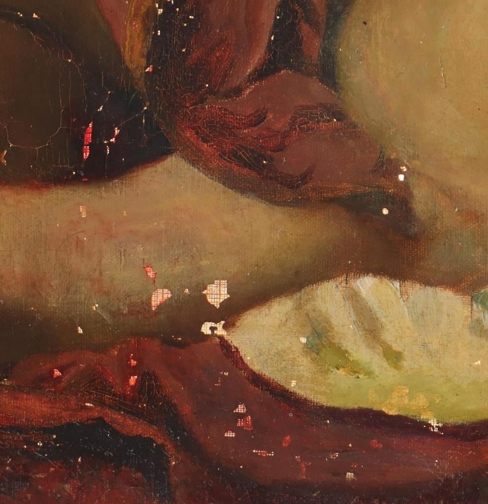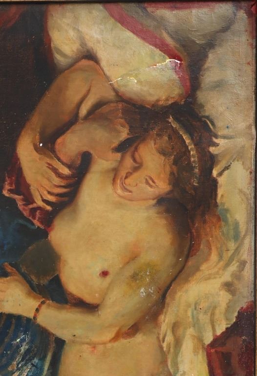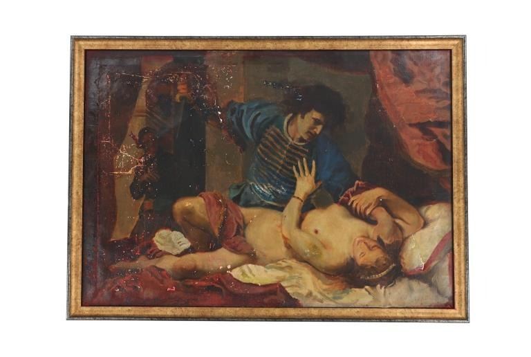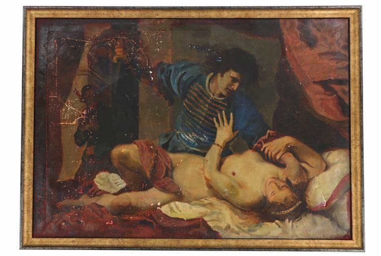 For your consideration is an original framed oil on canvas painting titled, "Rape of Lucretia" by Felice Ficherelli, circa 1700s, Baroque style. The painting is a close, reduced replica of a much larger canvas by Ficherelli on display in the Accademia di San Luca, Rome. Faintly visible on the reverse of the canvas the title is written along the top edge, Sextus Tarquin 510 B. C. is written below it. Research has an approximate time frame of the painting as from the 18th century. There is almost a complete absence of paintings showing Lucretia since 1800. The story of Lucretia, who died by her own hand in 510 to 507 BCE, is well known. Various versions, all of which date from about 500 years later, contain slightly different details. Lucretia, anglicized as Lucrece, was a noblewoman in ancient Rome, whose rape by Sextus Tarquinius (Tarquin) and subsequent suicide precipitated a rebellion that overthrew the Roman monarchy and led to the transition of the Roman government from a kingdom to a republic. Felice Ficherelli (1605-1660) was an Italian painter of the Baroque period, born in San Gimignano and active mainly in Tuscany. Among Ficherelli's early patrons was Conte Bardi, who persuaded Ficherelli to move to Florence and to study with the painter Jacopo da Empoli. Empoli's influence is evident in the sumptuous fabrics seen in many of Ficherelli's works. Ficherelli was nicknamed "Felice Riposo" for his retiring nature. Some of the qualities most frequently associated with the Baroque style are grandeur, sensuous richness, drama, dynamism, movement, tension, emotional exuberance. A story of passion, strong emotion, and gravity, this has been depicted in many paintings with written accounts by Chaucer, Shakespeare, and many others. Benjamin Britten also wrote an opera The Rape of Lucretia, first performed in 1946. This oil painting is in poor to fair condition with evidence of multiple repairs noted, and the canvas and paint are brittle. Professionally mounted in a contemporary gold gilt hardwood frame. Visible art measures 23.5"W x 33.75"L, and the frame is 26"W x 36"L x 1.5"D.*