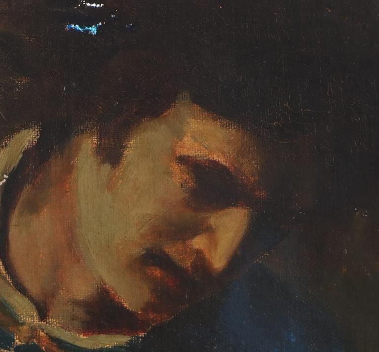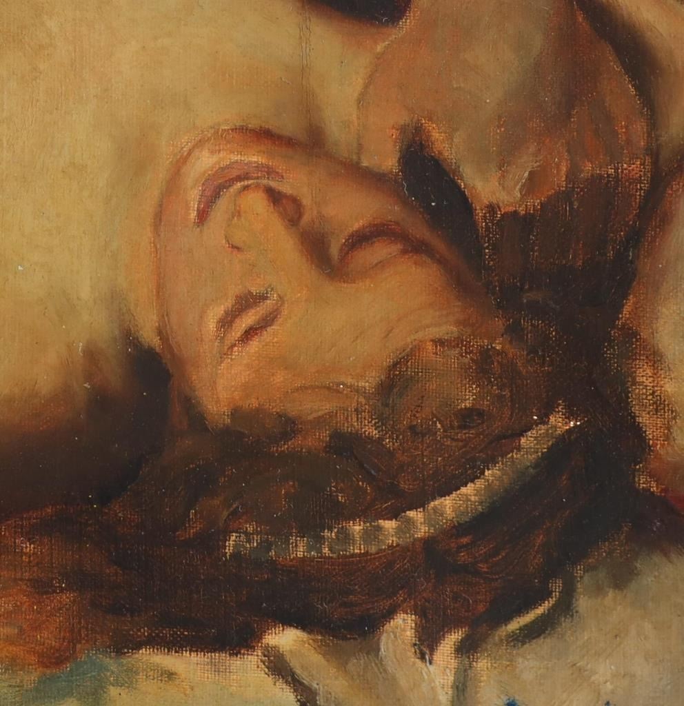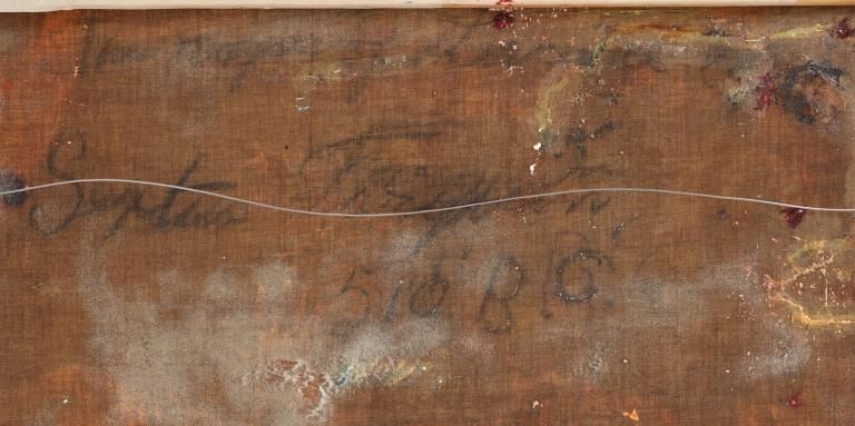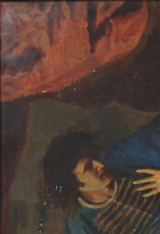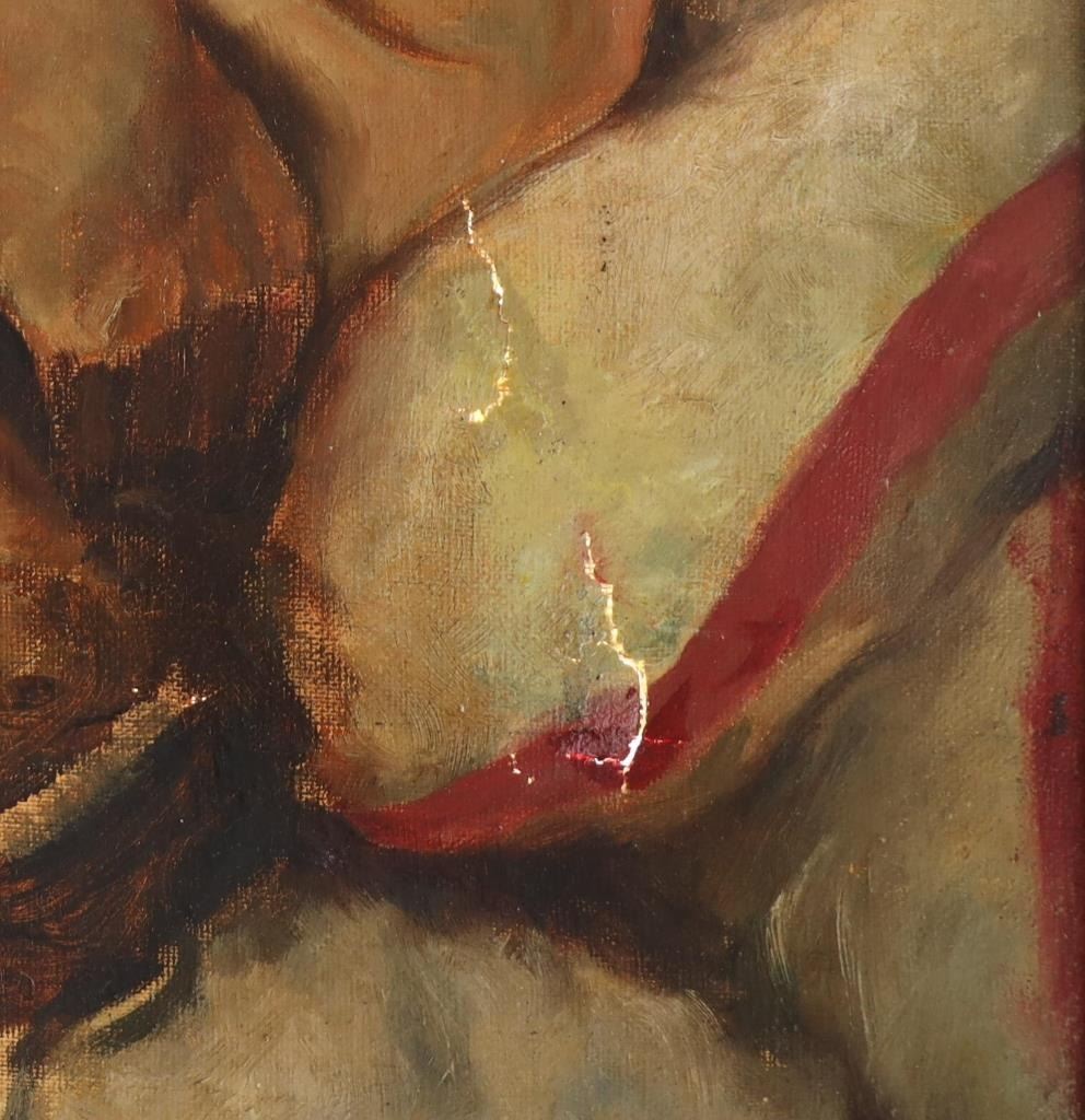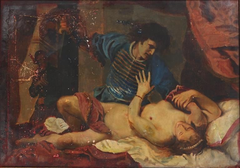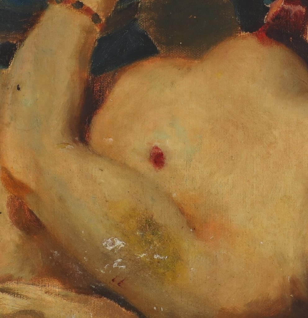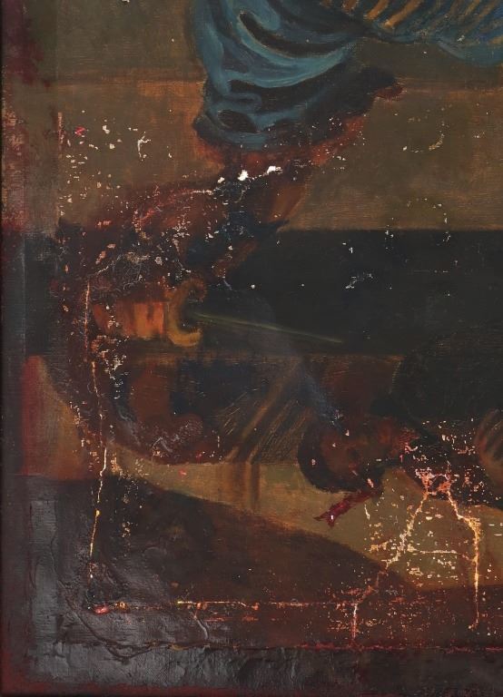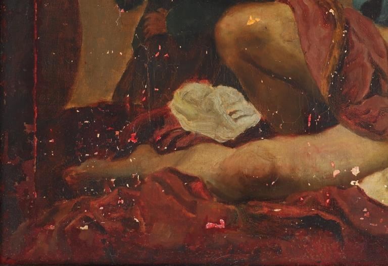 For your consideration is an original framed oil on canvas painting titled, "Rape of Lucretia" by Felice Ficherelli, circa 1700s, Baroque style. The painting is a close, reduced replica of a much larger canvas by Ficherelli on display in the Accademia di San Luca, Rome. Faintly visible on the reverse of the canvas the title is written along the top edge, Sextus Tarquin 510 B. C. is written below it. Research has an approximate time frame of the painting as from the 18th century. There is almost a complete absence of paintings showing Lucretia since 1800. The story of Lucretia, who died by her own hand in 510 to 507 BCE, is well known. Various versions, all of which date from about 500 years later, contain slightly different details. Lucretia, anglicized as Lucrece, was a noblewoman in ancient Rome, whose rape by Sextus Tarquinius (Tarquin) and subsequent suicide precipitated a rebellion that overthrew the Roman monarchy and led to the transition of the Roman government from a kingdom to a republic. Felice Ficherelli (1605-1660) was an Italian painter of the Baroque period, born in San Gimignano and active mainly in Tuscany. Among Ficherelli's early patrons was Conte Bardi, who persuaded Ficherelli to move to Florence and to study with the painter Jacopo da Empoli. Empoli's influence is evident in the sumptuous fabrics seen in many of Ficherelli's works. Ficherelli was nicknamed "Felice Riposo" for his retiring nature. Some of the qualities most frequently associated with the Baroque style are grandeur, sensuous richness, drama, dynamism, movement, tension, emotional exuberance. A story of passion, strong emotion, and gravity, this has been depicted in many paintings with written accounts by Chaucer, Shakespeare, and many others. Benjamin Britten also wrote an opera The Rape of Lucretia, first performed in 1946. This oil painting is in poor to fair condition with evidence of multiple repairs noted, and the canvas and paint are brittle. Professionally mounted in a contemporary gold gilt hardwood frame. Visible art measures 23.5"W x 33.75"L, and the frame is 26"W x 36"L x 1.5"D.*