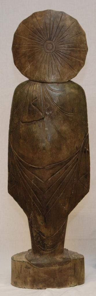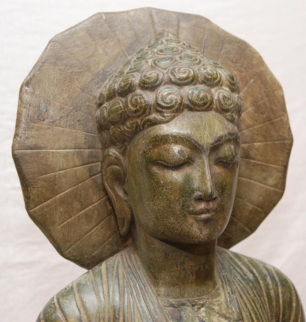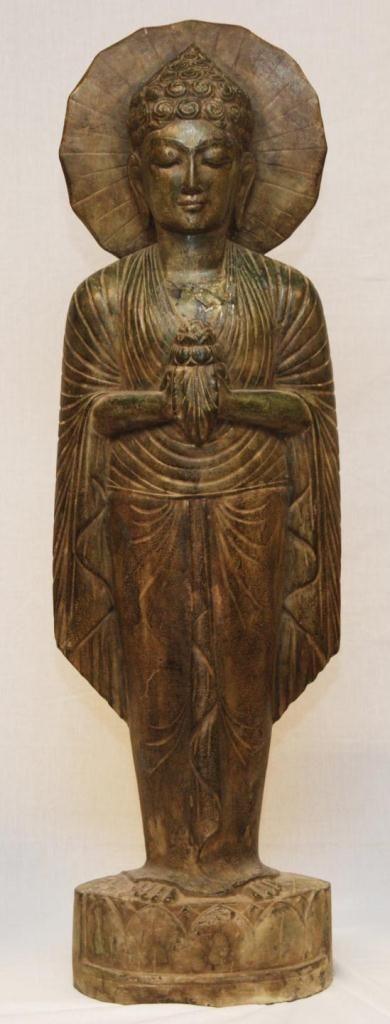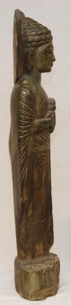Antique Chinese hand carved solid wood figure depicting a standing Buddha holding lotus flower to chest. He is standing on stylized lotus blossom base. Early to mid Qing dynasty period. Measures 43" height (109.2cm). Total weight of 14.6 kilograms.