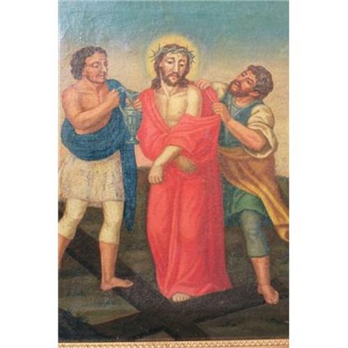 Strong, colorful depiction of the Savior escorted by two men with the cross in the background...Naive Spanish School, possibly 18th. C. Mexican; relined and in exceptional condition! Great piece for church, library or as part of any religious or Spanish themed collection. Guaranteed antique! Thanks for looking, Chas.