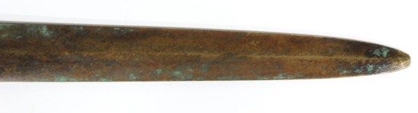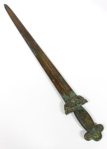 Antique Chinese bronze ceremonial sword. Has foo dog face design to handle with etched fish to each side. Etched calligraphy to side of blade. 18th century. Measures 23" length (58.4cm).