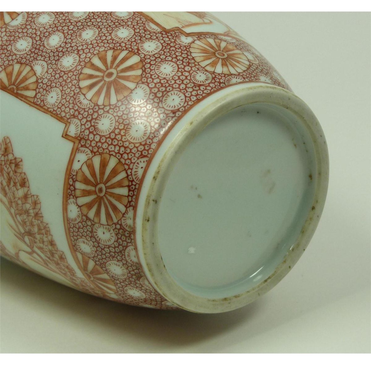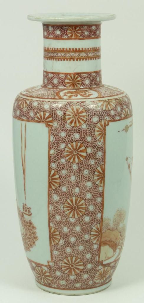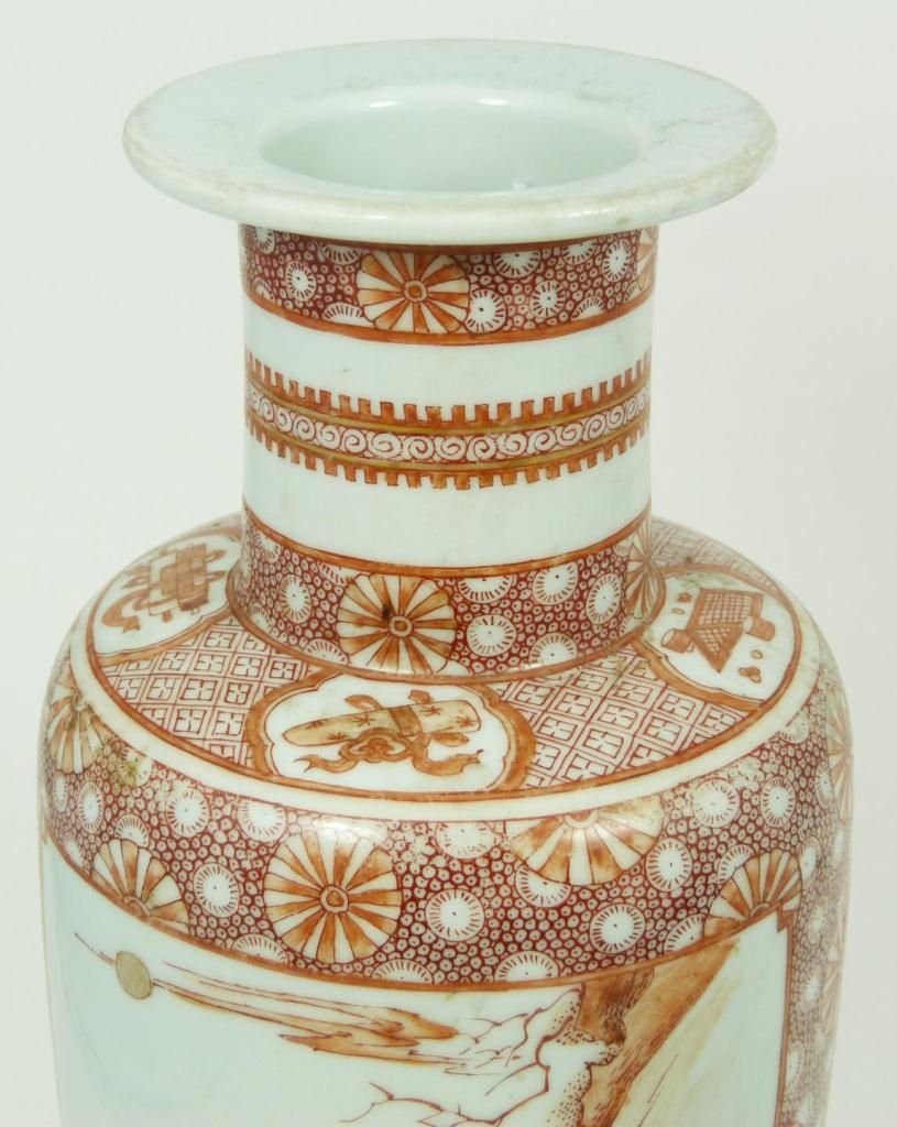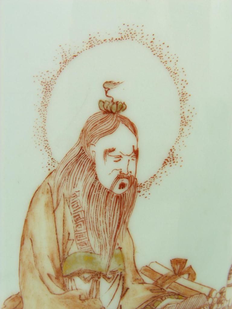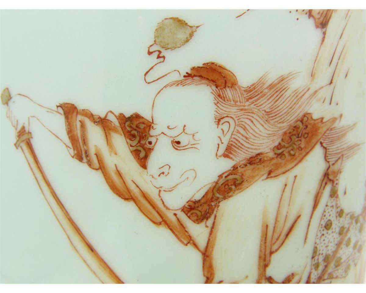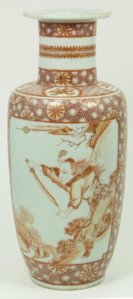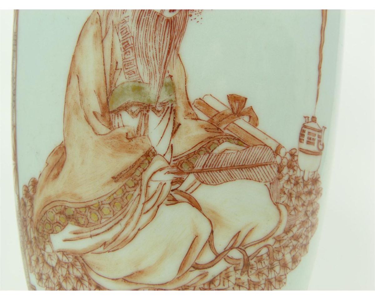 Antique Chinese Qing Dynasty hand painted enamel copper red Phoenix tail vase depicting a meditating immortal and demon. Measures 10 5/8" height (26.9cm). Total weight of 895 grams.