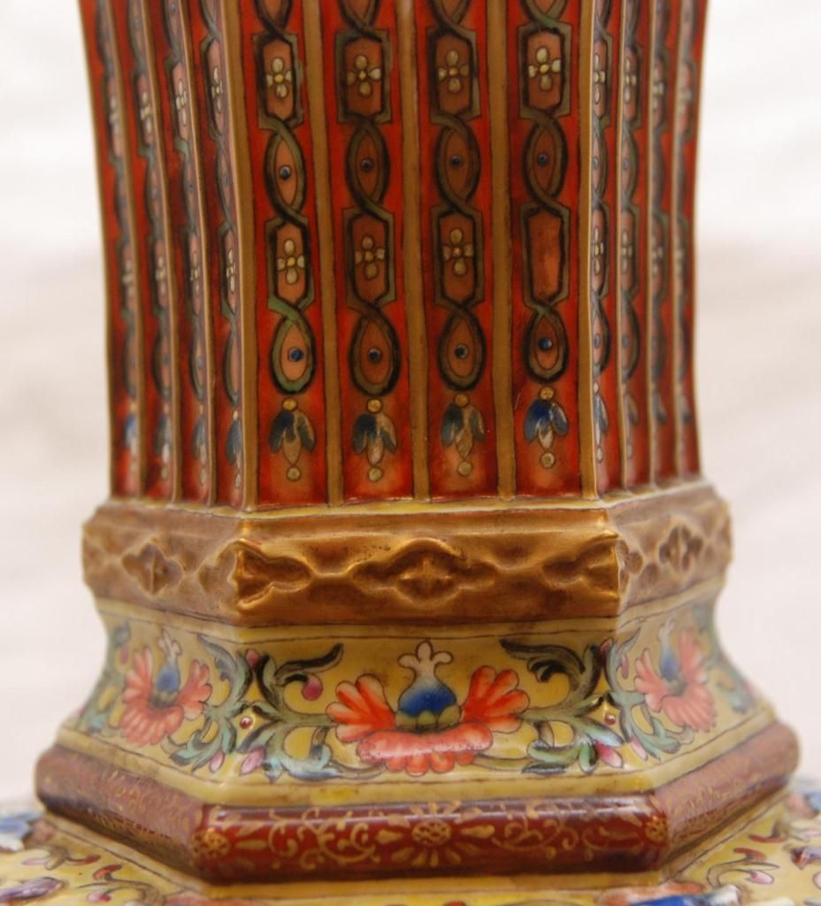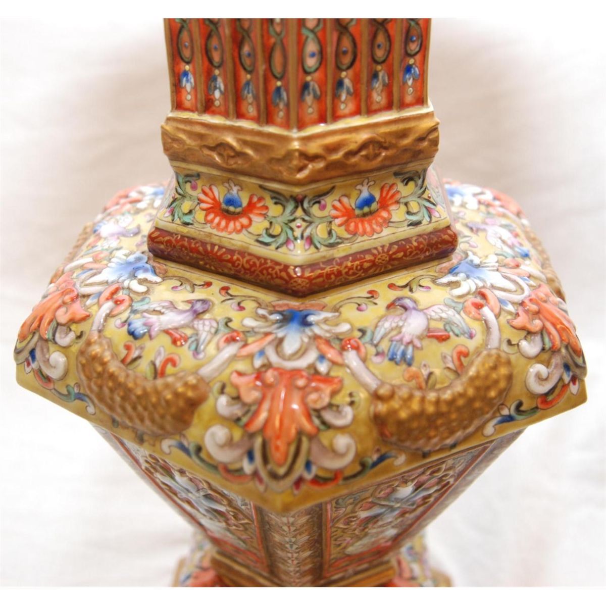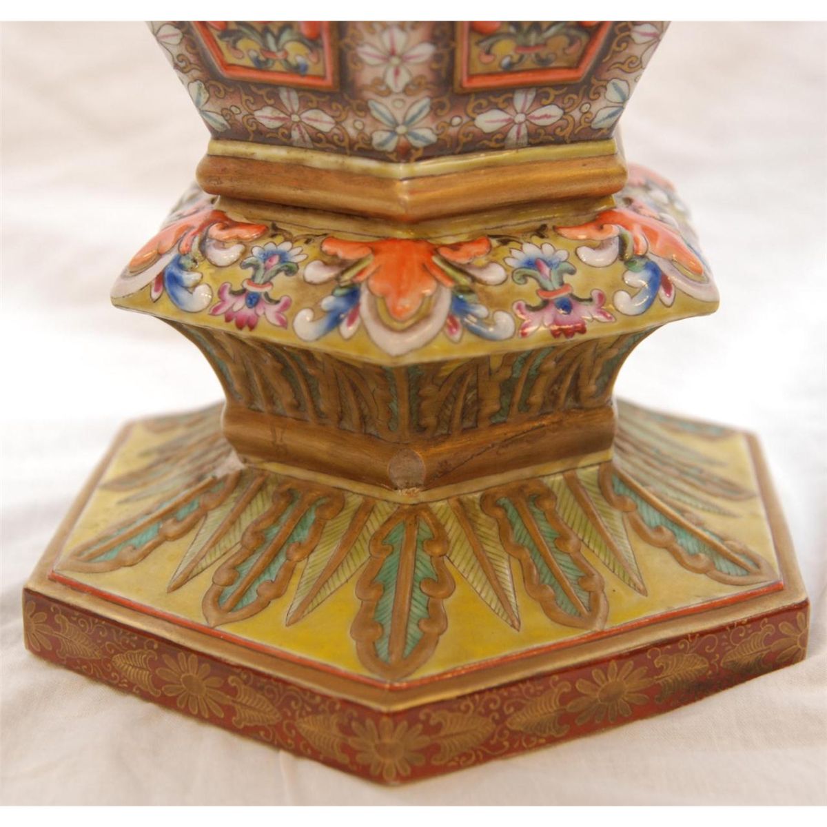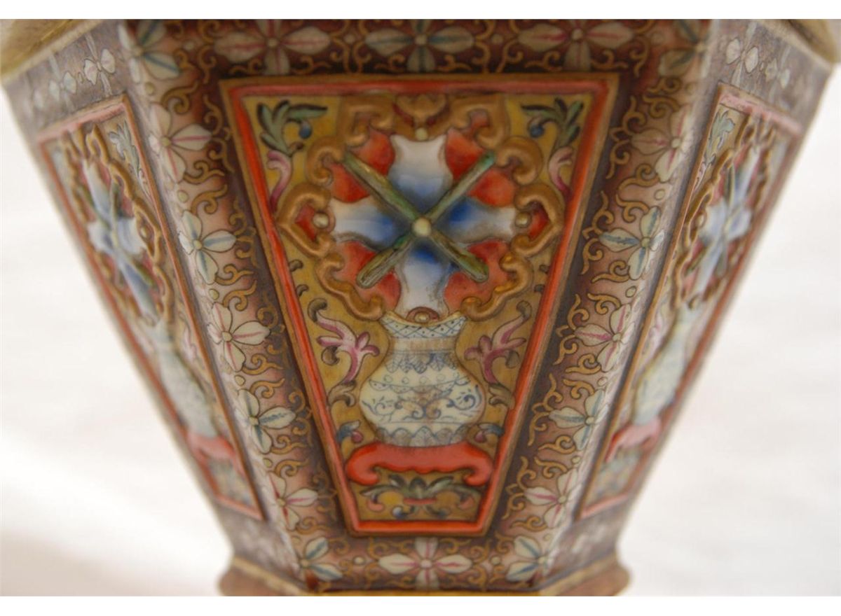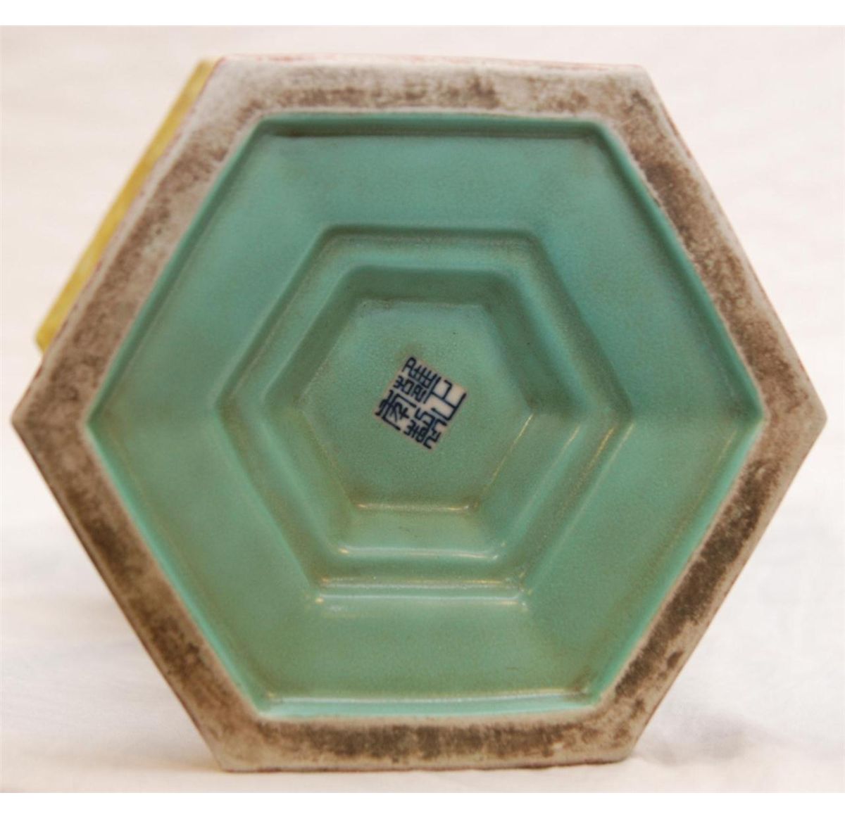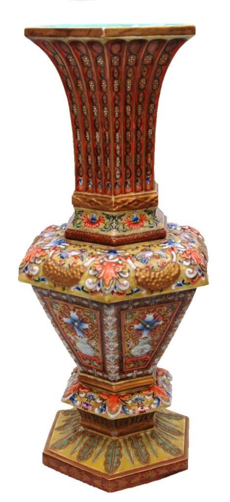 Exquisite Chinese Imperial Famille Rose hand painted and enameled hex form vase. Stunning and vivid raised depictions of birds, flowers and urns throughout. Turquoise enameled interior and bottom. Bottom holds four character blue archaic Yongzheng reign mark. Measures 17 3/8" height x 8 3/4" diameter (44.1cm x 22.2cm). Total weight of 4.32 kilograms. Provenance: Purchased from a private collector in St. Louis, Mo. The collector's father worked for the United States embassy in China and acquired the vase in 1920, Beijing.