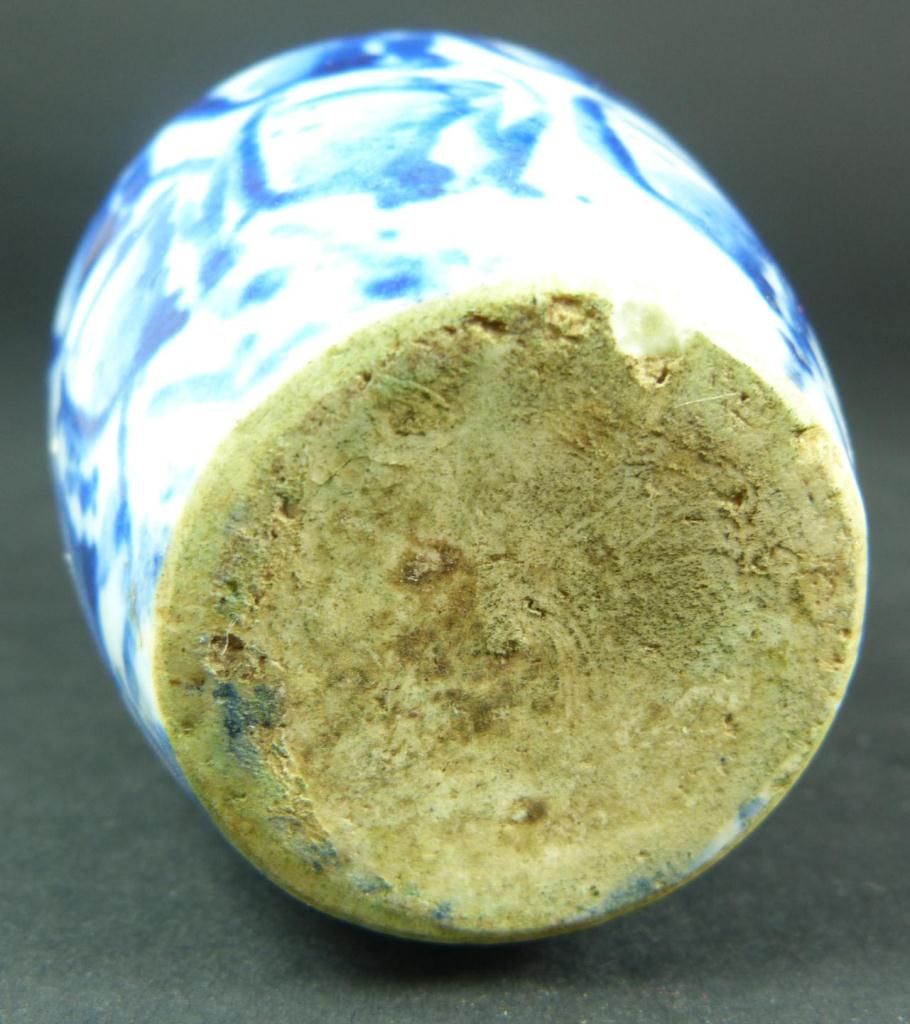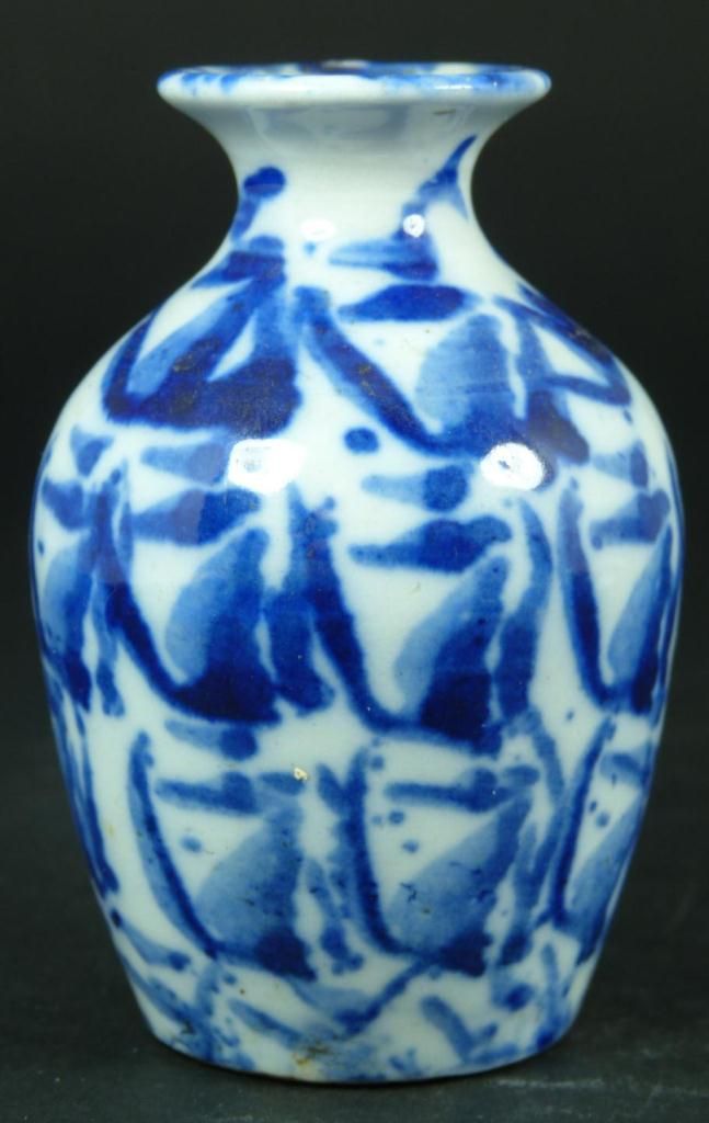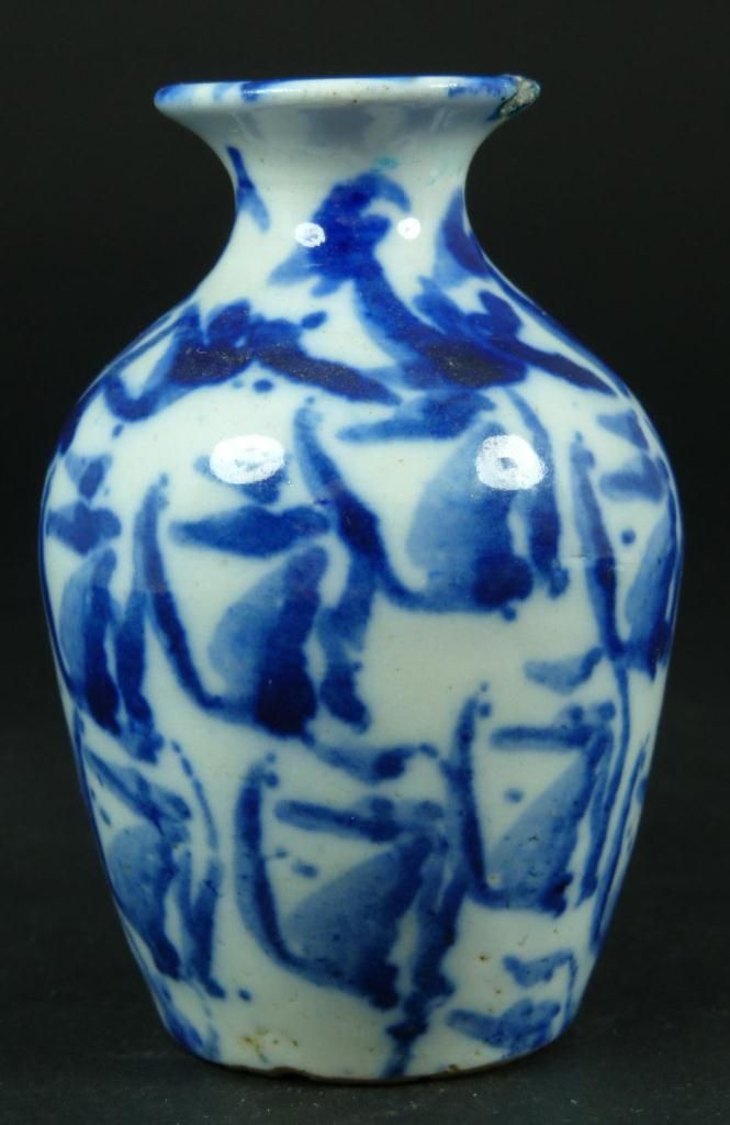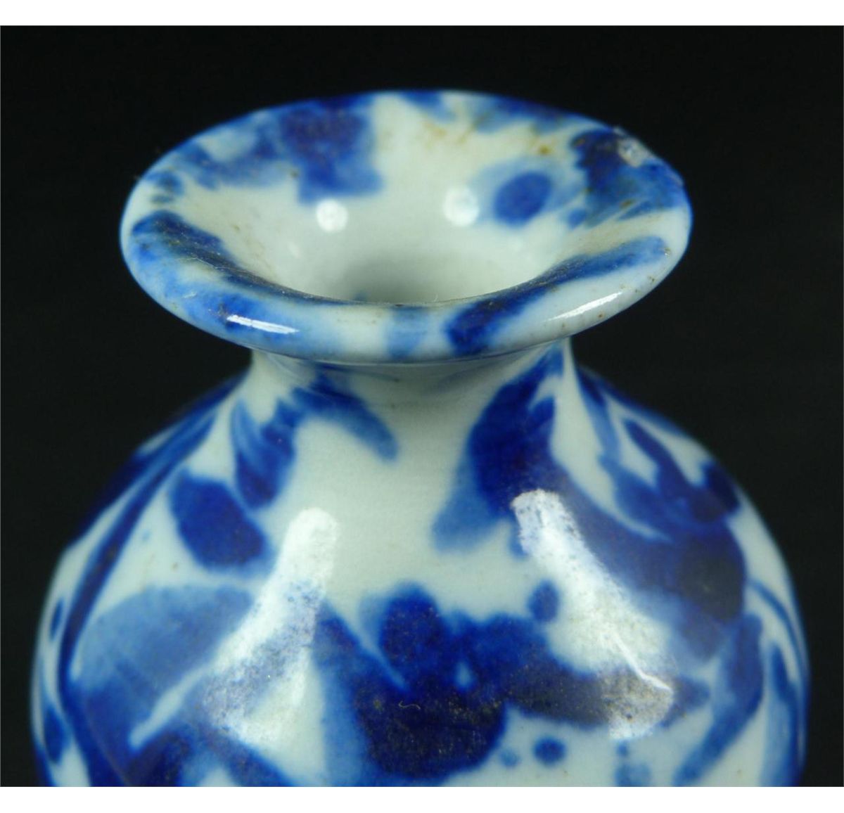 An 18th century miniature Chinese porcelain blue and white vase depicting monkeys throughout. Early to Mid Qing Dynasty period. Measures 3 1/16" height (8cm). Total weight of 85 grams.