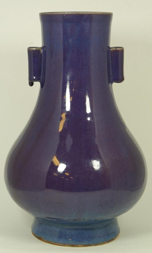 Antique Chinese purple glaze hu form vase. Brown bottom holding impressed four character archaic Yongzheng (1723-1735) reign marks, and is of the period. Measures 13 3/8" height x 9 1/4" diameter (33.9cm x 23.4cm). Total weight of 3.46 kilograms.