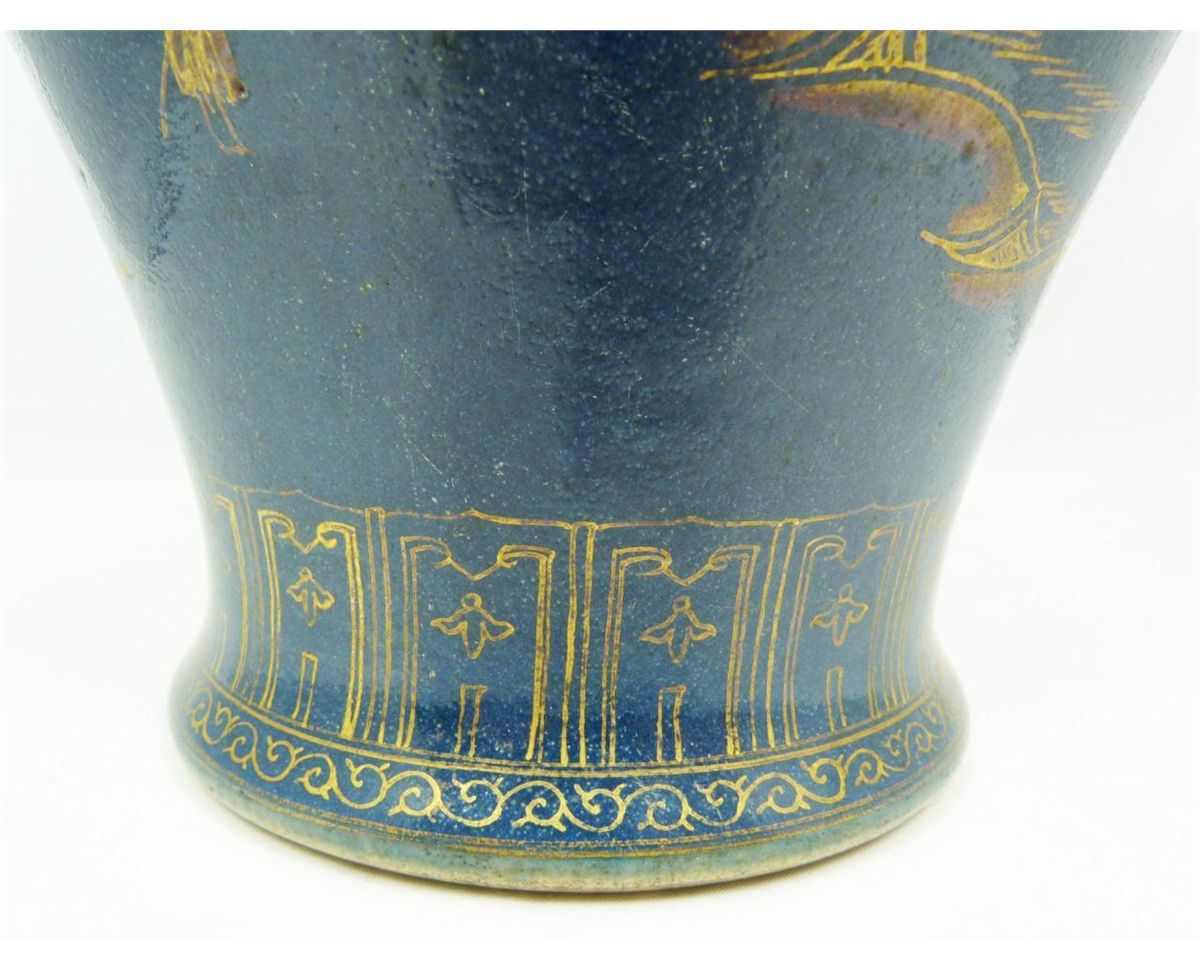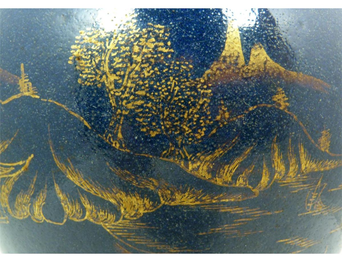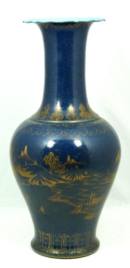 Antique Chinese blue and gold Qing Dynasty vase having Phoenix tail form. Has hand painted gold landscape scene over cobalt blue background. Has flared scalloped rim. Turquois interior and turquoise bottom. Holds Qianlong six character archaic reign marks to bottom. 18th/19th century. Measures 16" height x 8 1/4" height (40.6cm x 20.9cm). Total weight of 3247 grams.