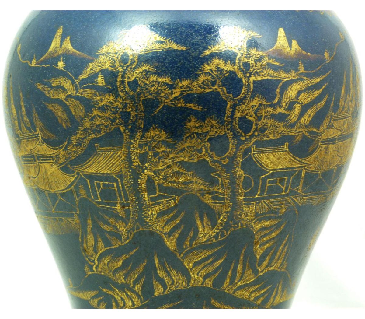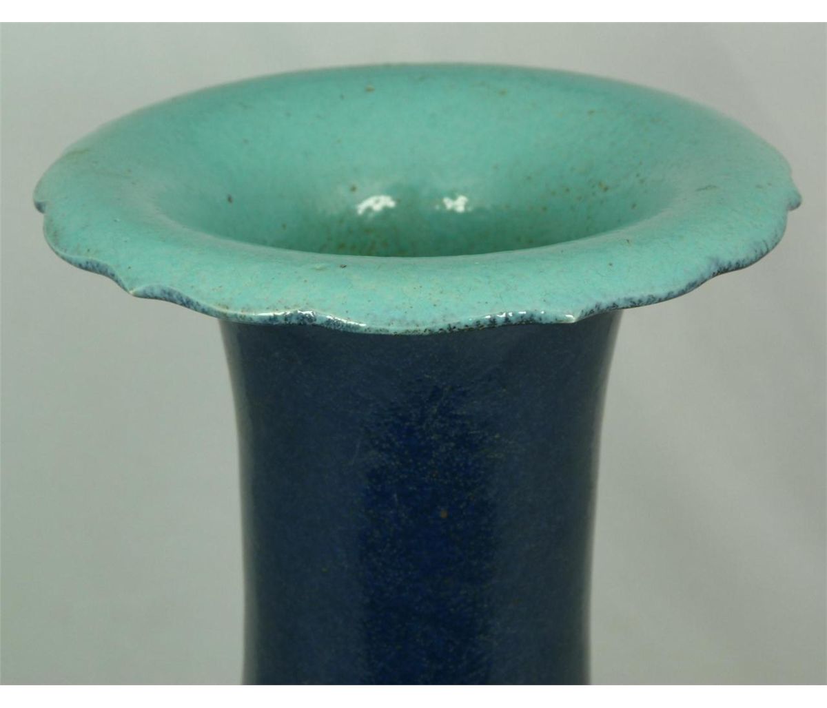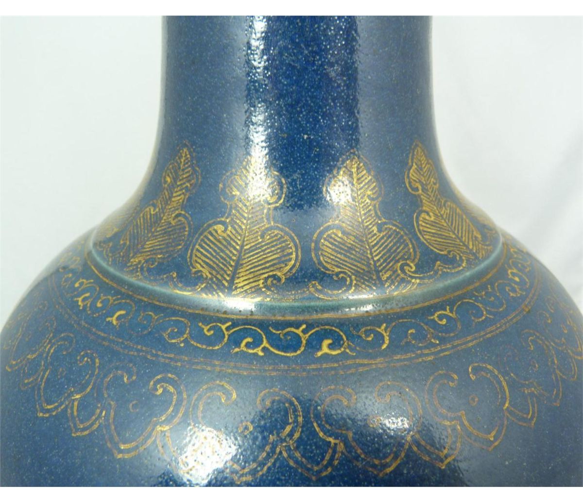 Antique Chinese blue and gold Qing Dynasty vase having Phoenix tail form. Has hand painted gold landscape scene over cobalt blue background. Has flared scalloped rim. Turquois interior and turquoise bottom. Holds Qianlong six character archaic reign marks to bottom. 18th/19th century. Measures 16" height x 8 1/4" height (40.6cm x 20.9cm). Total weight of 3247 grams.