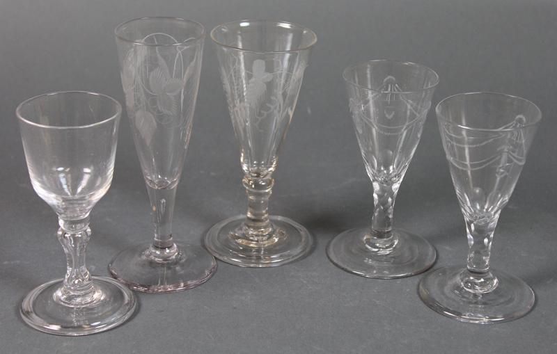 b) two piece beer glass, wheel cut trumpet shaped bowl, bubble stem, circa 1780.