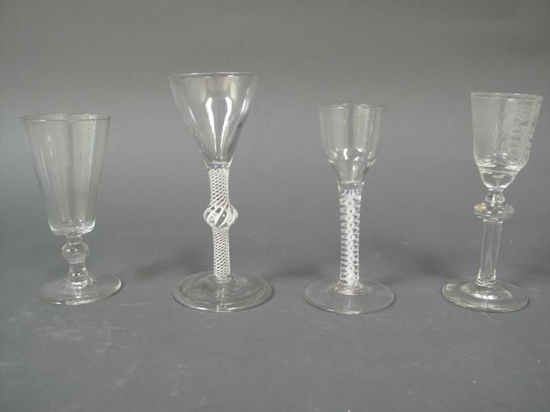 b) three piece wine glass, circa 1750, with opaque twist stem.
