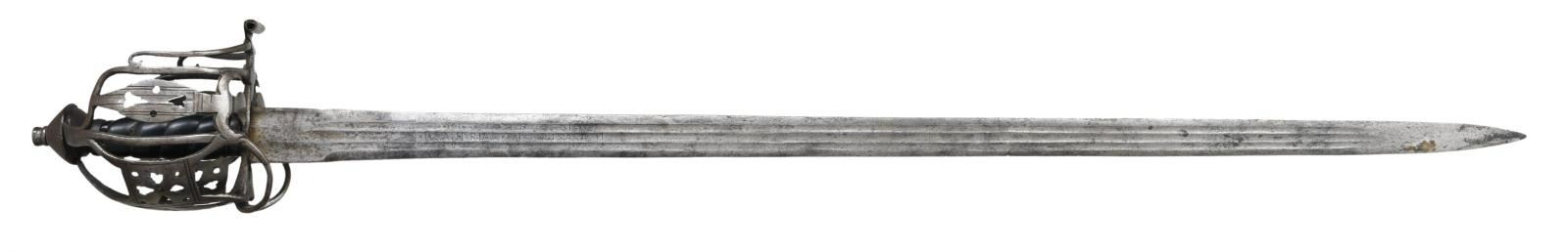 Overall length: 40 3/4". Blade length: 34 3/4". This sword likely dates between 1720 and 1760. The blade has a 29" triple fuller. The blade is marked on one side ">ISI> > I > >ISI> xIx ANDRIA xIxI FERARA xI >ISI> > I > >ISI>". The other side is marked in a similar manner but is worn and not as easy to discern. Hilt generally appears to be done in the Glasgow style and is of full basket form. Cone shaped pommel with incised lineal decoration. Grip appears to be ebony & spirally fluted. No scabbard. CONDITION: blade has a light gray lightly mottled patina. Hilt appears undamaged, though likely cleaned. The grip is quite solid but missing the wire wrap. (02-17915/BF). $2,000-2,600.