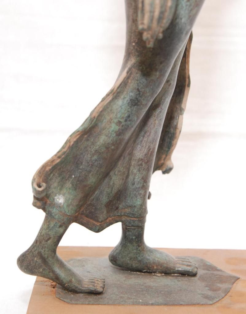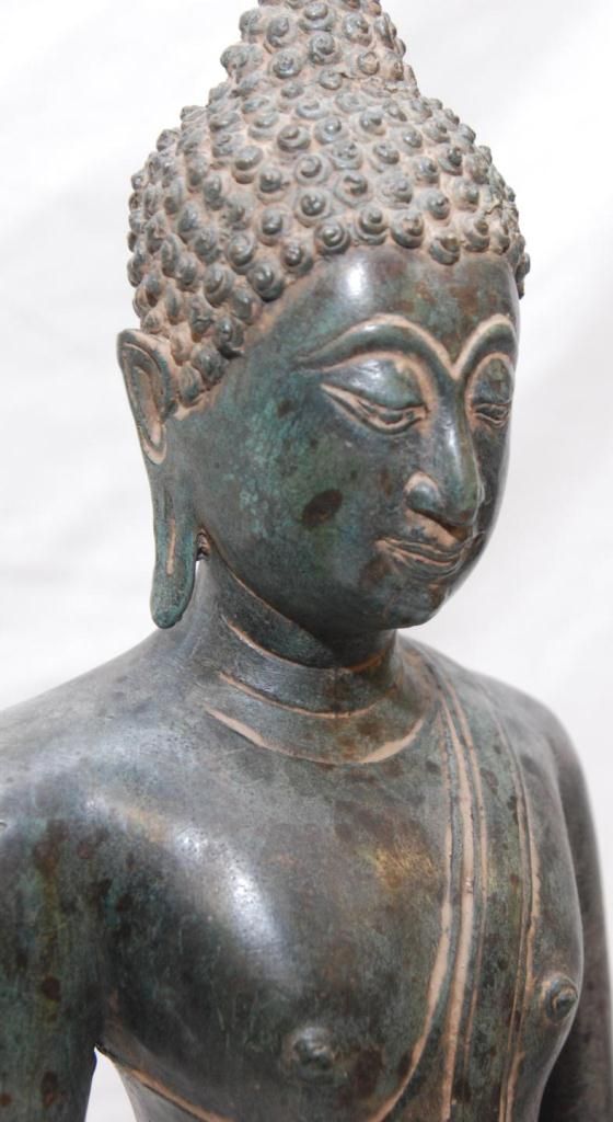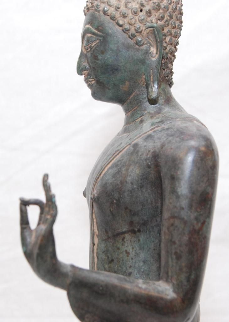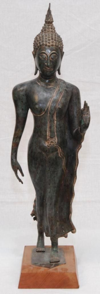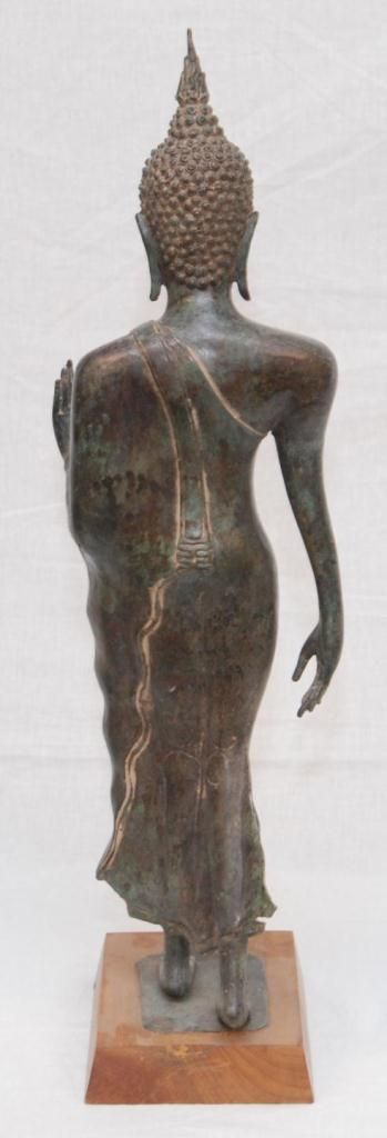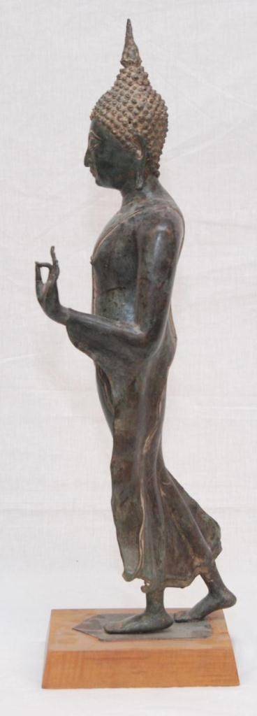 An antique Thai walking Buddha. Mounted on wooden base. Circa late Ayutthaya to Rattanakosin period. Measures 25" height + 1 1/2" base height (63.5cm + 3.8cm). Total weight of 6.34 kilograms.