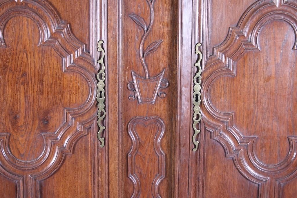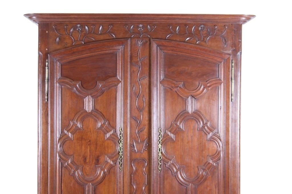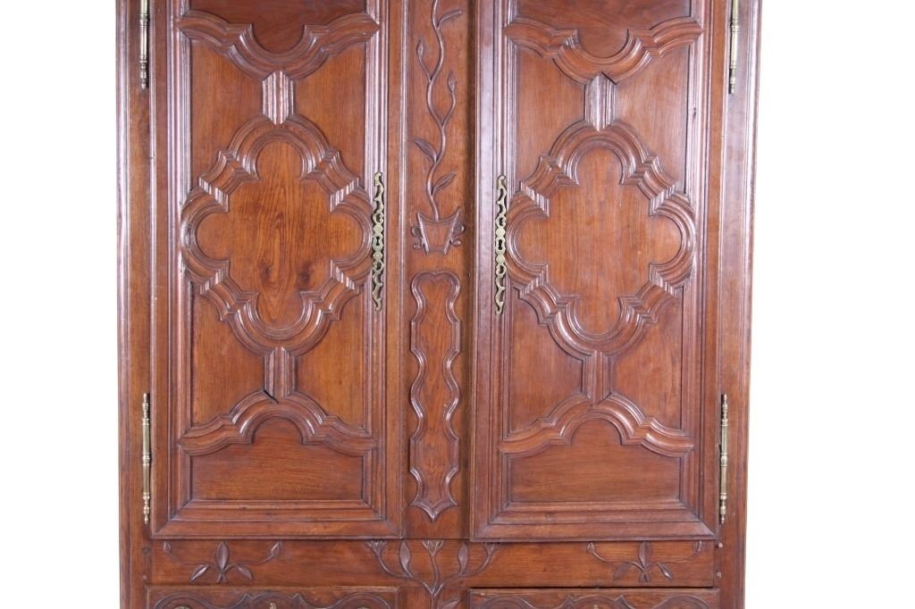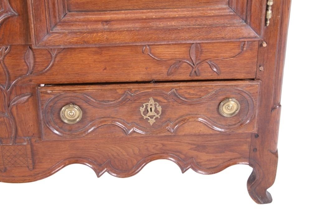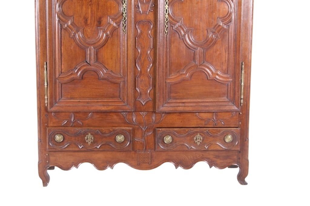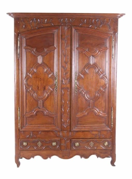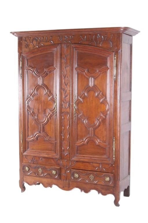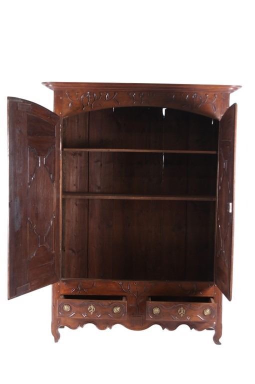 For your consideration is a Rare Late 18th / Early 19th Century French Provincial Louis XV Carved Walnut Armoire. A fine example of 18th-century French craftsmanship and sophistication, ideal for collectors and interior enthusiasts seeking timeless elegance. Louis XV style is the epitome of French furniture at its finest. The eighteenth century is considered the Golden age of French furniture. It was during this time that the most refined and beautiful Royal furniture was made in the busy Paris workshops of Europe's elite cabinet makers. Rococo motifs are central to Louis XV furniture design. These include C-scrolls, S-scrolls, acanthus leaves, rocaille (shell-like) patterns, and pastoral scenes. These elements were used to create a sense of movement and natural beauty, often giving the furniture a light, almost whimsical appearance. The armoire features two wonderfully carved large swingout locking doors open to a spacious storage area with two shelves, oversized brass hinges and large decorative openwork brass escutcheons. The face of the armoire has vine-inspired floral carvings vertically and horizontally. The two lower drawers are nicely carved, brass pulls and escutcheons. Serpentine carved apron flows into cabriole legs. Recessed side panels feature serpentine carved aprons. Excellent quality with superb craftsmanship, the armoire is in wonderfully preserved condition. Measures 68"W x 95"H x 24"D, weight is 341 lb.