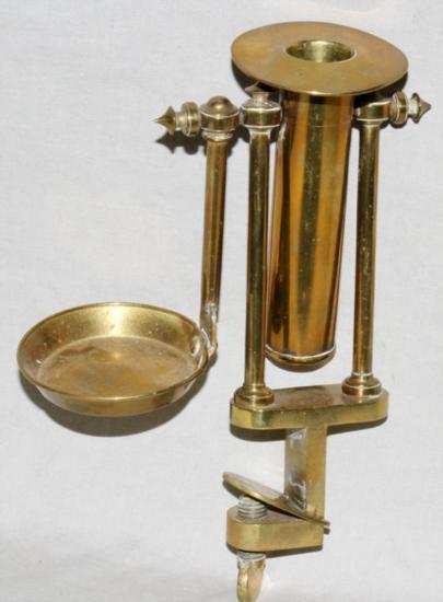 18th century ANTIQUE BRASS CANDLESTICK WITH CLAMP, H 7":On a gimbal to allow to swing. Candle drip pan. From the estate of Elsie Epstein