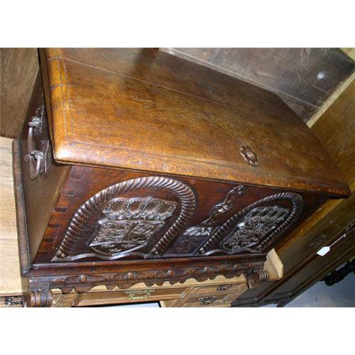<table width="100%" border="0" cellspacing="0" cellpadding="4"><tr><td><em> </em></td></tr><tr> <td width="100%"> Dated 1792 Carved Oak trunk with the royal seals of Denmark, Norway and Sweeden