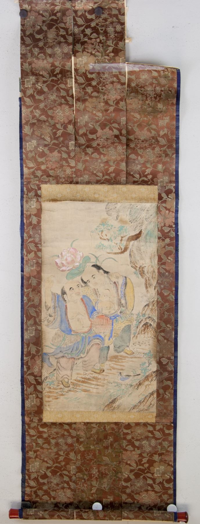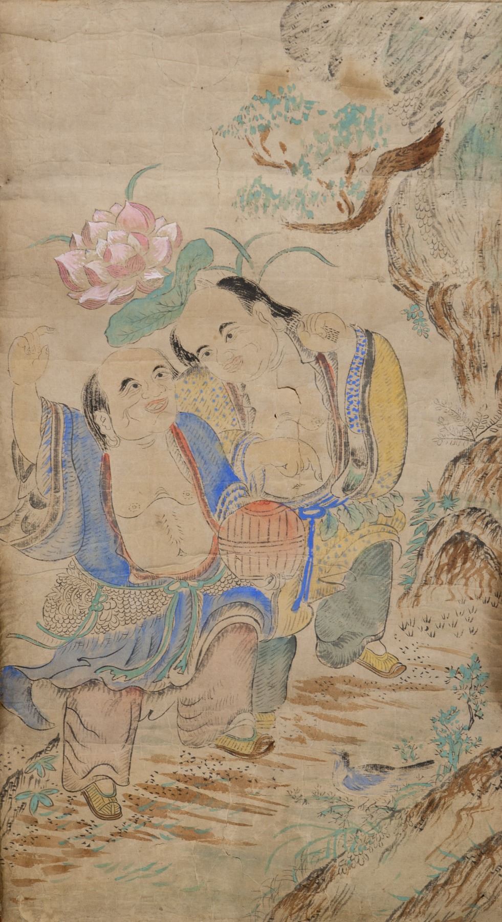 Painting of two immortals; Chinese ink and watercolour on paper; hanging scroll; 18th century; 52.5 x 29 cm. PROVENANCE: Private American collection. Collection accumulated since 1945 in Japan and China; found in basement after his passing.