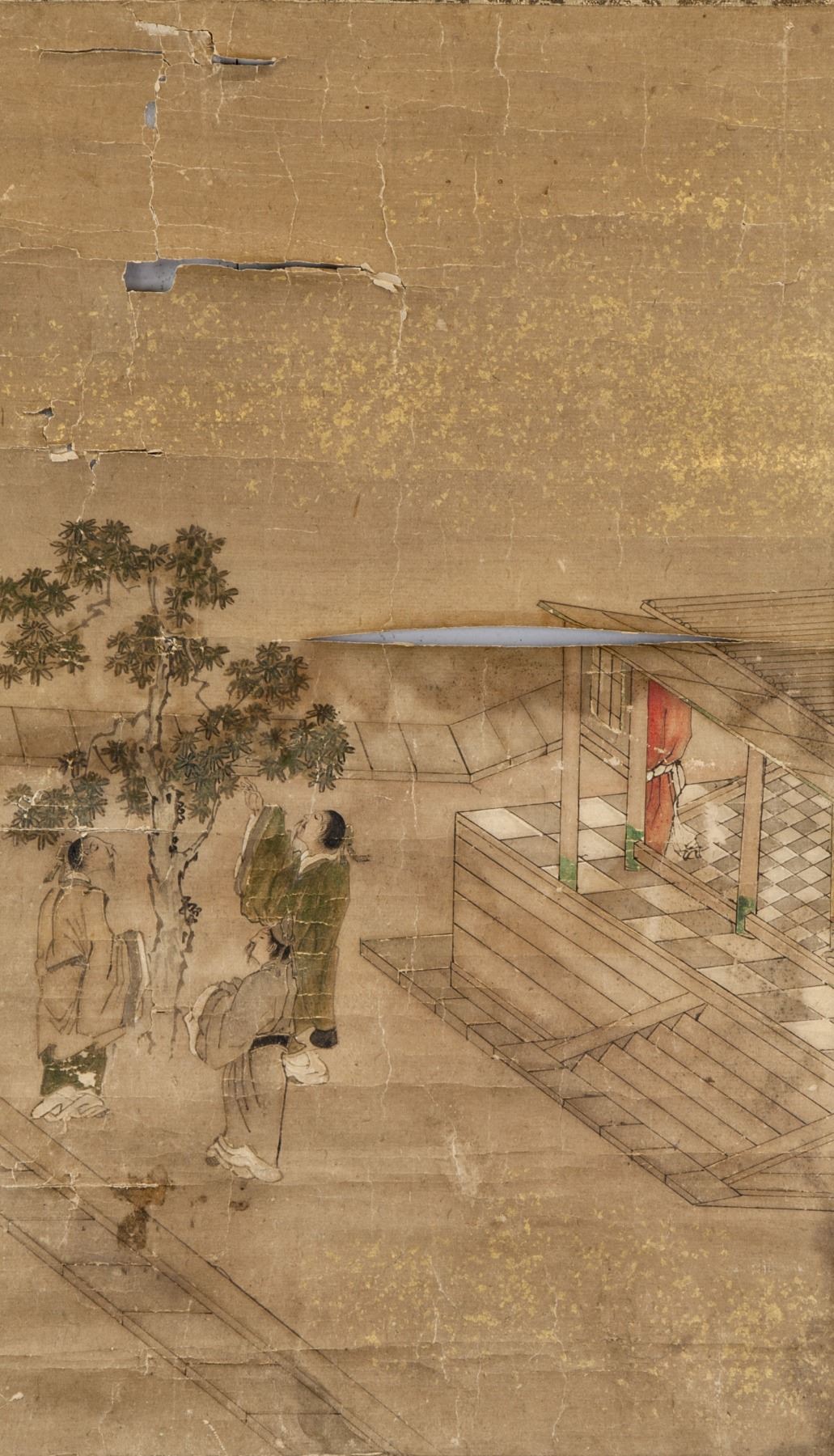 Ink and watercolor on paper roll. Featuring gathering scene. Circa 18th century. 53 x 30 cm. Provenance: Part of an Estate Sale Toronto
