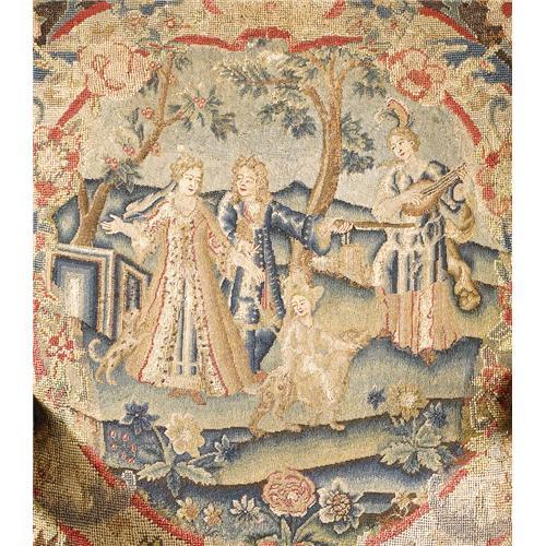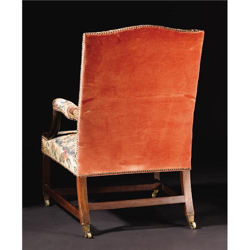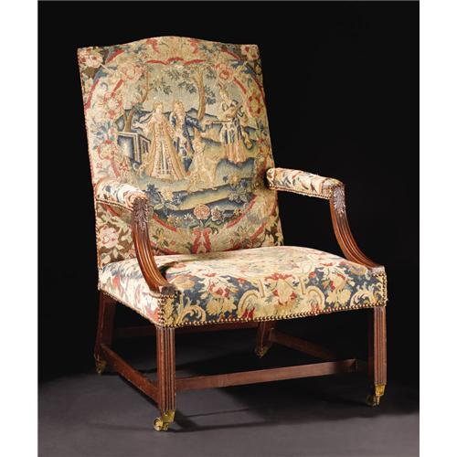 <B>An Eighteenth Century English Mahogany Open Armchair</B></I><BR><BR>Unknown maker, English<BR>Eighteenth Century<BR>Mahogany<BR>Unmarked<BR>42 inches high x 26 inches wide x 30 inches deep<BR><BR>With original tapestry upholstery depicting figures in a landscape with carved fluted supports at arms and sitting atop straight, reeded legs.<BR><BR> <B>Condition Report:</B> Castors appear to be added.<BR><BR><b>Shipping:</b> Requires 3rd Party Shipping (<a target="_blank" href="http://www.heritageauctions.com/common/shipping.php">view shipping information</a>)