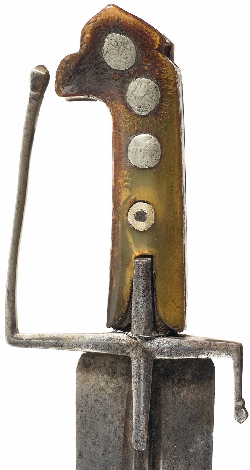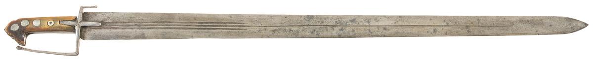 Straight double edged blade, 34" long with triple fullers on each side and no visible makers marks. The guard is fitted with a pair of 2 3/4" long bar languets, with a short rear quillion bent 90 degrees upward and a long front quillion/ knuckleguard which almost reaches the pommel. Grip is multicolored horn, secured with an iron bolt and German silver escutcheons, accented with three circular pewter panels on each side, and ending in a flared pommel.