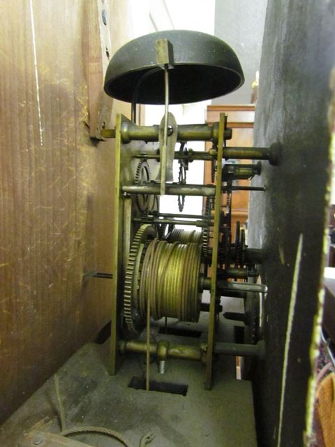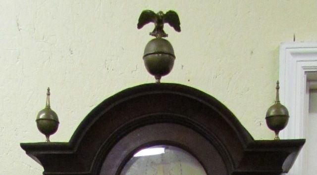 18th Century Grandfather Tall Case Clock, arch top with original Brass Eagle & 2 Brass Balls on either side; original hand painted Face with second hand and date dial - key, weights and pendulum, working condition - great case in patina condition brass works