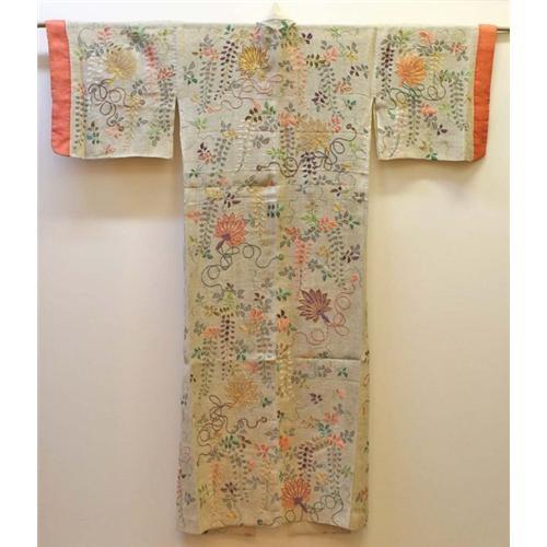 A important Rare 18th Century Noh Theater Robe. This extraordinary silk embroidered example of a summer production Noh Robe has a design of Wisteria, Fans and Ropes, and exquisitely captures the art of Noh. 63.5 inches (161.5cm) height x 52 inches (132 cm) width. Excellent Condition. From a prominent and widely exhibited collection.