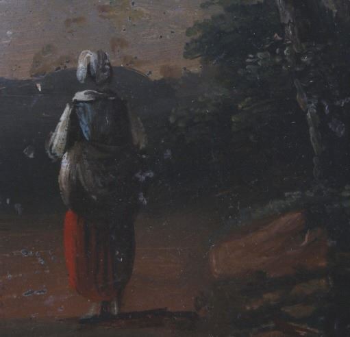 The lot features an original work of art oil on tin from the 18th Century and shows a fine Late Renaissance style most likely from Southern Europe. The painting, which shows an unbelievable detail and skill, show a lone woman walking a forest path wearing a red long skirt. Along the path is a large set of trees and in the distance, rolling hills. The work of art has been mounted to an early gilt gold wood frame. The measurements of the tintype are 9 3/4" x 7".