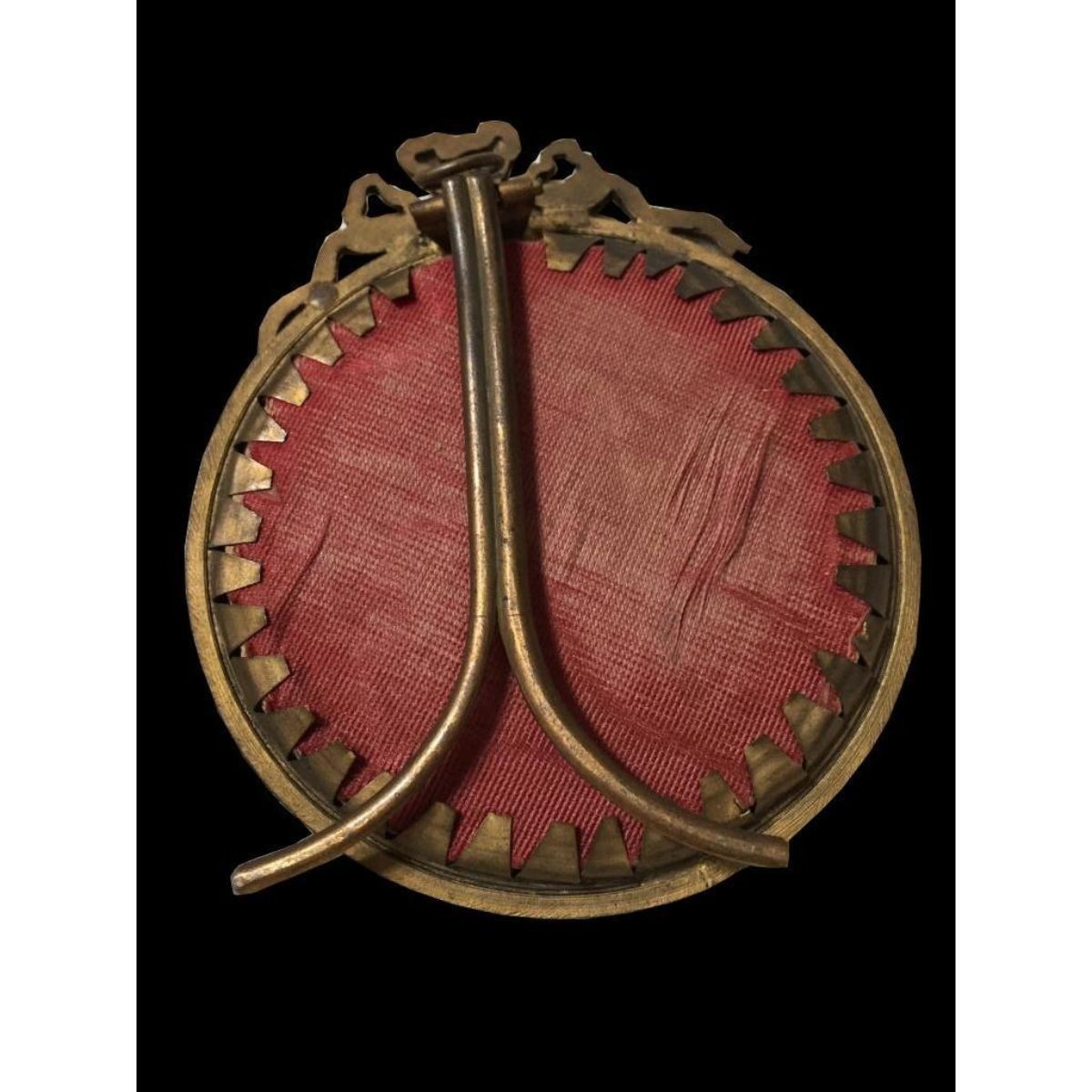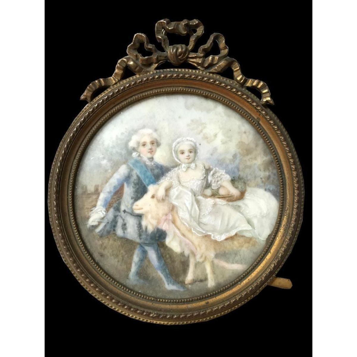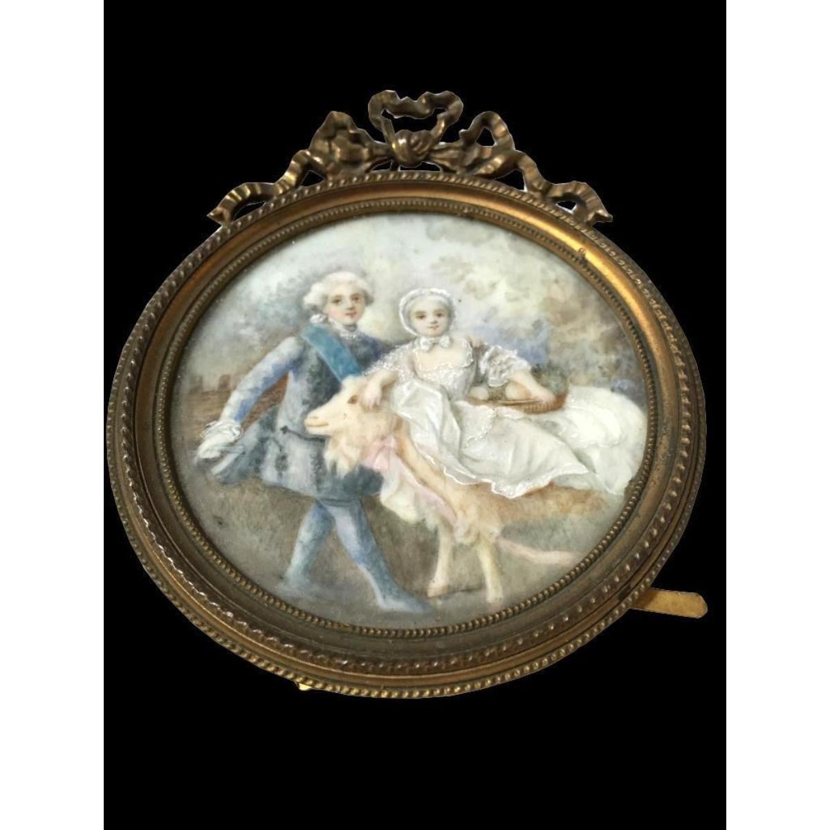 18th-century miniature painting on porcelain of two children with a goat, under glass in an ornate gilt metal, easel pattern, frame. 3 1/4" W X 3 3/4" H frame. Additional metal loop attached to back for hanging.