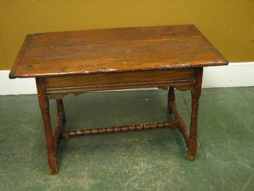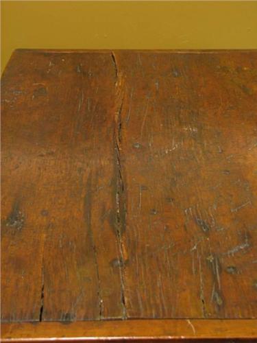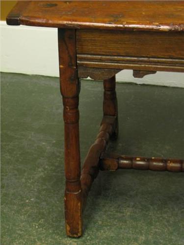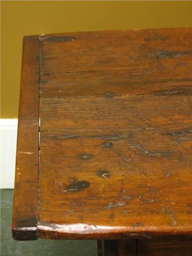Circa 1750-1775 New England Tavern Table. Features single board breadboard overhanging top, pegged joints, scalloped edge apron, block and turned legs with similar H-stretchers. Condition: splits in top, imperfections. Dimensions: 23.5"H x 40.5" x 24.5".