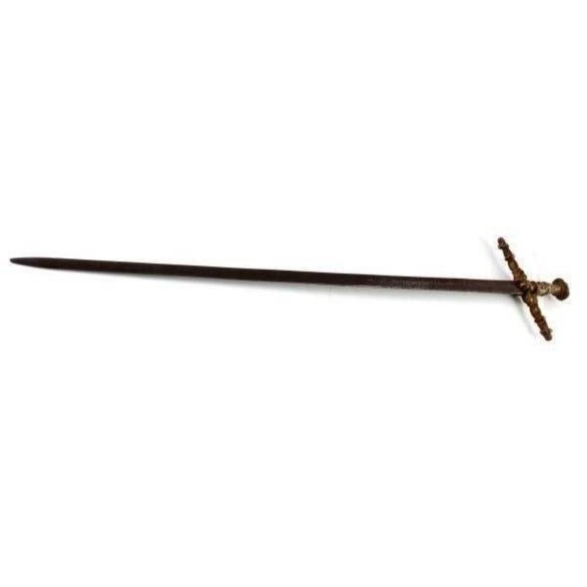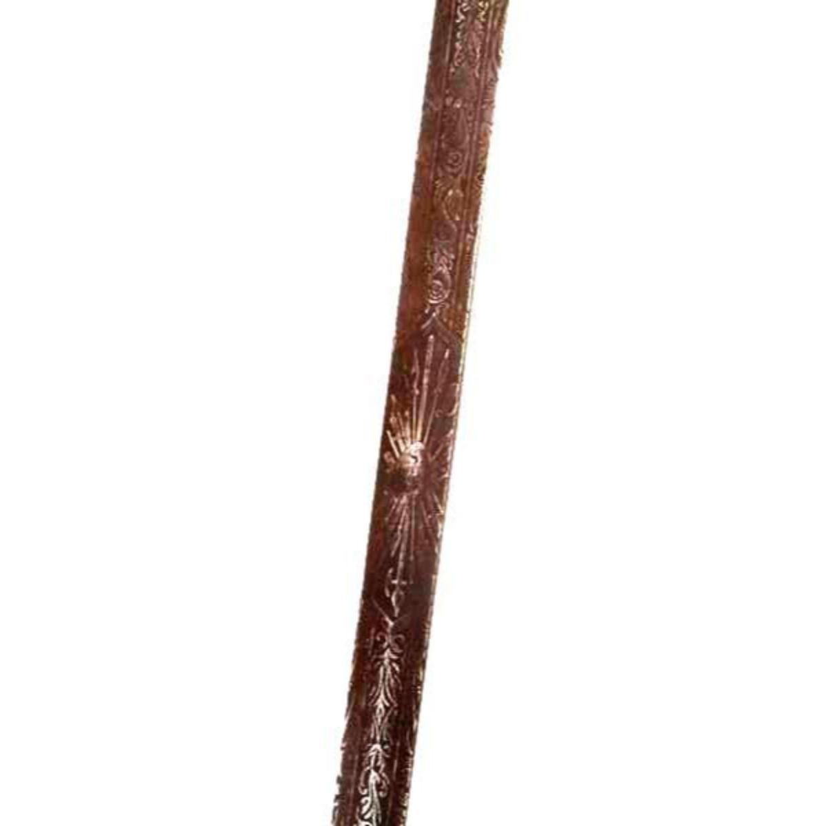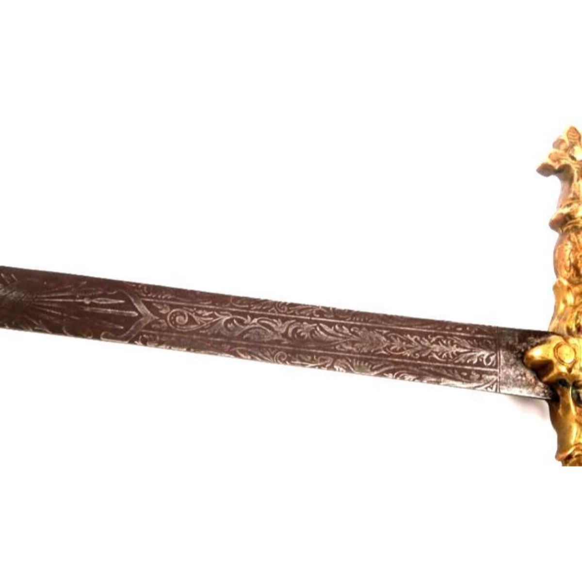 Heavy but balanced brass grip, patinated, dark but very well etched blade, thick not finished edge, has a monogram that appears to read PLS. Measures 41".Â