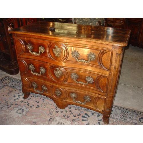 This rare 3 drawer, Louis XV style chest of drawers with Regence style bronze hardware is in wonderful condition for its age. It has a restrained curved frontage with moldings emphasizing the shapes of the drawers and the apron. The entire piece is made of solid walnut wood. The drawer fronts were all hand carved from one solid piece of walnut wood. The back feet are straight while the front feet are gently curvved with the usual wear to the bottom of the feet.