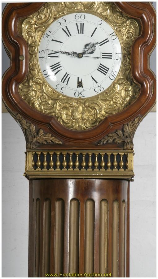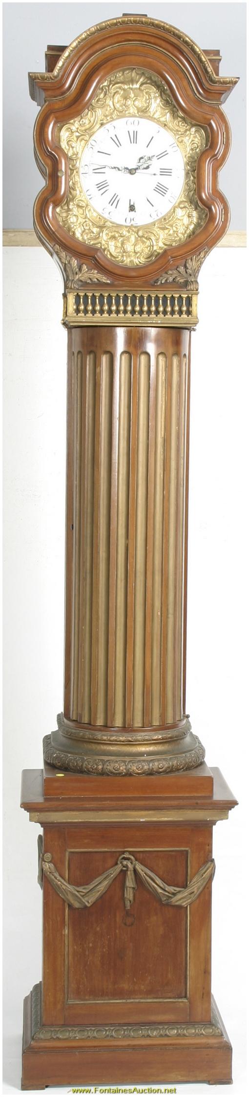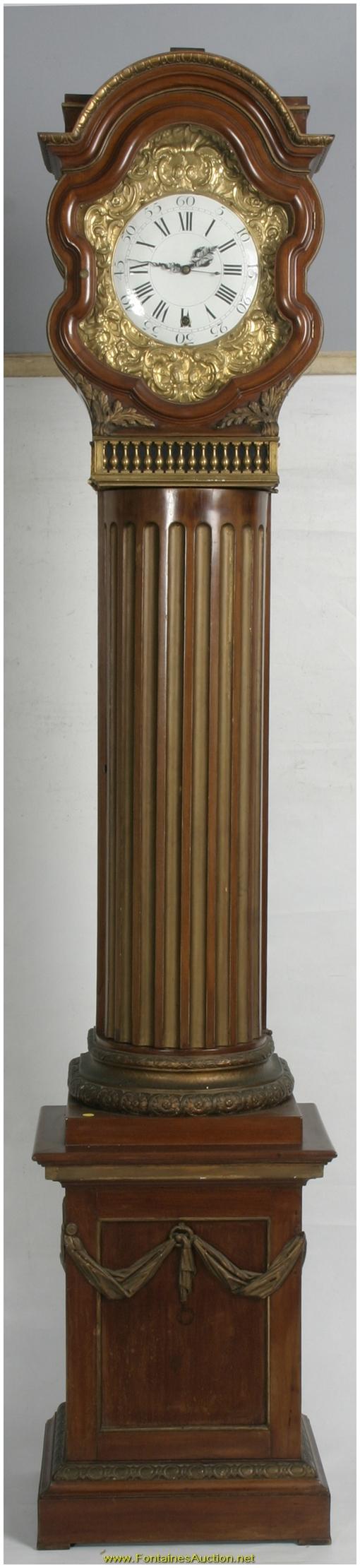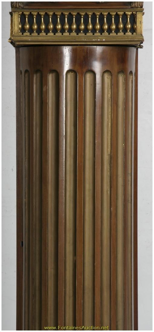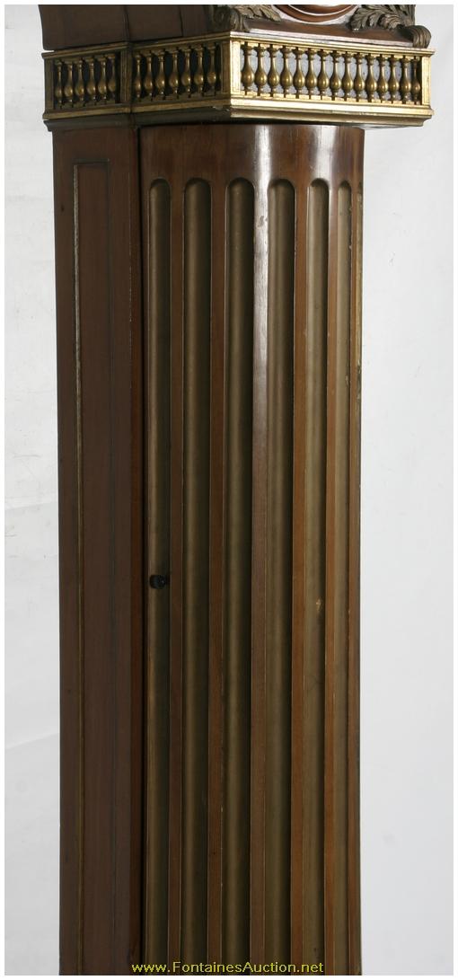 18th Century Xaveri Liebherr Column Case Clock. Fine pierced black hands, enameled dial with black Roman hour numerals on the chapter ring and Arabic 5 minute numerals outside; gilt repousse tortoise shaped bezel; high quality brass weight driven movement (Noted by consignor as 400 Day), quarter hour grande sonnerie strikes on 2 bells, separate repeater mechanism, unusual paddle lever style escapement, has oversized decorative posts and etched back plate, signed "Xacveri Liebherr - 1777 Immenstadt"; brass starburst pendulum bob on steel stick, high quality brass pulley, replaced weight. In an early mahogany half column case, turtle style bonnet with gilt brass trim and lower gallery, large fluted half column door on a square base pedestal with brass drapery. 19.5"W x 96"H x 14.5"D. Estimated Value$8,000 - 12,000.