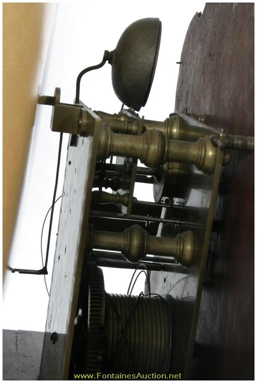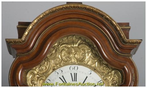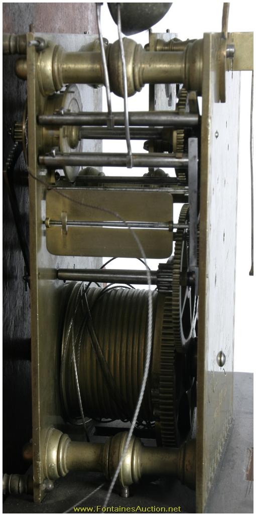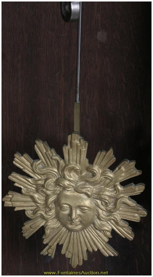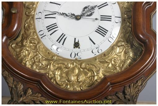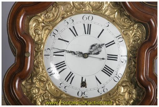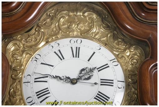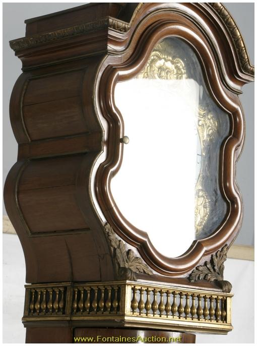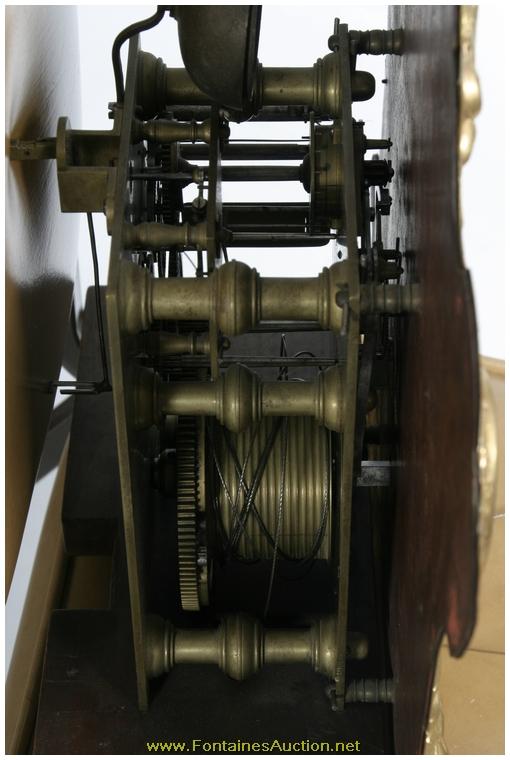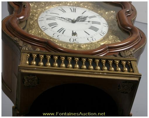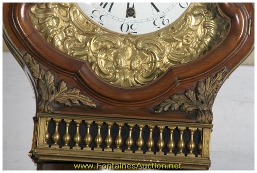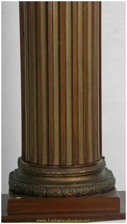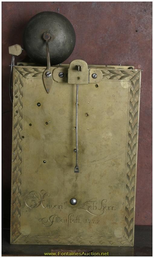 18th Century Xaveri Liebherr Column Case Clock. Fine pierced black hands, enameled dial with black Roman hour numerals on the chapter ring and Arabic 5 minute numerals outside; gilt repousse tortoise shaped bezel; high quality brass weight driven movement (Noted by consignor as 400 Day), quarter hour grande sonnerie strikes on 2 bells, separate repeater mechanism, unusual paddle lever style escapement, has oversized decorative posts and etched back plate, signed "Xacveri Liebherr - 1777 Immenstadt"; brass starburst pendulum bob on steel stick, high quality brass pulley, replaced weight. In an early mahogany half column case, turtle style bonnet with gilt brass trim and lower gallery, large fluted half column door on a square base pedestal with brass drapery. 19.5"W x 96"H x 14.5"D. Estimated Value$8,000 - 12,000.