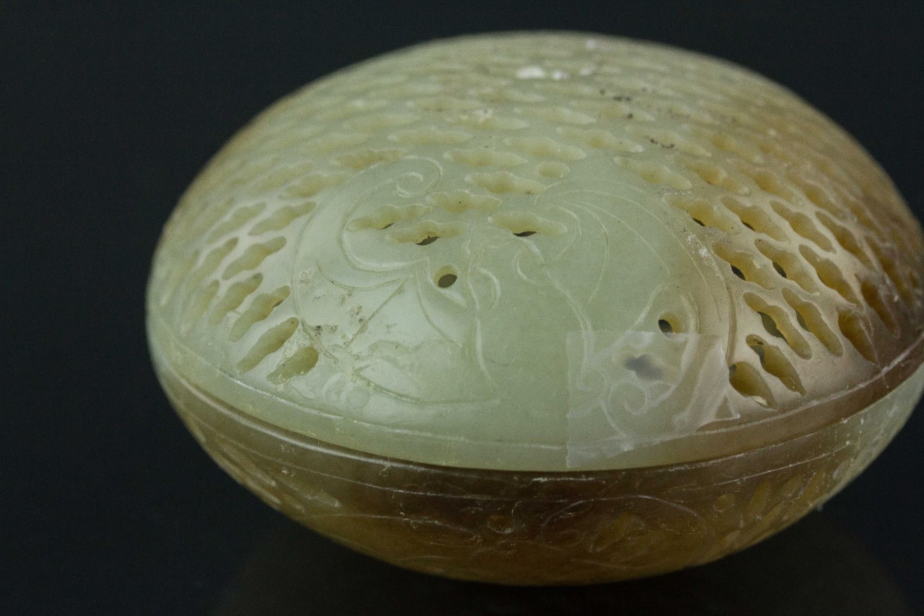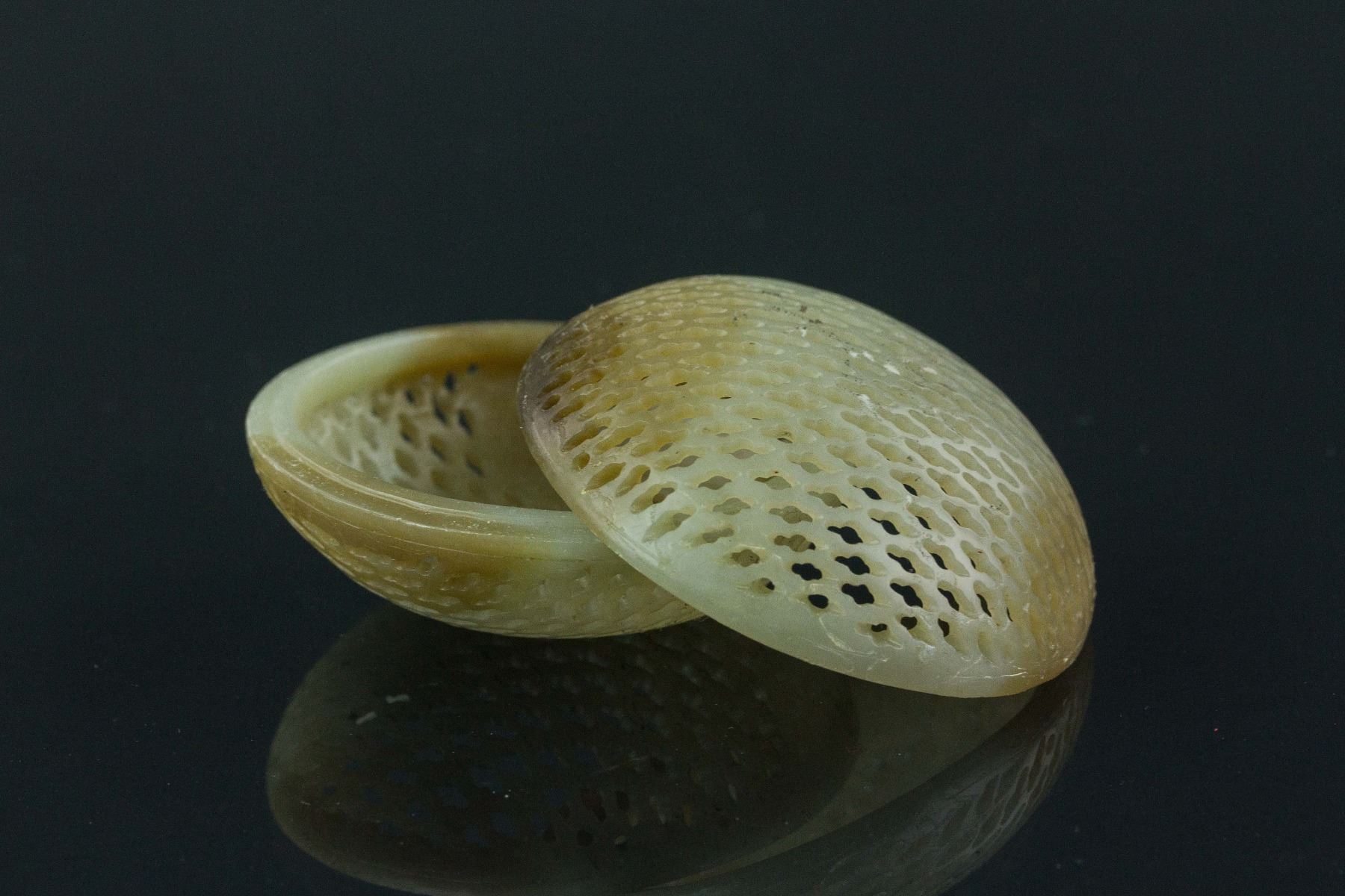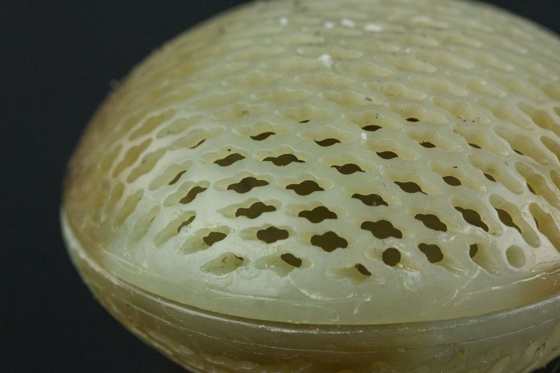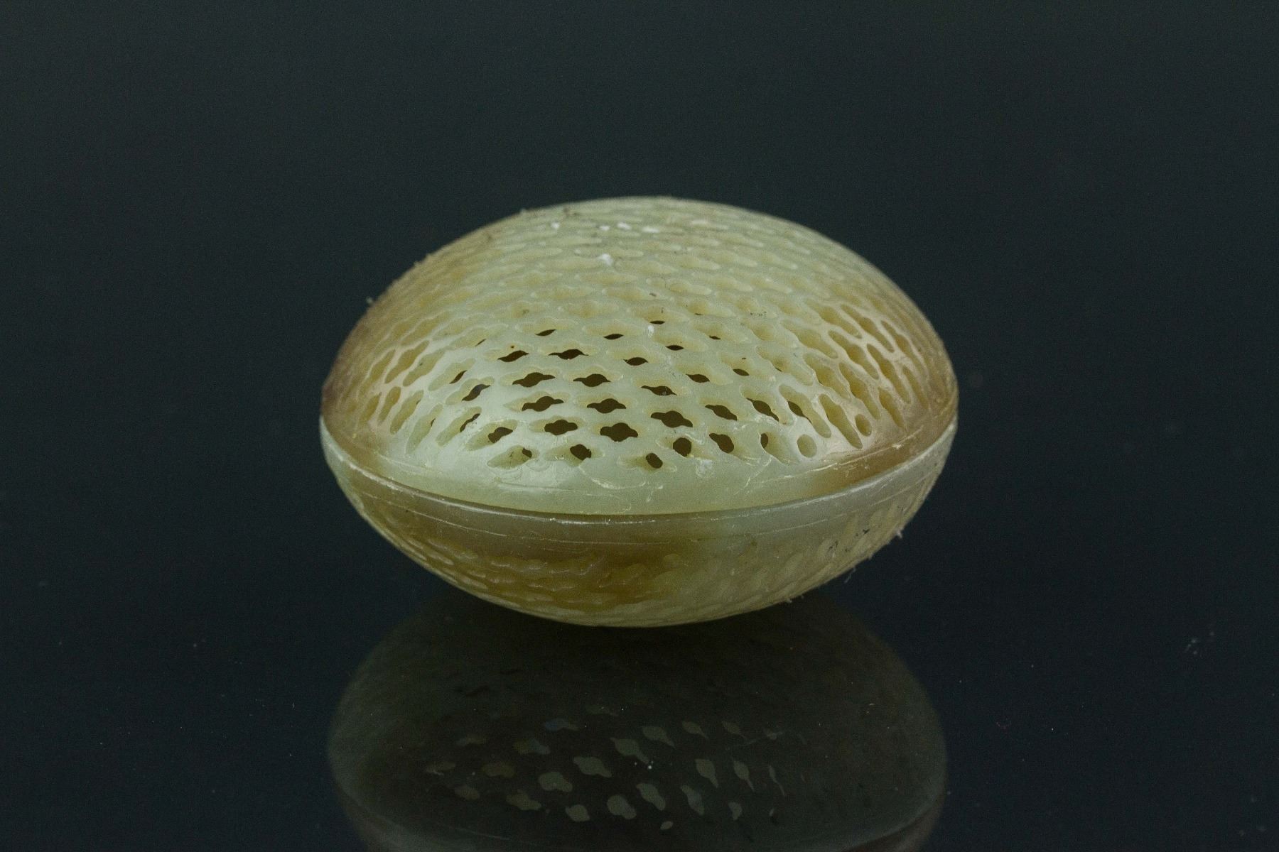 18th century Chinese fine Hetian jade reticulated parfumiere; incised with bats against openwork carved trellis ground; the stone of pale celadon tone with russet inclusions; H: 3.5 cm, W: 6 cm, 48 grams