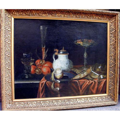 Outstanding work , Still life , by unidentified master , the transparencies , metal tray and fishes and every detail in this work are revealing a Master Artist, however the work is not signed , according to the wood frame ,condition , and style, we know this is a end of 18th painting, Measures without the Frame 27 x 36 inches ( 70 x 92 cm), Most interesting is the backside metal plaque in Cyrillic letters, 3 letters and dots, followed by several smaller Russian inscriptions are probably indicating this piece belonged to Imperial Russian Museum. Better pictures available under request.