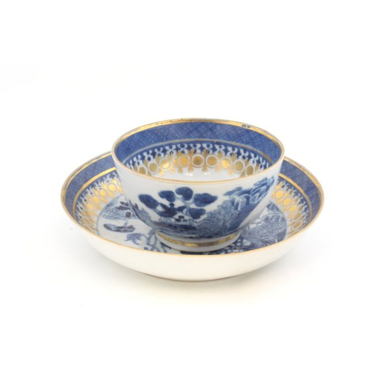 Blue Willow with gilt. Cup approx. 2" H x 3 3/8" W, saucer 5.5" Diam. Please read our terms of sale.