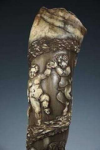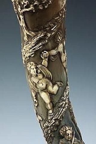 EARLY HUNTING HORN - 18th c. Carved European Hunting Horn, probably German, from an Ox horn, carved with spiral rank of dancing Putti, ending with an ancient elm, in the form of a 'Horn-of-Plenty' or Cornucopia, with Dragon-form tip and fluted opening.