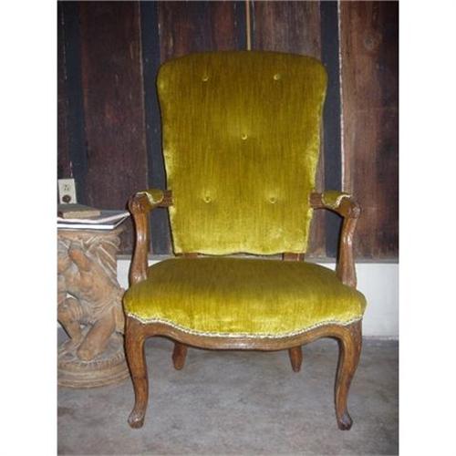 18th c French Louis 15th fauteuil arm chair carved oak covered in a green silk velvet and Houles guimpe. Height 41" wide 24" depth 16" 1/2. This Chair is located in New Orleans Louisiana